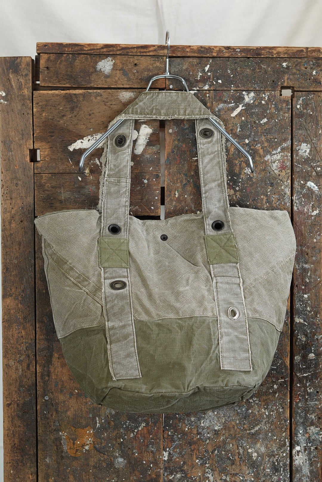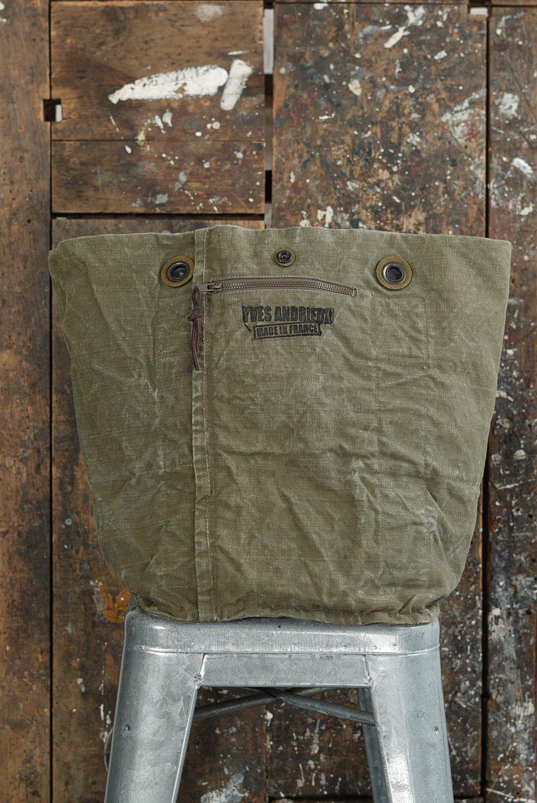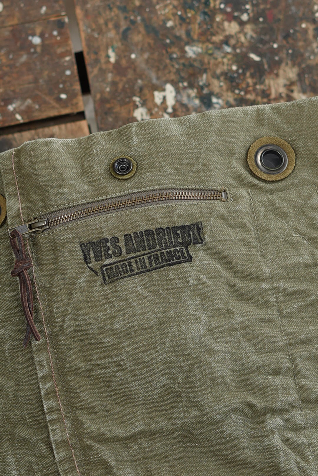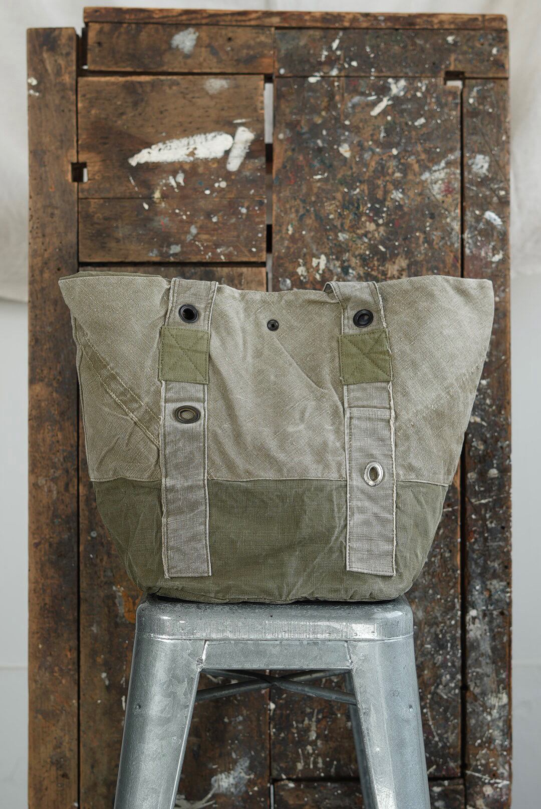 "VINCENT JALBERT"のパートナー、YVES ANDRIEUXの手掛けるアイテム。上部にフレンチアーミーリネン、下部にアーミーコットンを用い、ファブリックのコントラストを楽しめるデザイン。ウォッシュを施し、褪色を促した表情深いツラ構えです。ストラップ部分には、フレンチミリタリーアイテムに使用される真鍮のハトメをデコレーション。これらのパーツは経年加工を施した物を使用しておりブラス~ブラック~ニッケルと色の移り変わりをデザインに活かしています。上部はスナップボタン留め。内側にもバキバキのアーミーコットンファブリックを用いたフルライニング仕様。ジップ付きの実用的なポケットが備わります。スタンプ入り。AD2005。