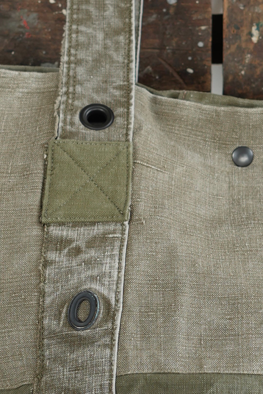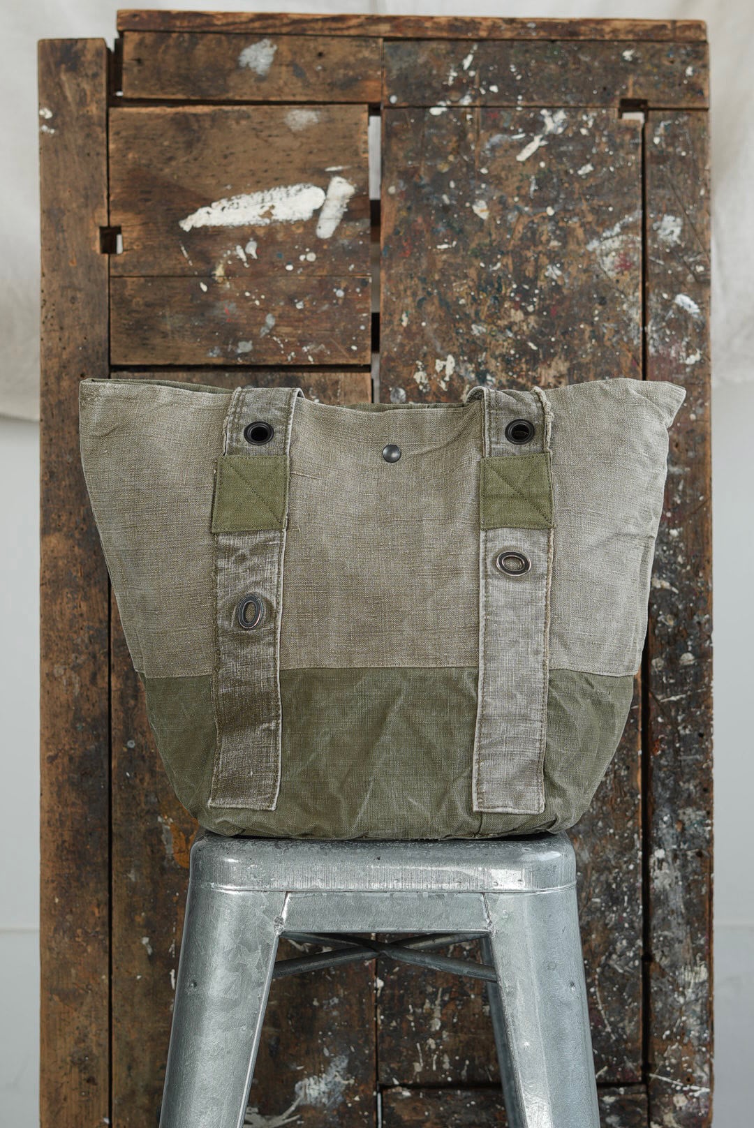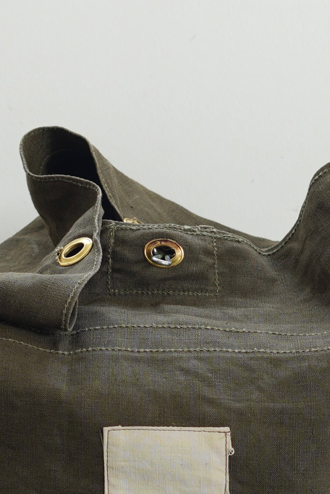 "VINCENT JALBERT"のパートナー、YVES ANDRIEUXの手掛けるアイテム。上部にフレンチアーミーリネン、下部にアーミーコットンを用い、ファブリックのコントラストを楽しめるデザイン。ウォッシュを施し、褪色を促した表情深いツラ構えです。ストラップ部分には、フレンチミリタリーアイテムに使用される真鍮のハトメをデコレーション。これらのパーツは経年加工を施した物を使用しておりブラス~ブラック~ニッケルと色の移り変わりをデザインに活かしています。上部はスナップボタン留め。内側にもバキバキのアーミーコットンファブリックを用いたフルライニング仕様。ジップ付きの実用的なポケットが備わります。スタンプ入り。AD2005。