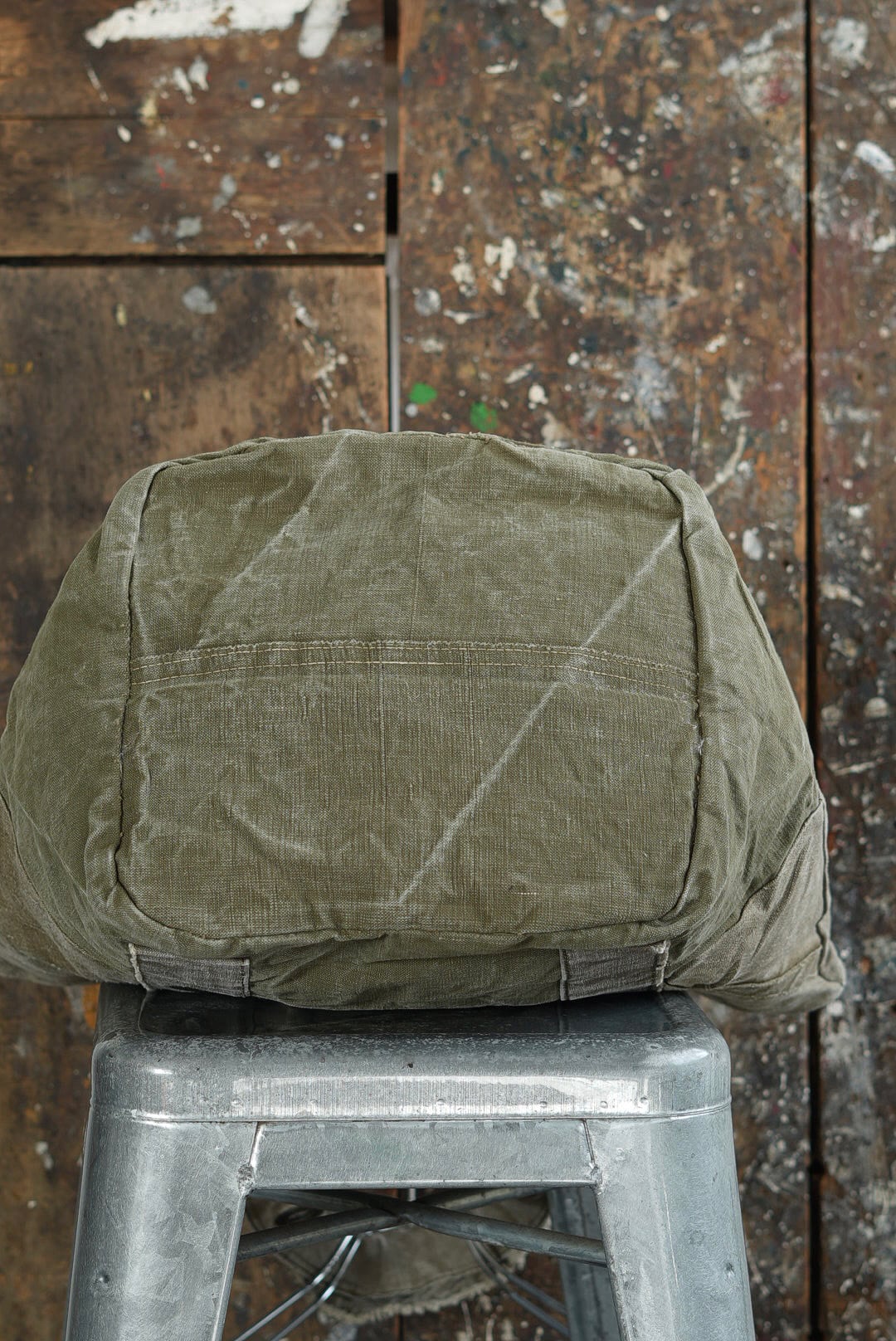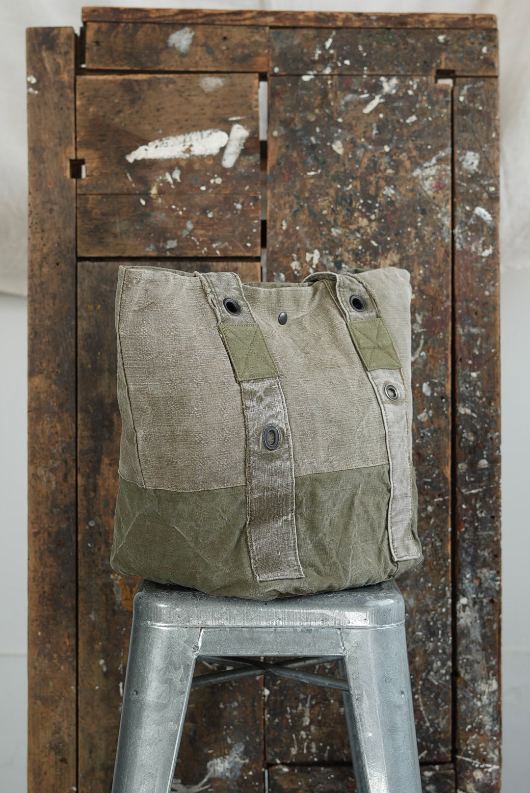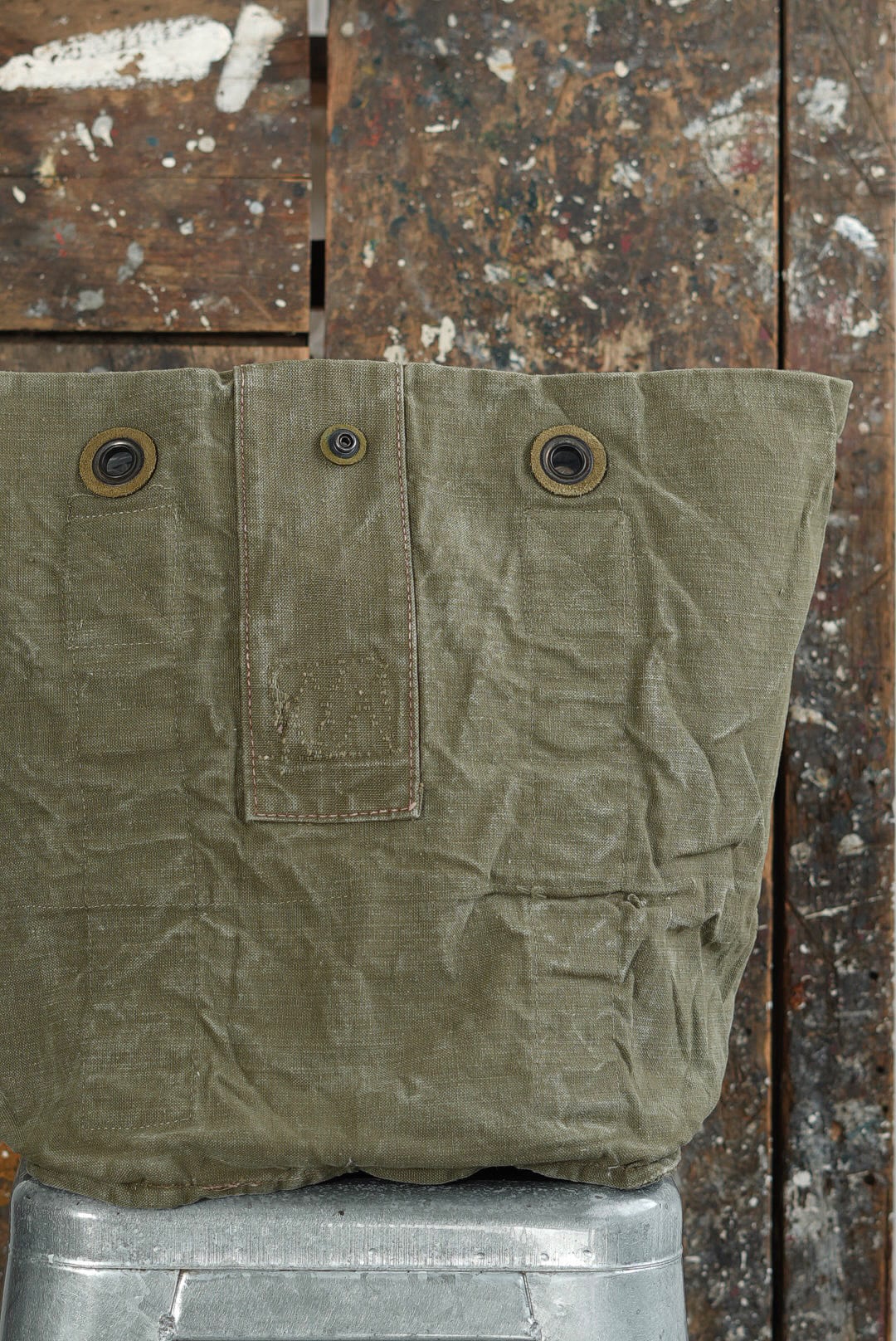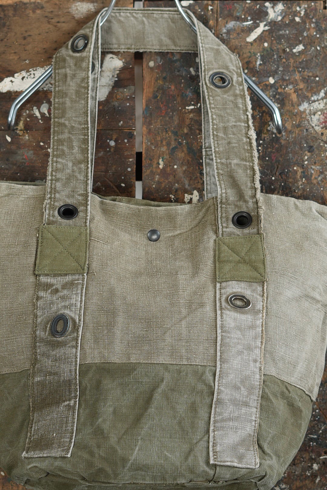 "VINCENT JALBERT"のパートナー、YVES ANDRIEUXの手掛けるアイテム。上部にフレンチアーミーリネン、下部にアーミーコットンを用い、ファブリックのコントラストを楽しめるデザイン。ウォッシュを施し、褪色を促した表情深いツラ構えです。ストラップ部分には、フレンチミリタリーアイテムに使用される真鍮のハトメをデコレーション。これらのパーツは経年加工を施した物を使用しておりブラス~ブラック~ニッケルと色の移り変わりをデザインに活かしています。上部はスナップボタン留め。内側にもバキバキのアーミーコットンファブリックを用いたフルライニング仕様。ジップ付きの実用的なポケットが備わります。スタンプ入り。AD2005。