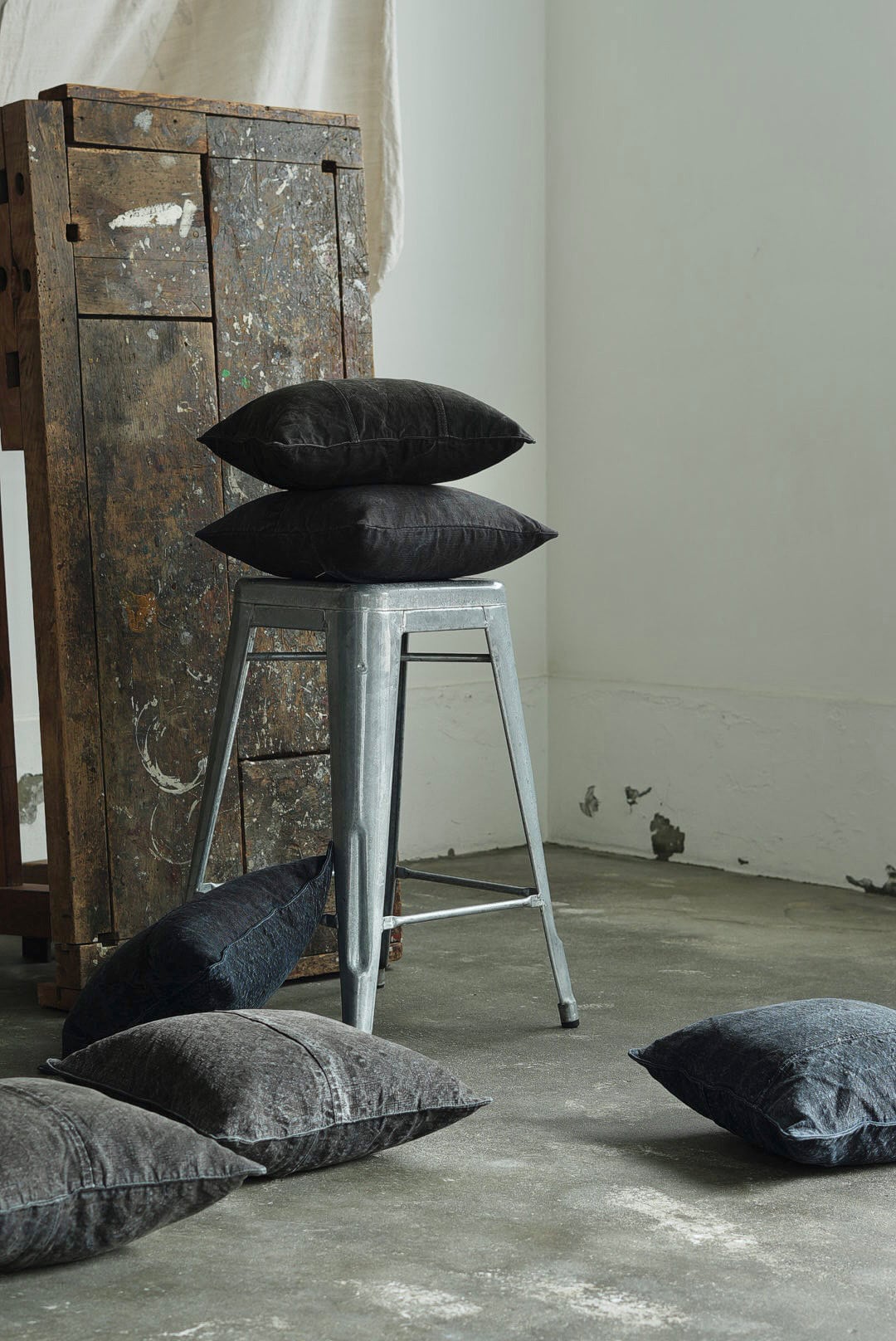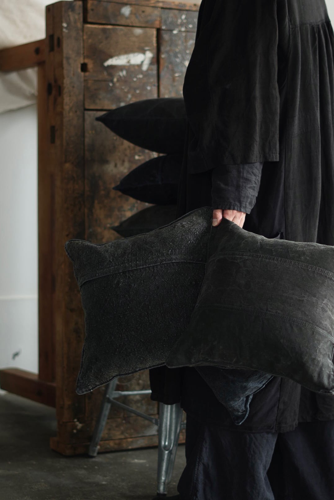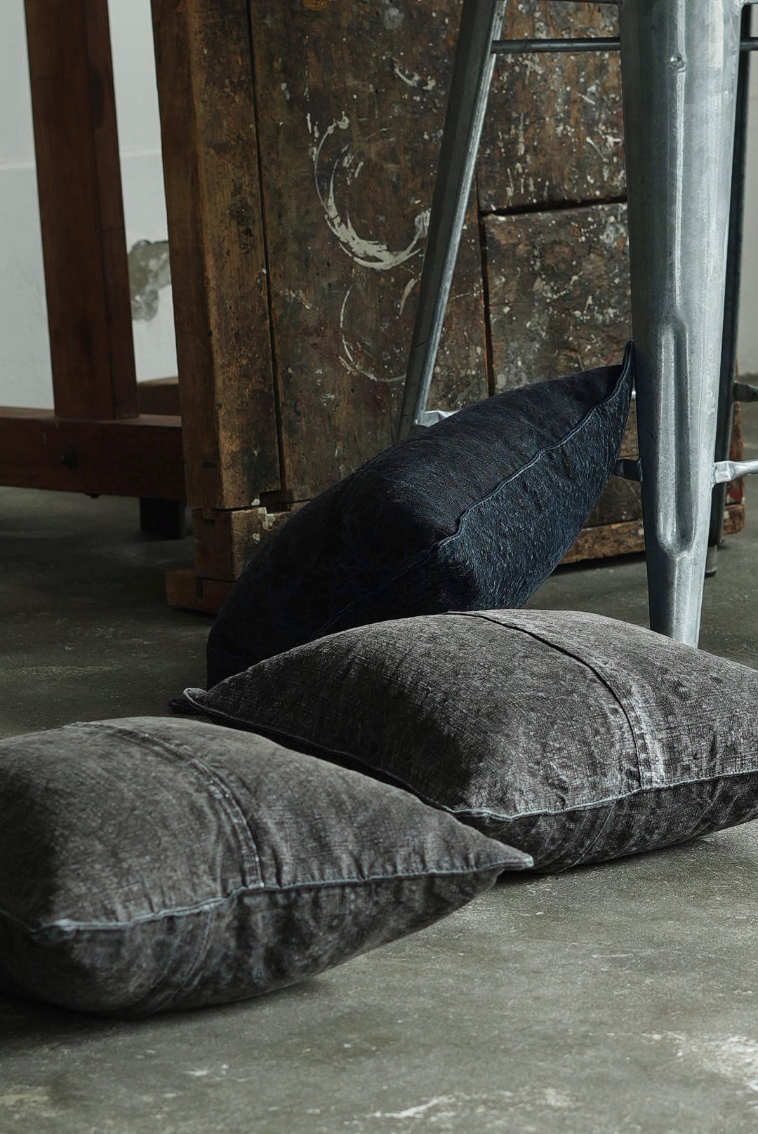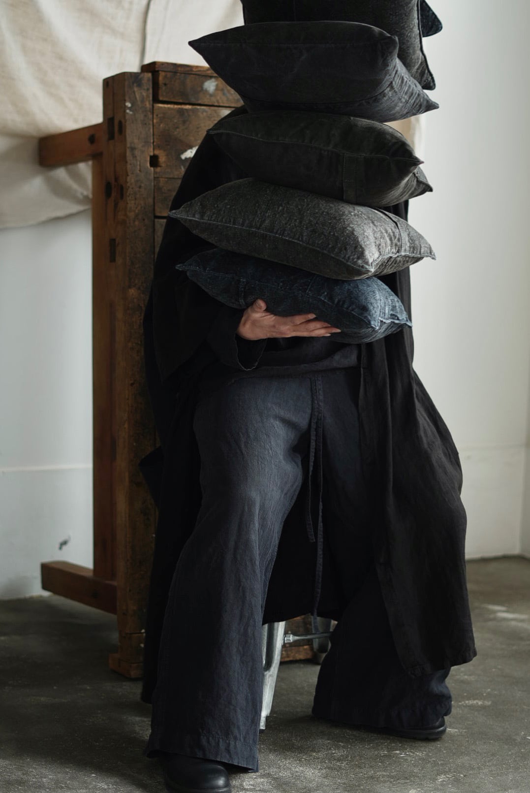 "VINCENT JALBERT"のパートナー、YVES ANDRIEUXの手掛けるアイテム。1950年代のイタリアンミリタリーアイテム(デッドストック)を解体し再構築。<解体・ウォッシュ・ダイ→褪色を促した後に再染色したヘンプファブリック>、フェードした淡いのブラックとネイビーに、ネップの表情が際立ちます。生地の繋ぎ方はそれぞれのワンオブザカインドデザイン。ヌードクッション付属。
