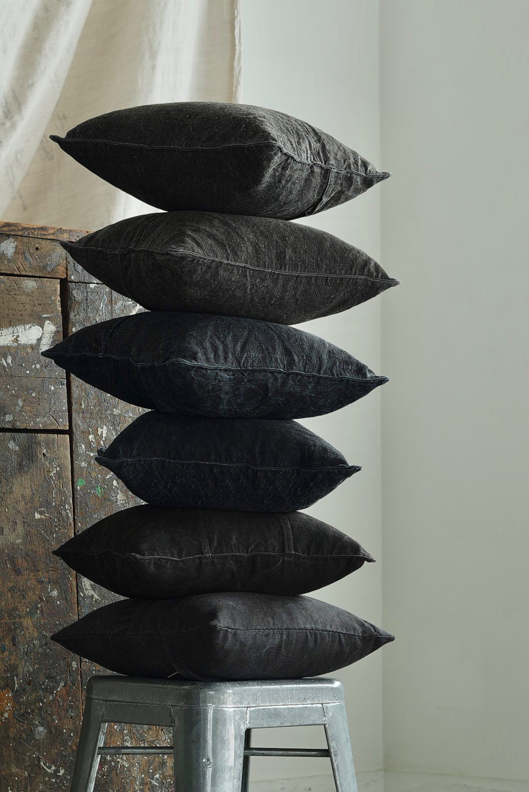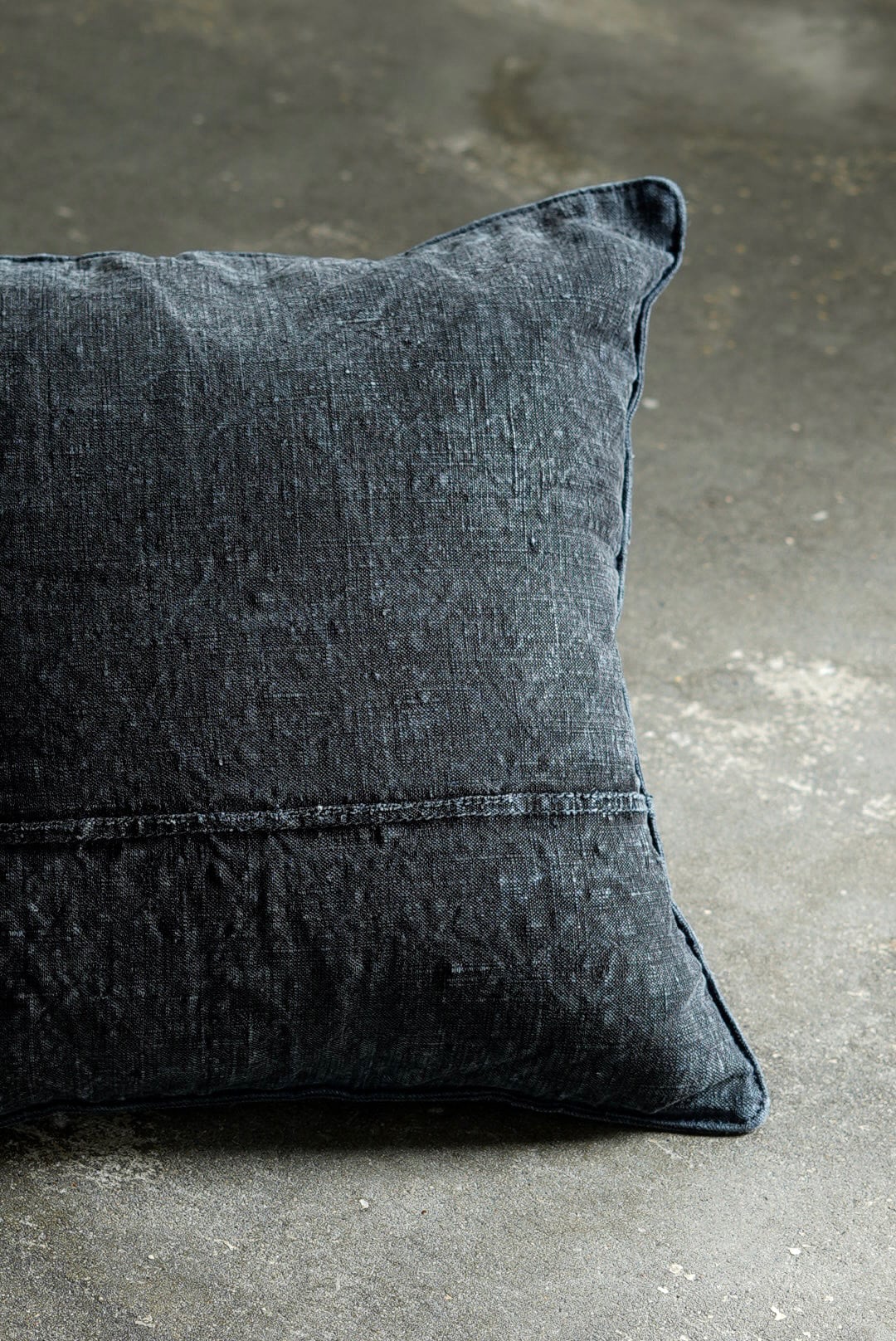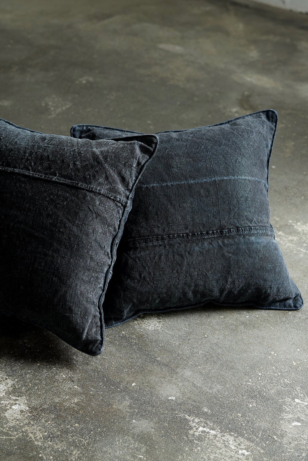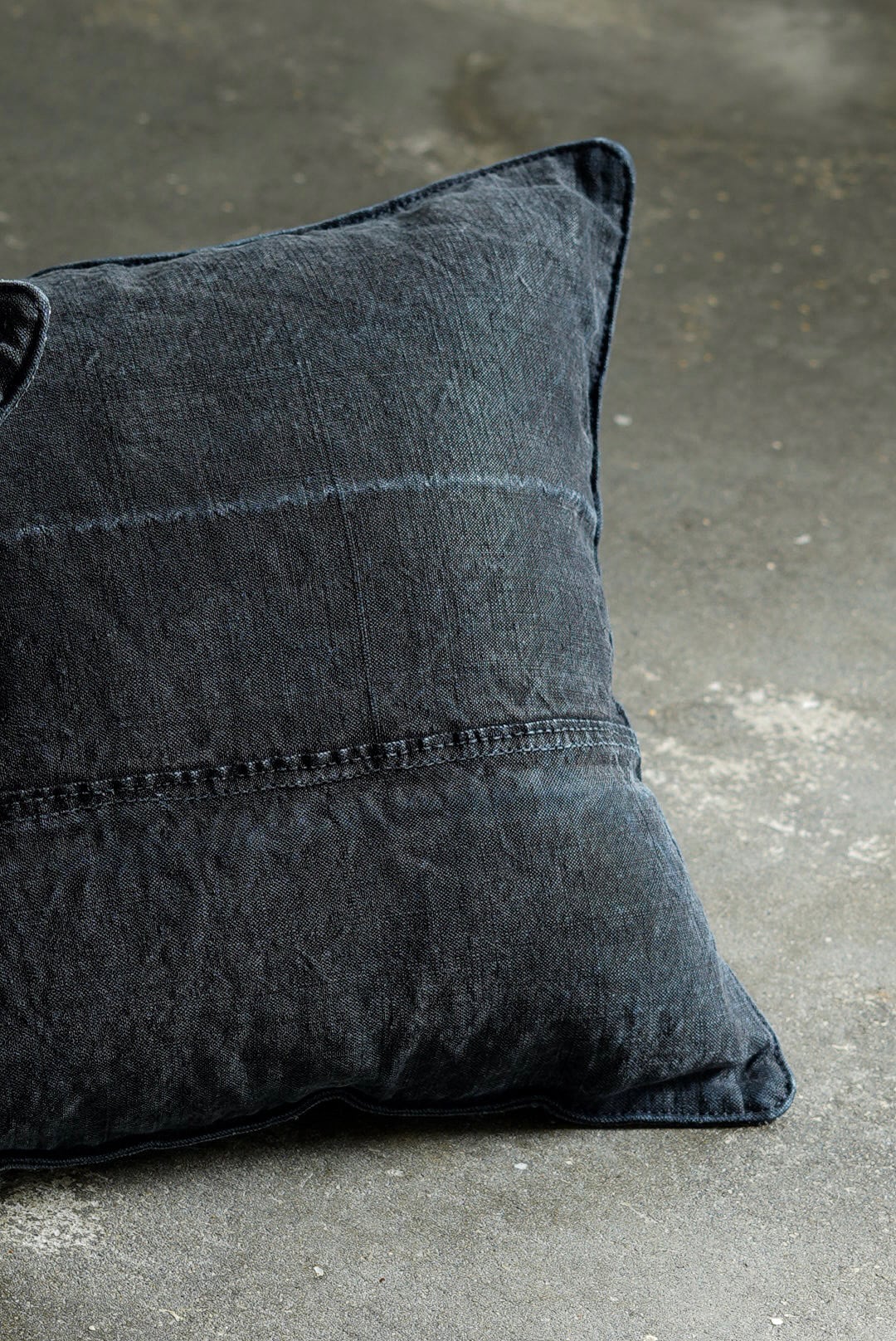 "VINCENT JALBERT"のパートナー、YVES ANDRIEUXの手掛けるアイテム。1950年代のイタリアンミリタリーアイテム(デッドストック)を解体し再構築。<解体・ウォッシュ・ダイ→褪色を促した後に再染色したヘンプファブリック>、フェードした淡いのブラックとネイビーに、ネップの表情が際立ちます。生地の繋ぎ方はそれぞれのワンオブザカインドデザイン。ヌードクッション付属。