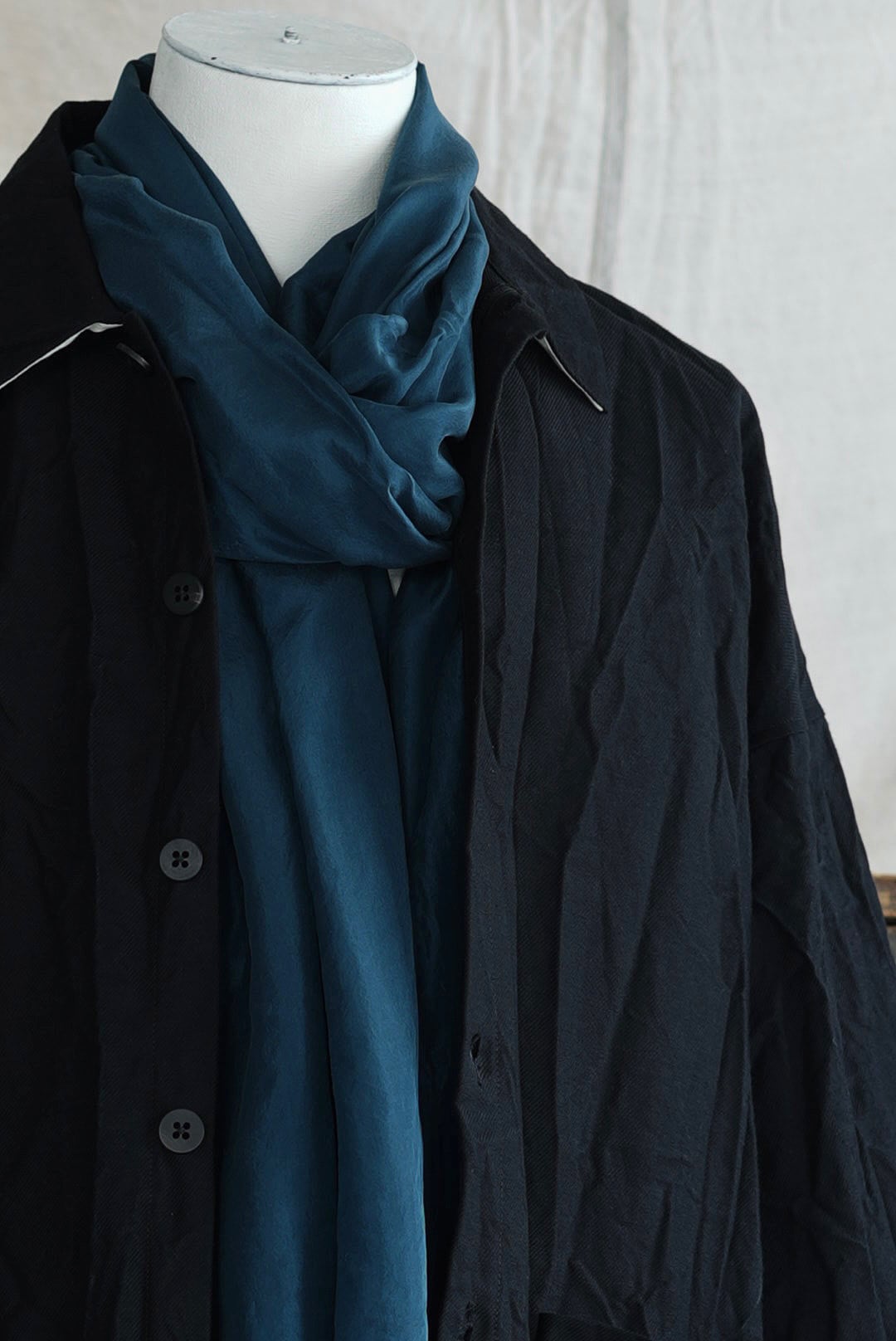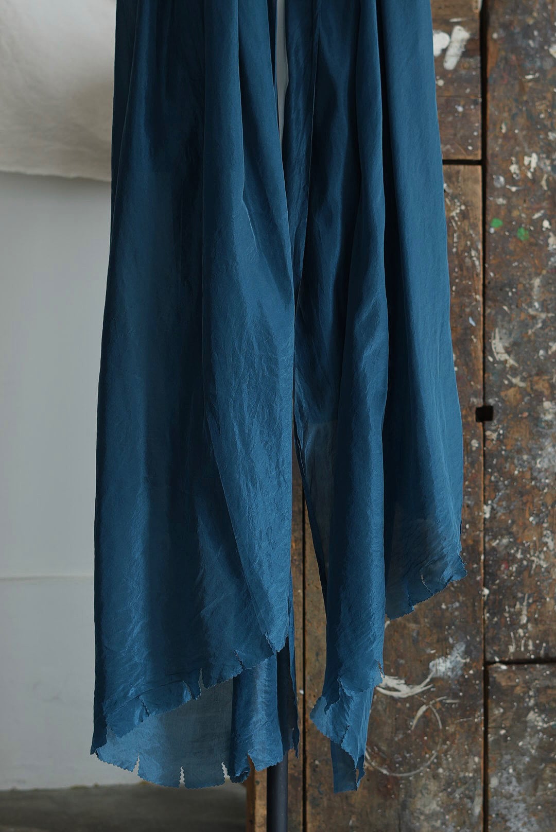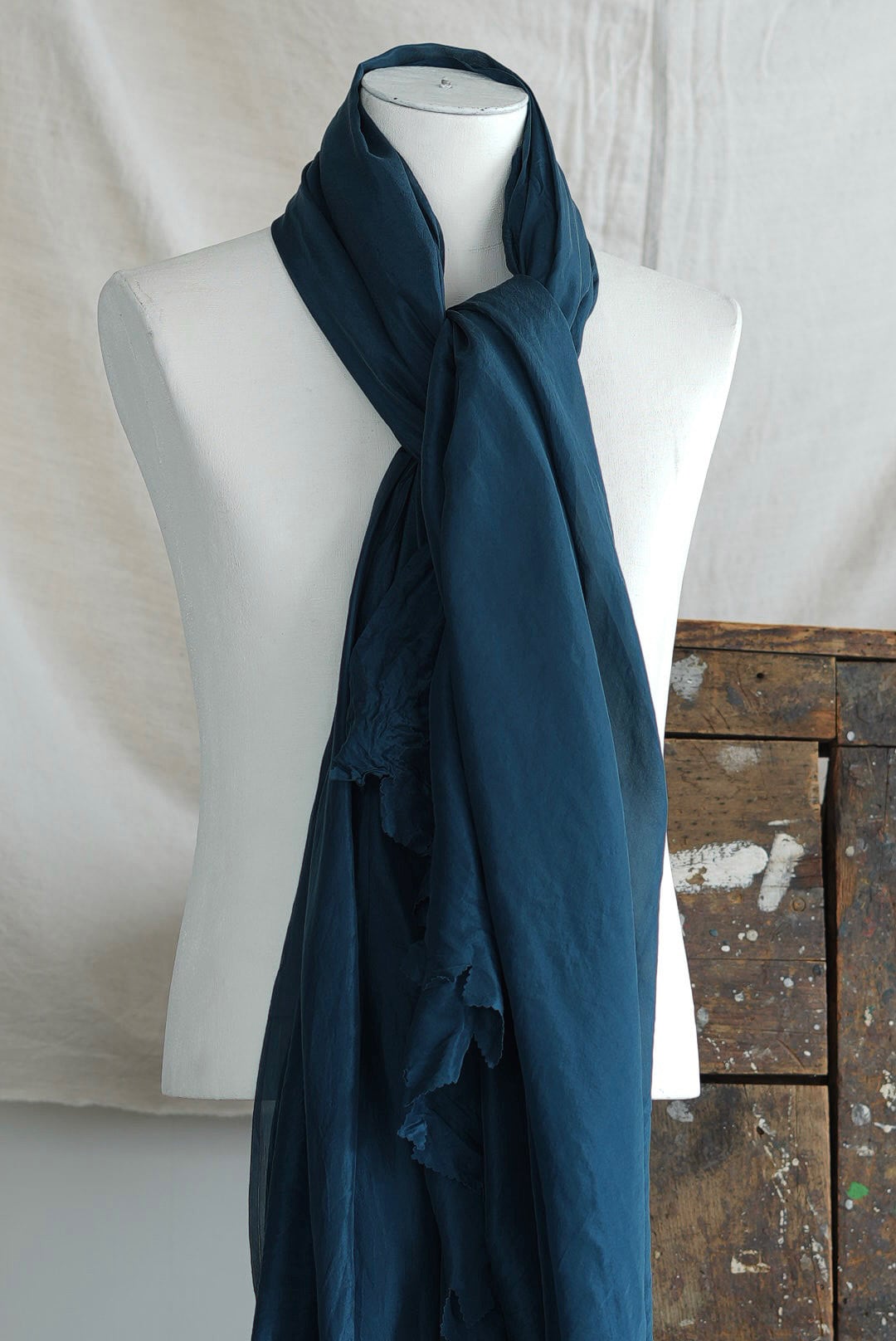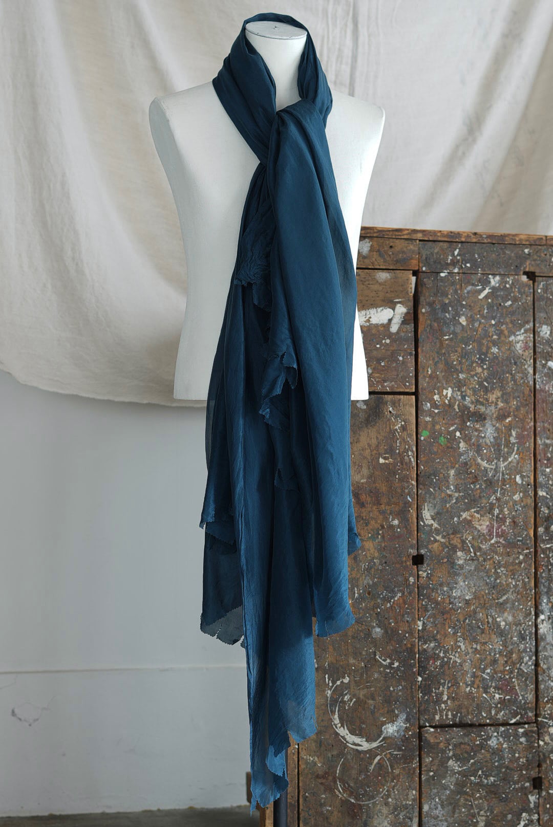 デザイナーのエスプリに強く惹かれるロングスカーフ。ラフにカットオフしたヘムのデザイン、ガーメントダイ(製品染)にて染められた、鴨の羽色と親しまれる、華やかながらも落ち着きのある精細なダックブルーカラー。目詰まりが良く上質でライトな大判サイズのシルクファブリック。ボリュームを生みアクセントになり、風をまとい揺れなびくことで日々のスタイリングに動きをもたらします。光の具合で織りなす表情の多様性はシルク素材ならでは。人肌に近いタンパク質構造の天然素材の為、どなたにもストレスのない肌当たりは大きな魅力です。