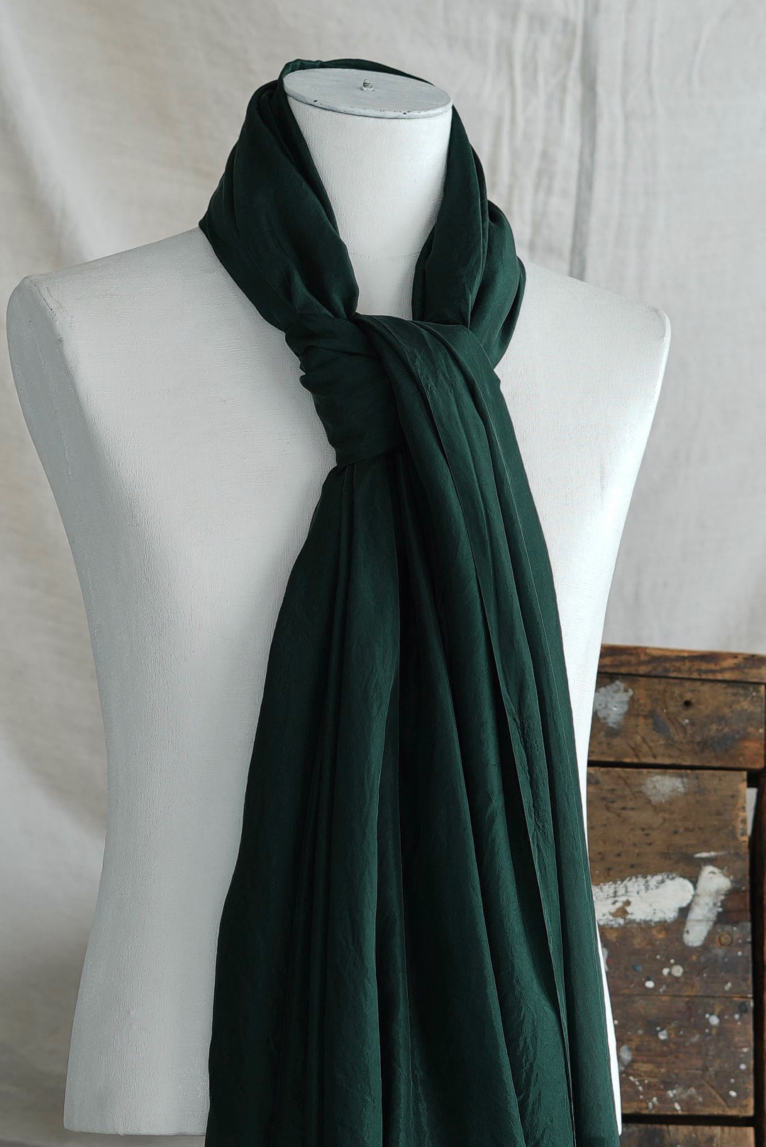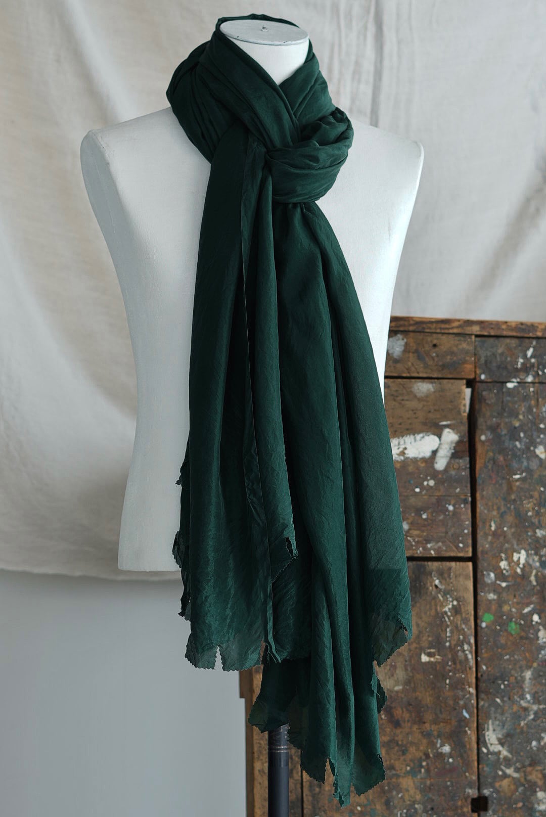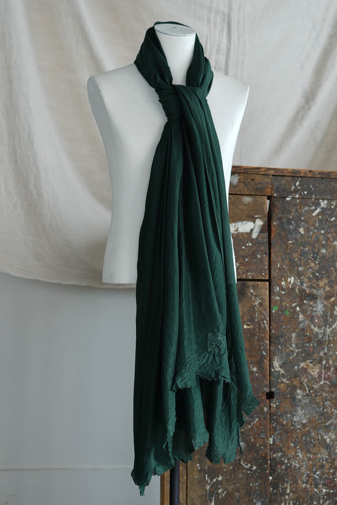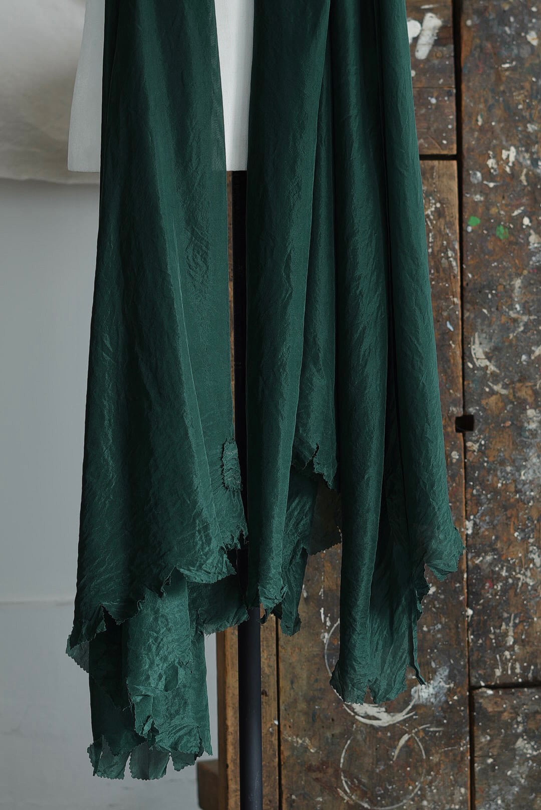 デザイナーのエスプリに強く惹かれるロングスカーフ。ラフにカットオフしたヘムのデザイン、ガーメントダイ(製品染)にて染められた、森の木々を思わせる、深みのある落ち着いたフォレストグリーンカラー。目詰まりが良く上質でライトな大判サイズのシルクファブリック。ボリュームを生みアクセントになり、風をまとい揺れなびくことで日々のスタイリングに動きをもたらします。光の具合で織りなす表情の多様性はシルク素材ならでは。人肌に近いタンパク質構造の天然素材の為、どなたにもストレスのない肌当たりは大きな魅力です。