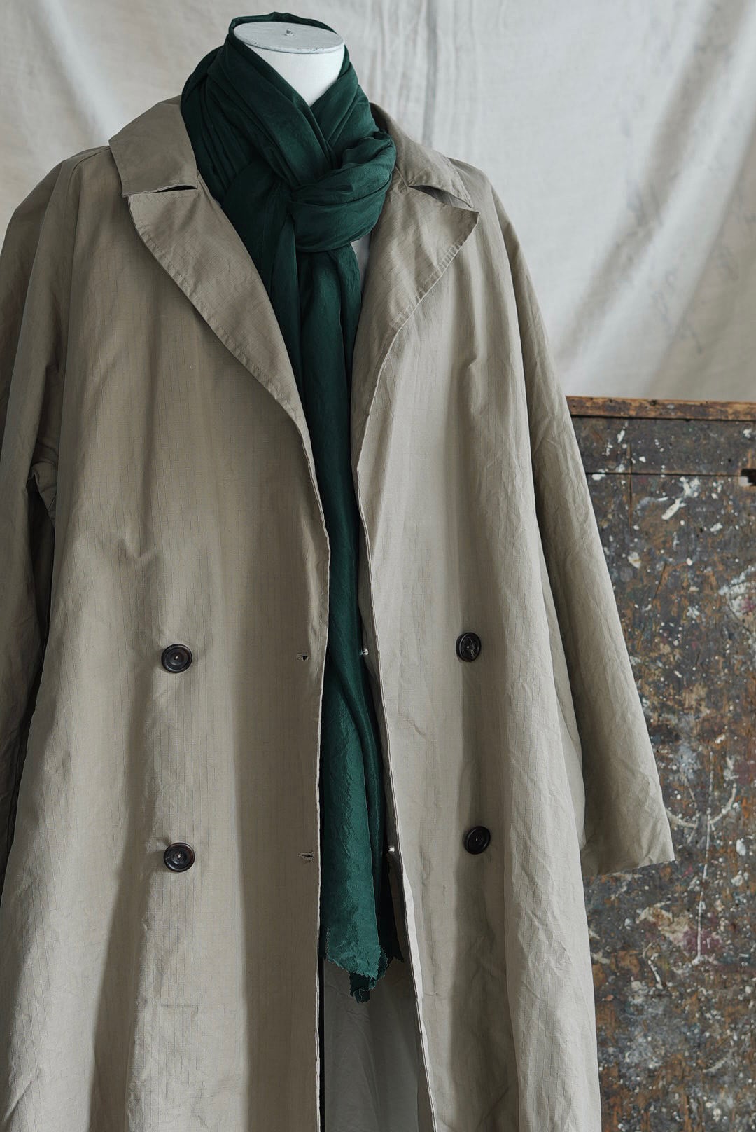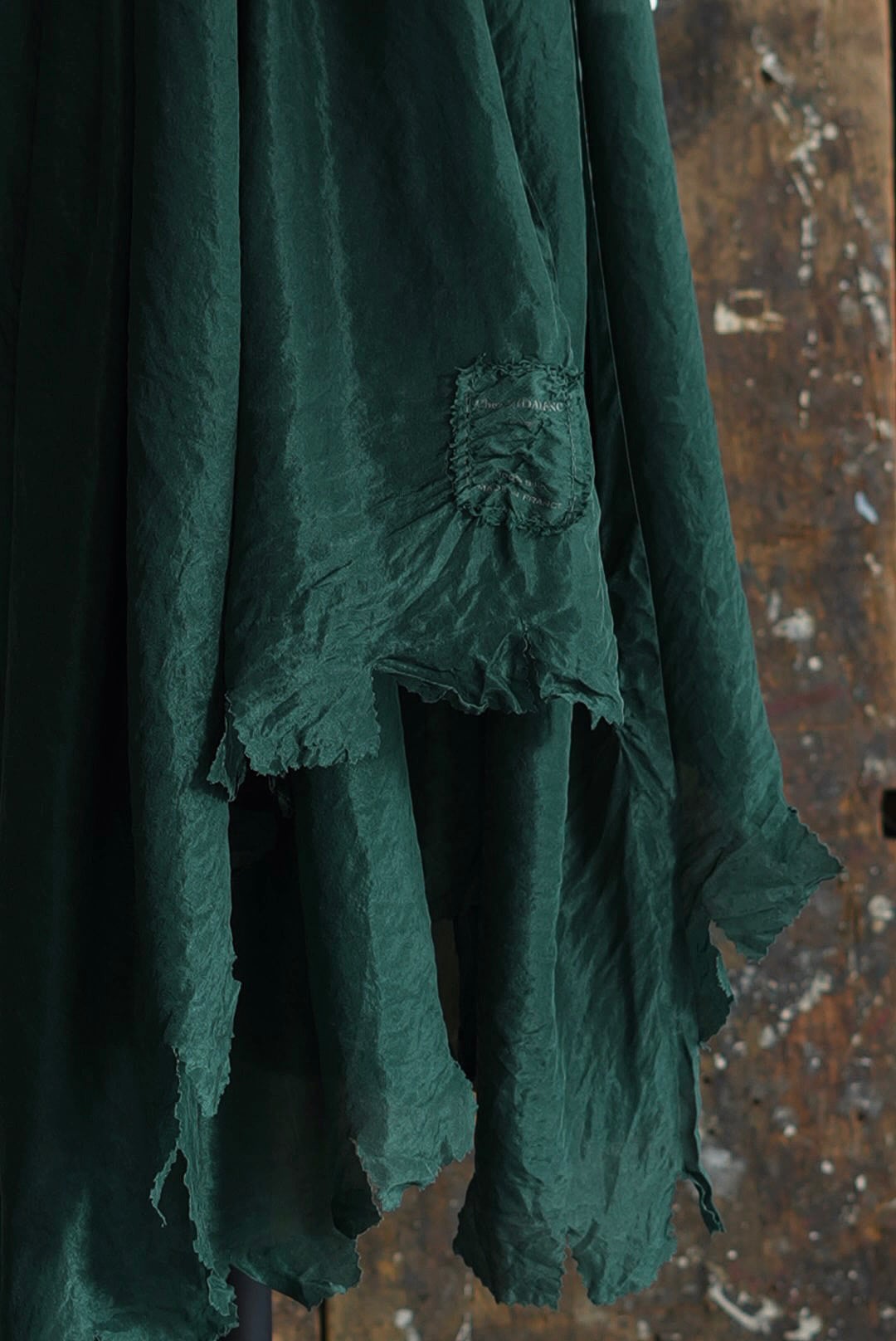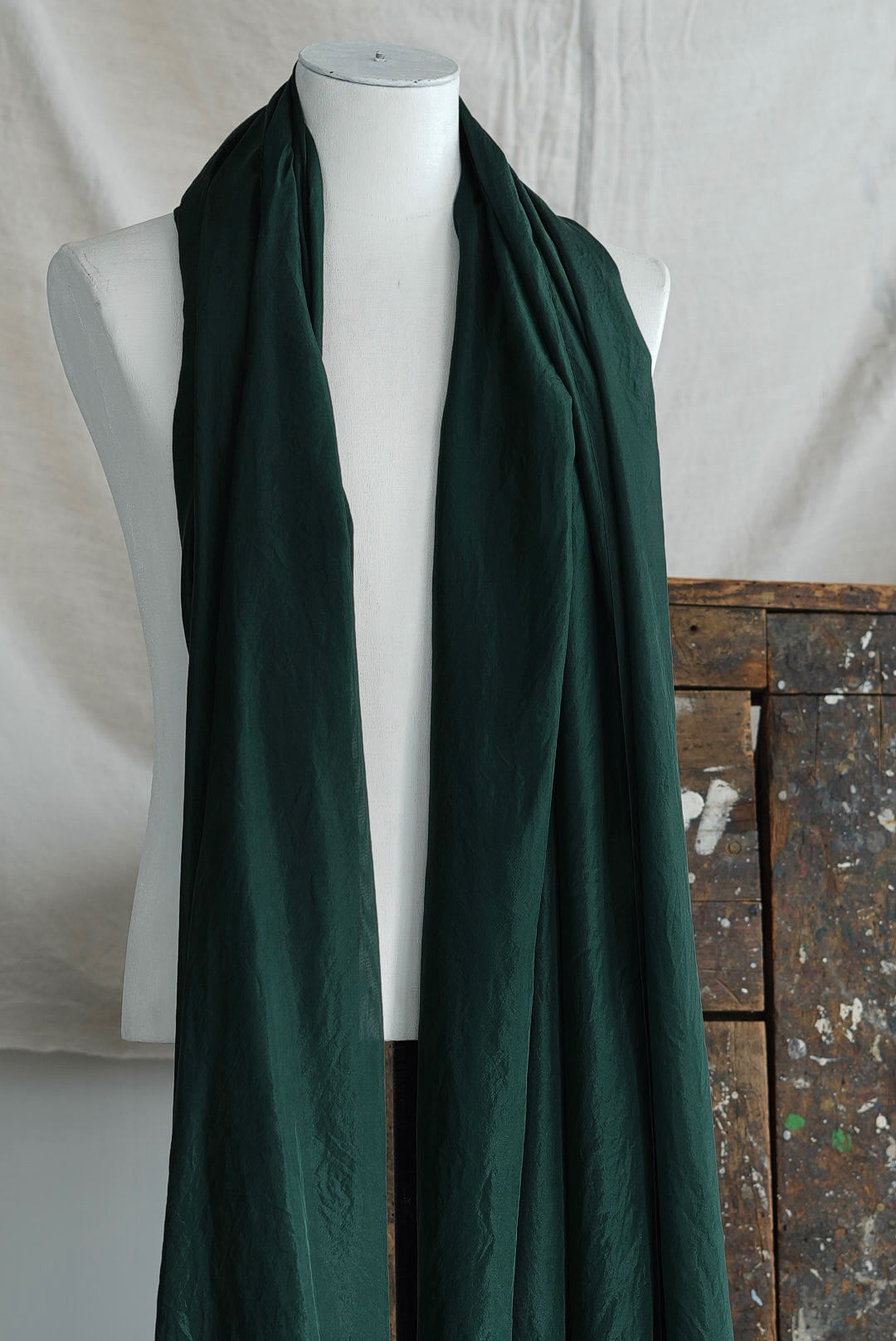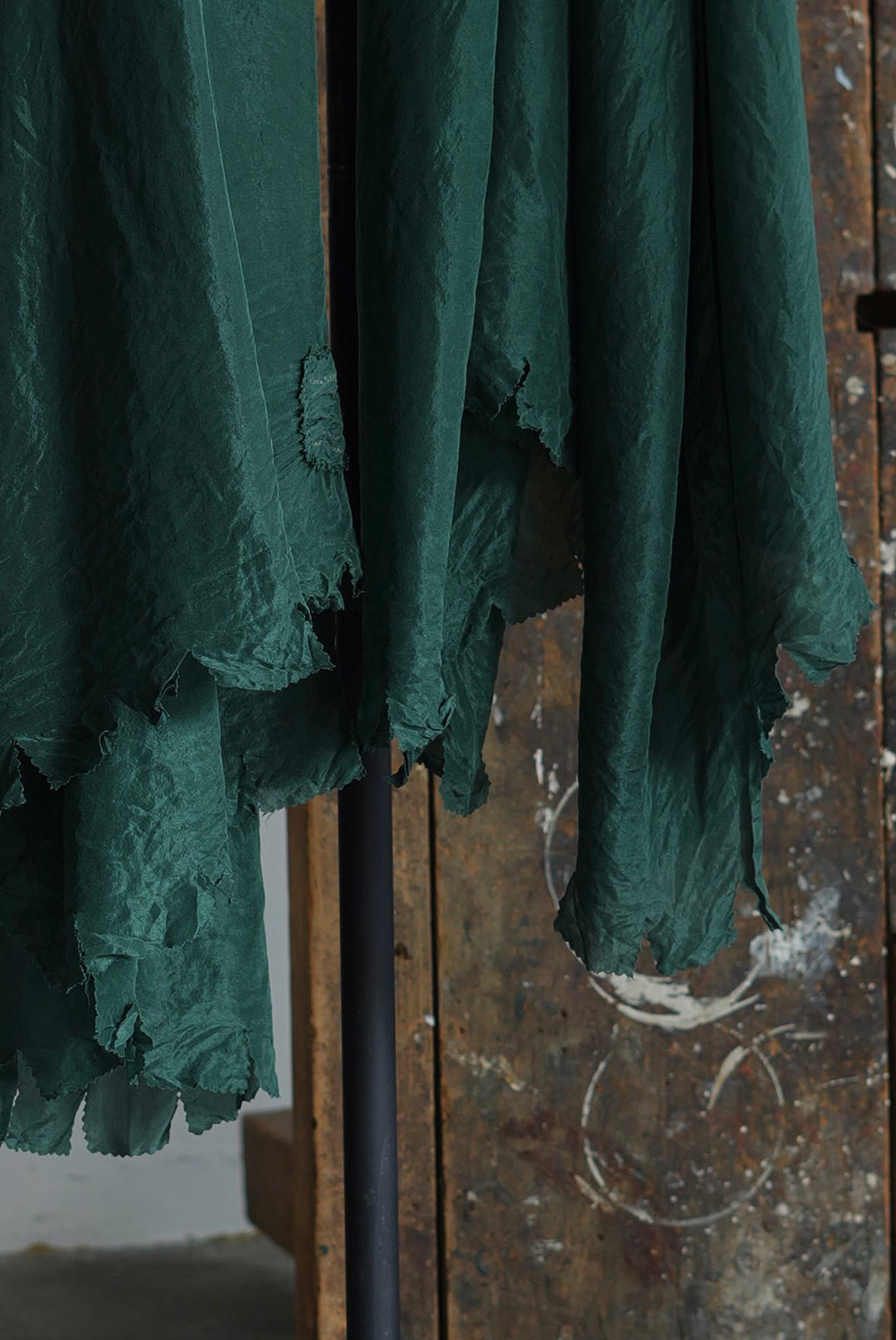 デザイナーのエスプリに強く惹かれるロングスカーフ。ラフにカットオフしたヘムのデザイン、ガーメントダイ(製品染)にて染められた、森の木々を思わせる、深みのある落ち着いたフォレストグリーンカラー。目詰まりが良く上質でライトな大判サイズのシルクファブリック。ボリュームを生みアクセントになり、風をまとい揺れなびくことで日々のスタイリングに動きをもたらします。光の具合で織りなす表情の多様性はシルク素材ならでは。人肌に近いタンパク質構造の天然素材の為、どなたにもストレスのない肌当たりは大きな魅力です。