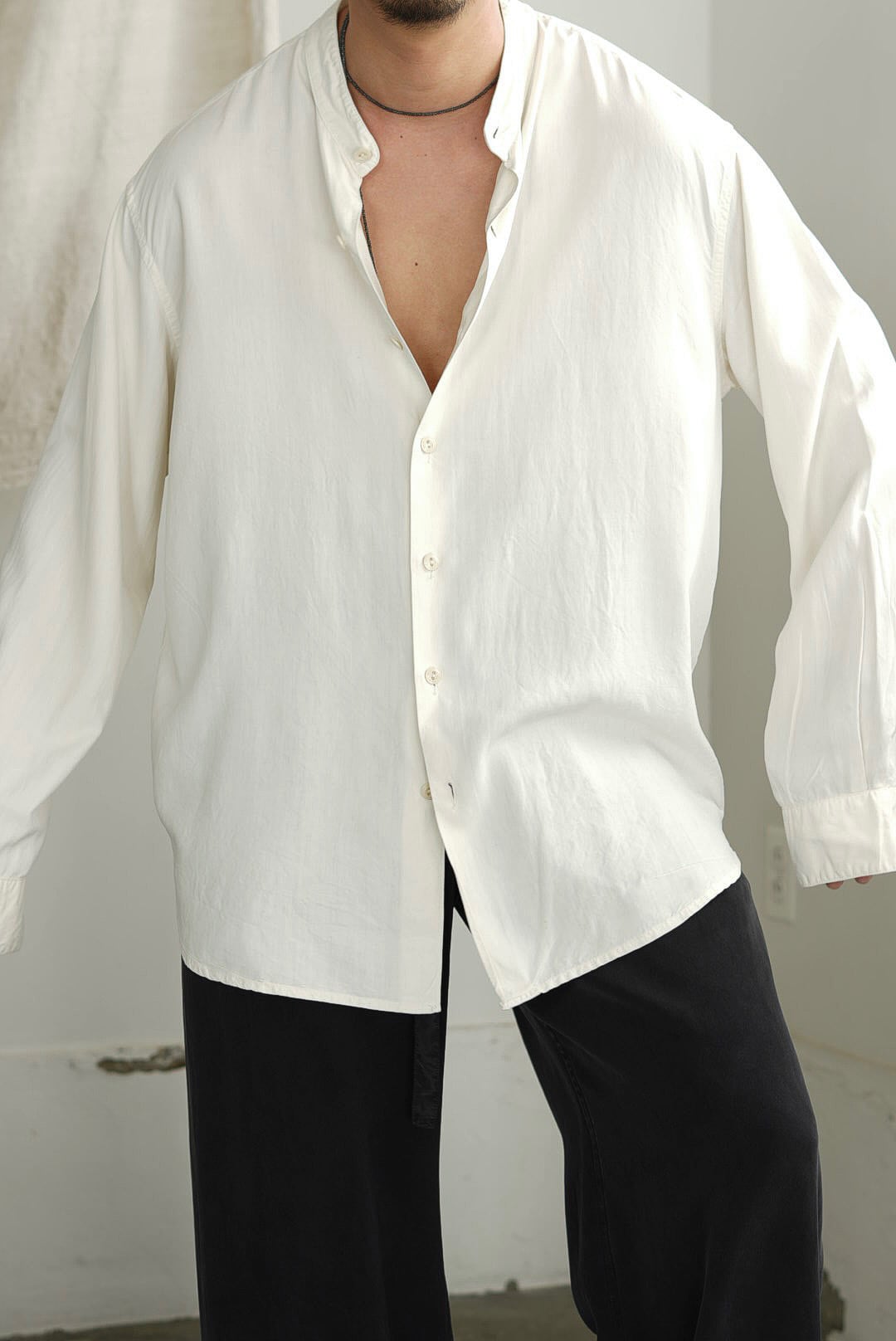 ワークスタイルベース、気取りのないデザインのカラーレスシャツ。シルクの肌当たりにコットンライクな表情のニュアンスが入り混じる、贅沢にも敢えて光沢を抑えたシルクマットファブリックを使用。枯れた表情の中でふと、シルク特有の多面的な光沢を帯びた様子に、慎ましいエレガントさを感じます。製品洗いの工程において、ステッチが締まり縮絨し現れる、細部のパッカリングは、シンプルの中に感じる僅かなアクセント。リラックスしたシルエットは生地が心地よくドレープする程よさ、背面のサイドプリーツは肩周りの可動域を広げ、快適な着用感を加えます。ミニマルなアンティークガラスボタンのディティール。