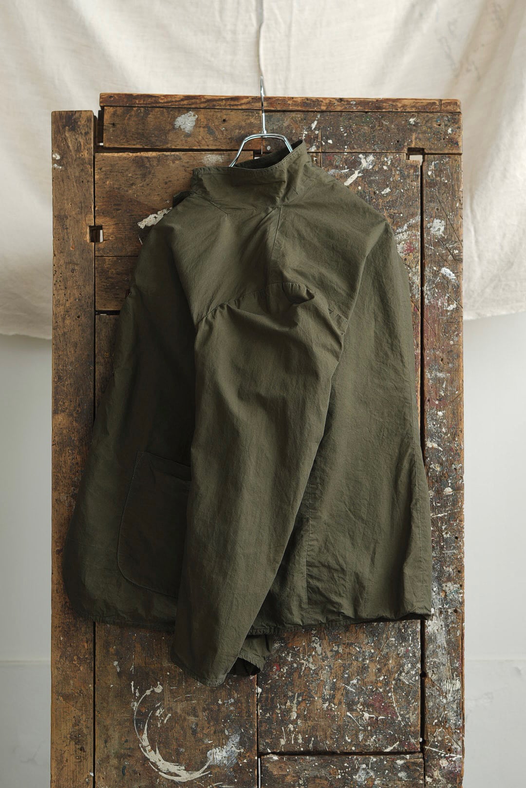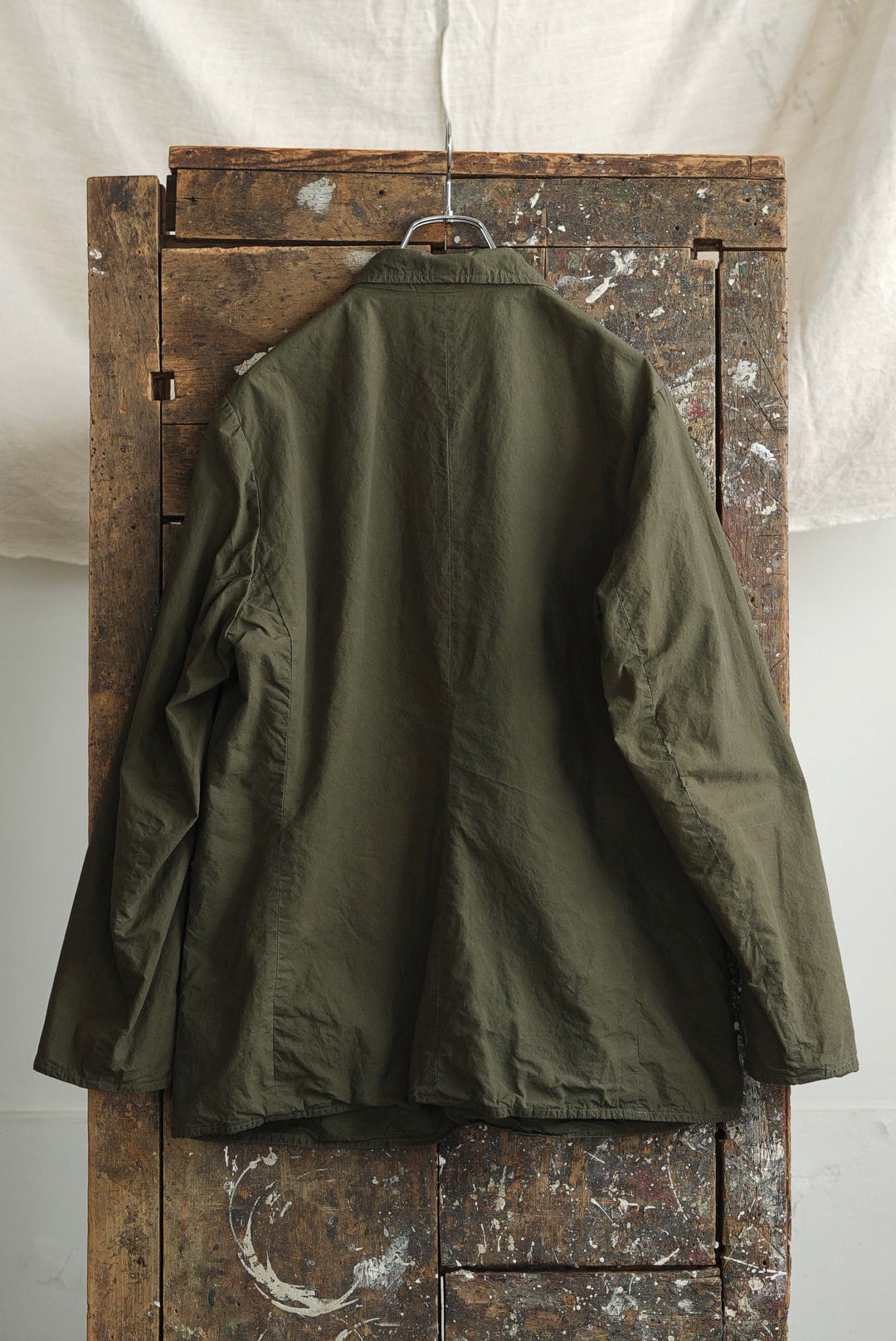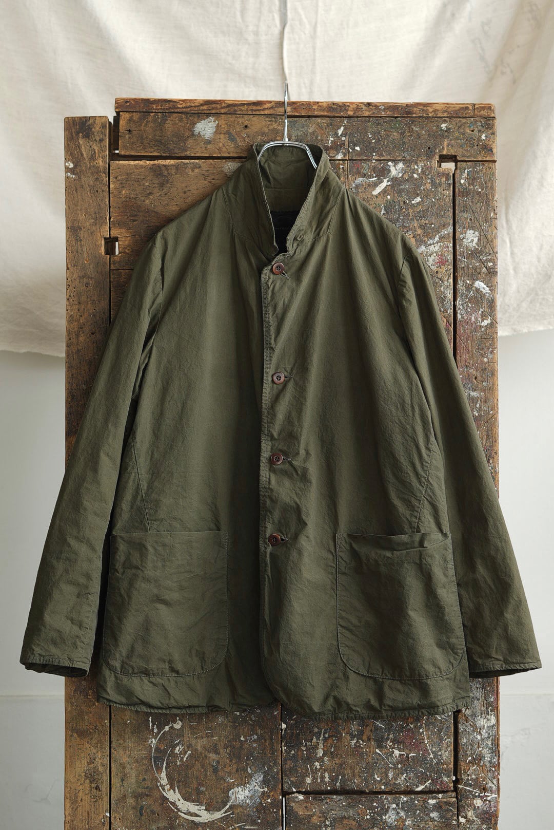 フロント3ボタン+1ボタン。ラペル&スタンド、2WAYデザインのP3ジャケット。着用の度に身体に馴染み込む"ハリースティーブンソン"社製のワックスドライトコットンを使用。生地段階でウォッシュ加工をハードに施しワックスをとばし、その後製品染めにて染色。チョークマーク(アタリ)をわずかに浮かべながら染まった表情の良い仕上がりです。フルライニング、スリーブには贅沢にシルクファブリックを採用しています。背面はノーベント、袖は筒タイプのカジュアルなデザイン。内側に2箇所パッチチェストポケットが備わります