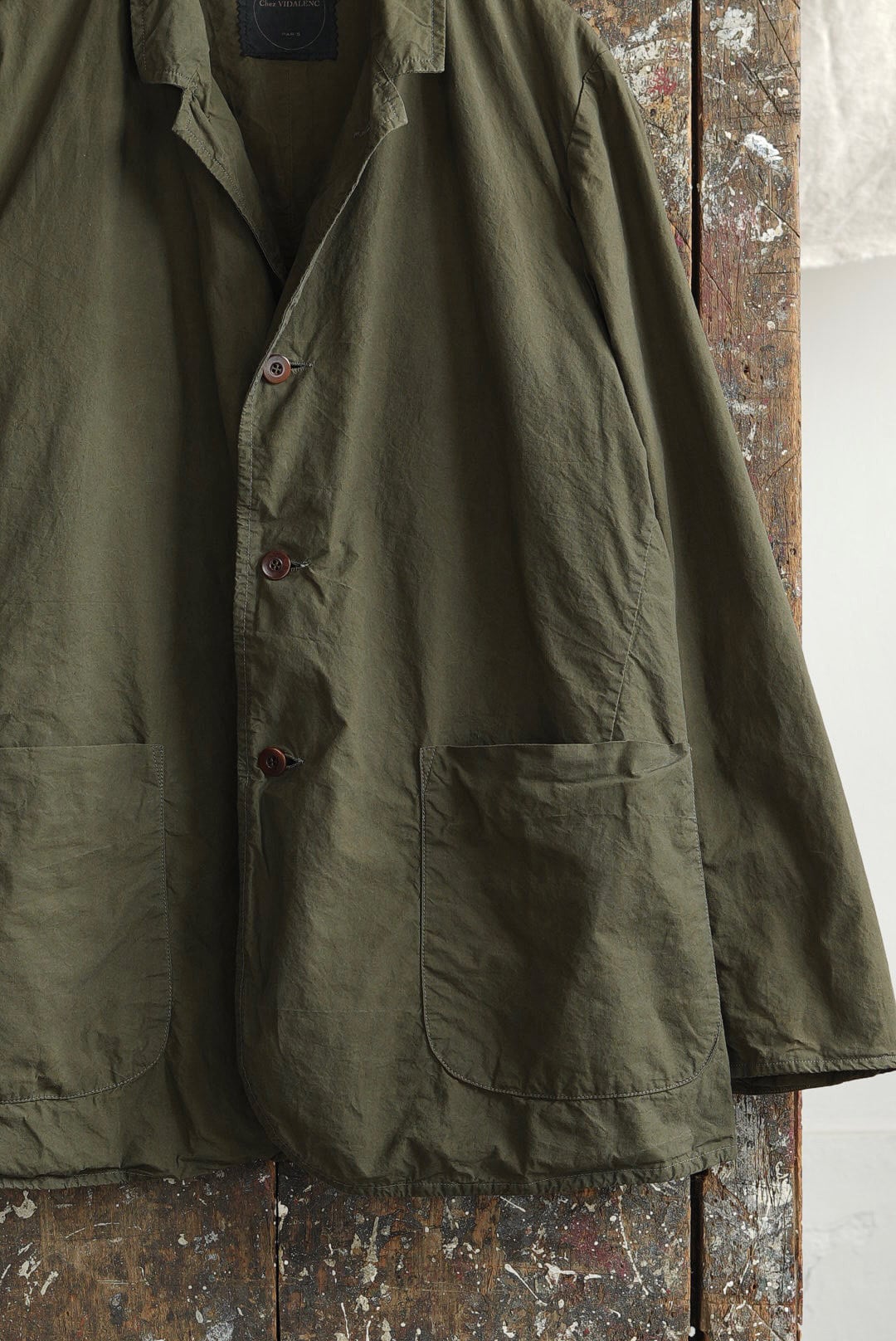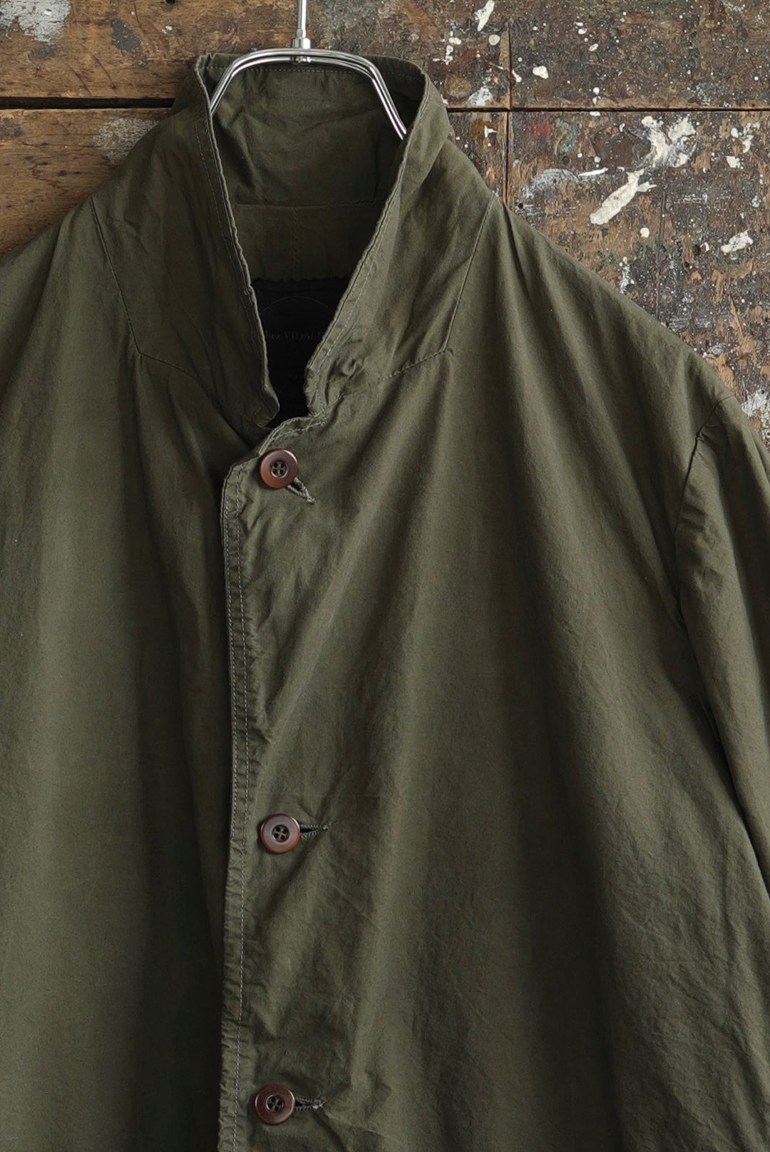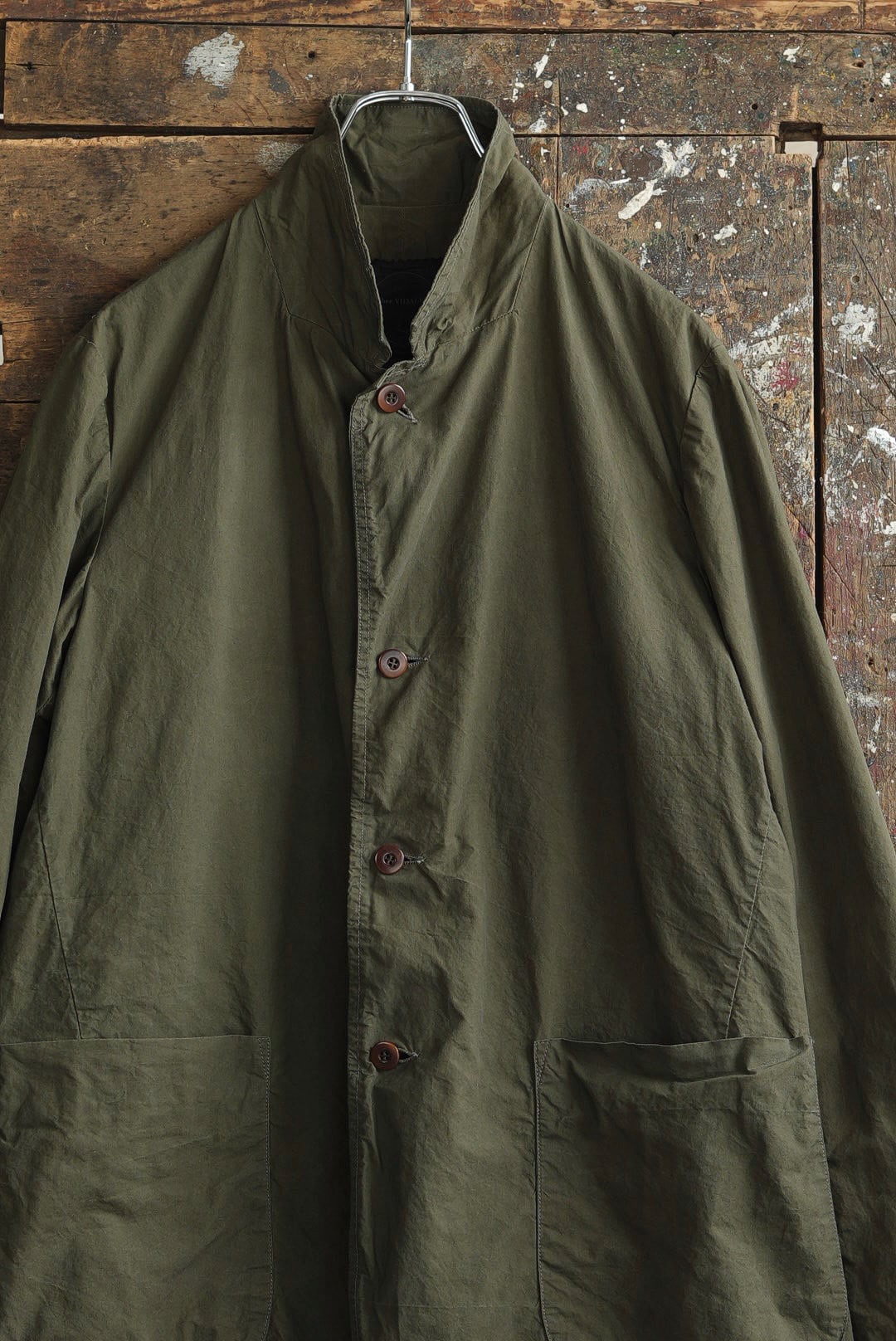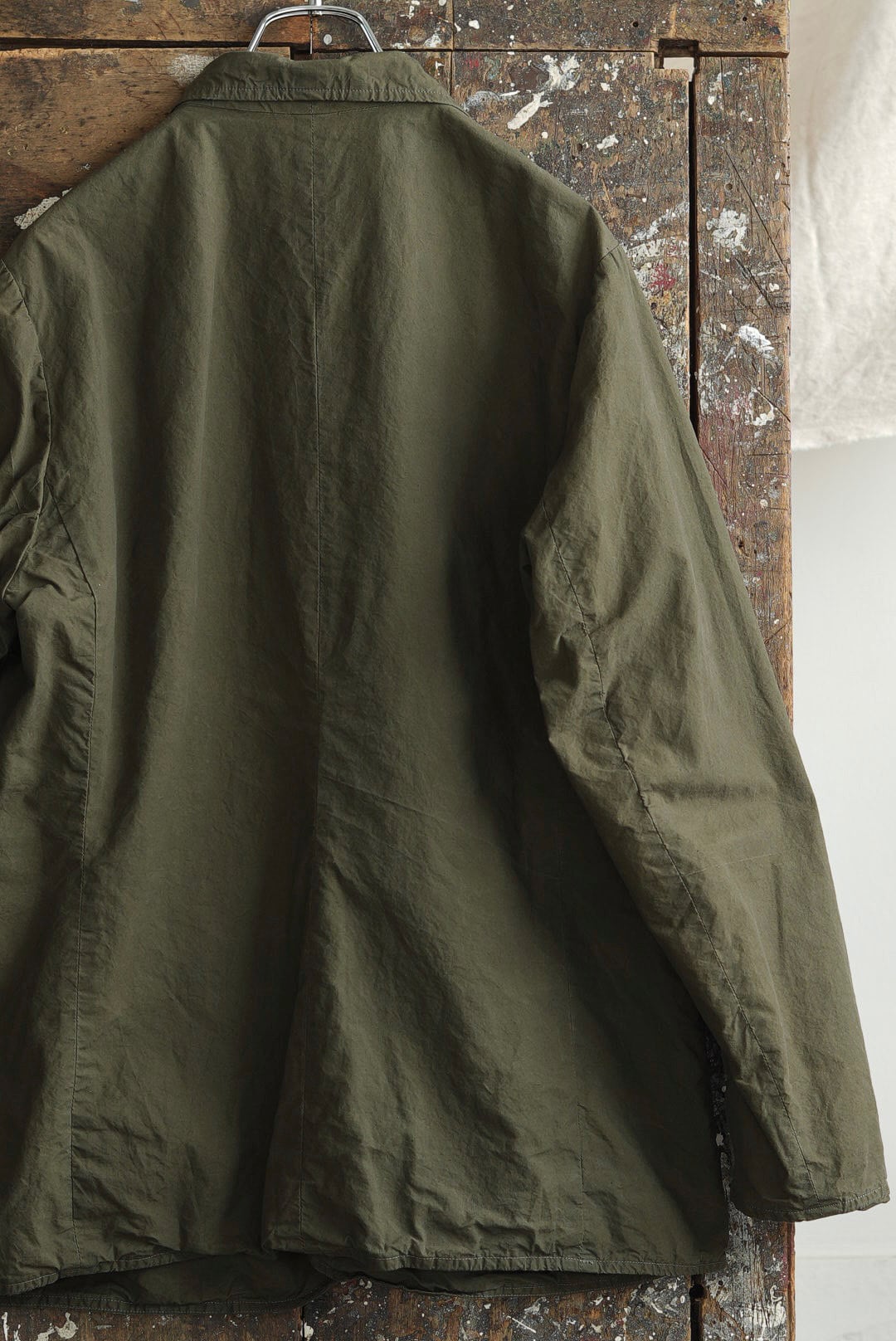フロント3ボタン+1ボタン。ラペル&スタンド、2WAYデザインのP3ジャケット。着用の度に身体に馴染み込む"ハリースティーブンソン"社製のワックスドライトコットンを使用。生地段階でウォッシュ加工をハードに施しワックスをとばし、その後製品染めにて染色。チョークマーク(アタリ)をわずかに浮かべながら染まった表情の良い仕上がりです。フルライニング、スリーブには贅沢にシルクファブリックを採用しています。背面はノーベント、袖は筒タイプのカジュアルなデザイン。内側に2箇所パッチチェストポケットが備わります