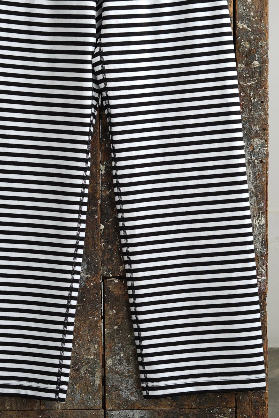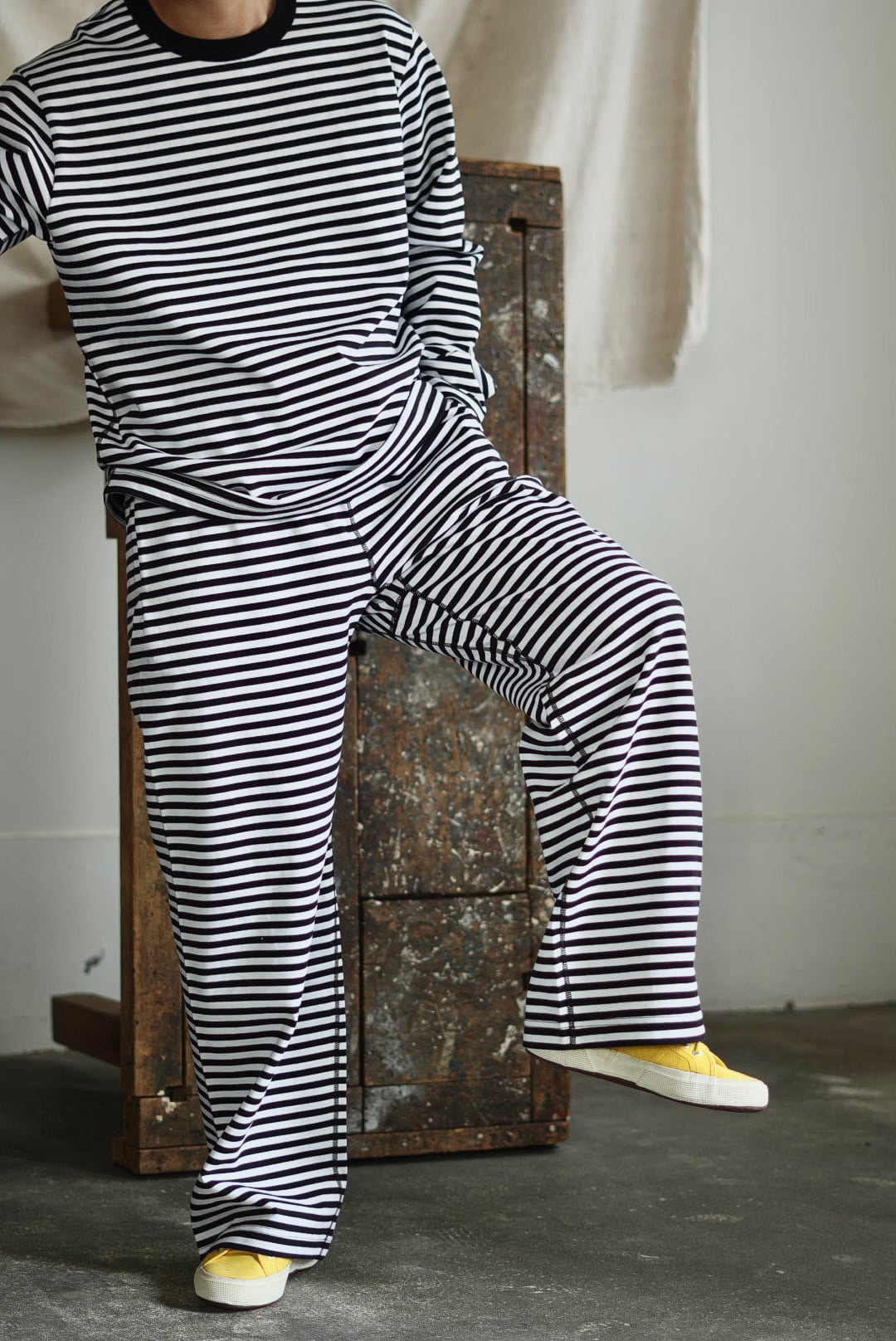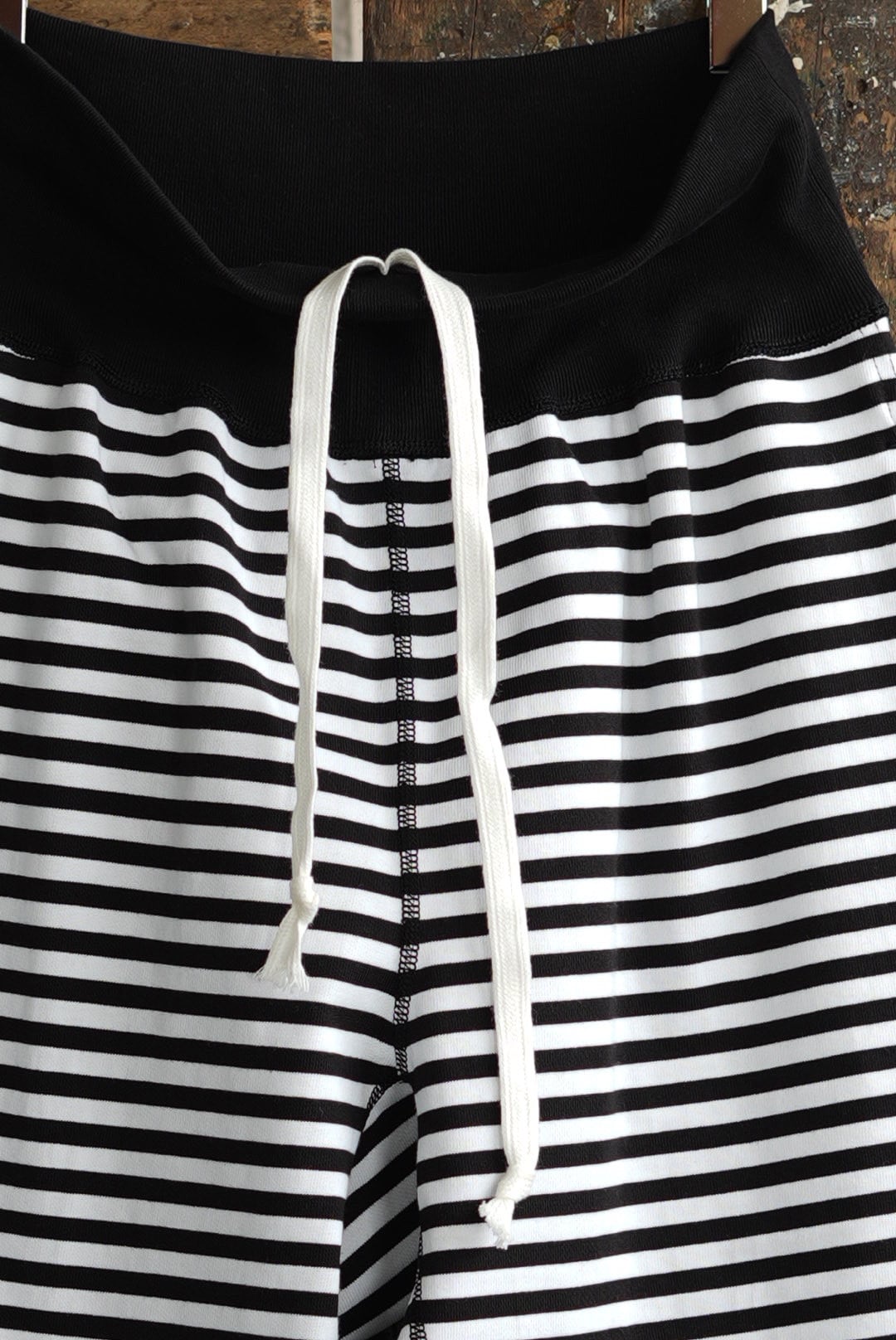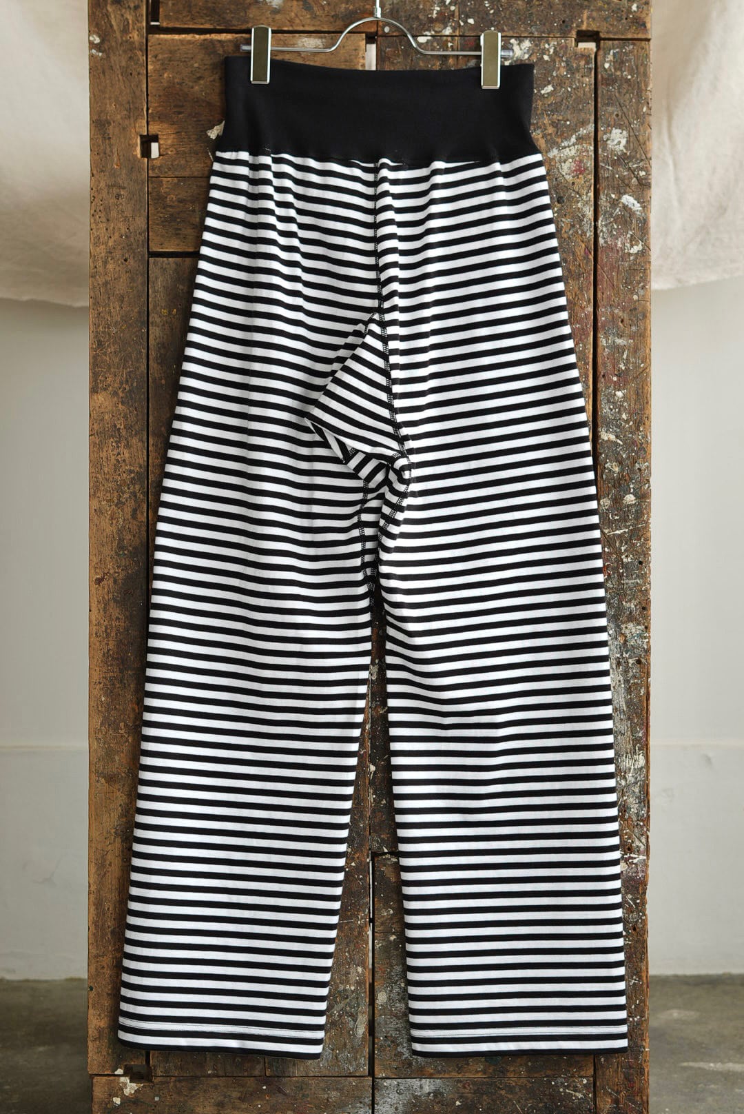 ボーダーのシンプルなロングパンツ。ヘヴィに編まれた質の良い単糸天竺。美しいフラットシーム。股下部分に設けられたガゼットクロッチ。ウエスト内にドローコード。サイドポケット。オーガニックコットン。