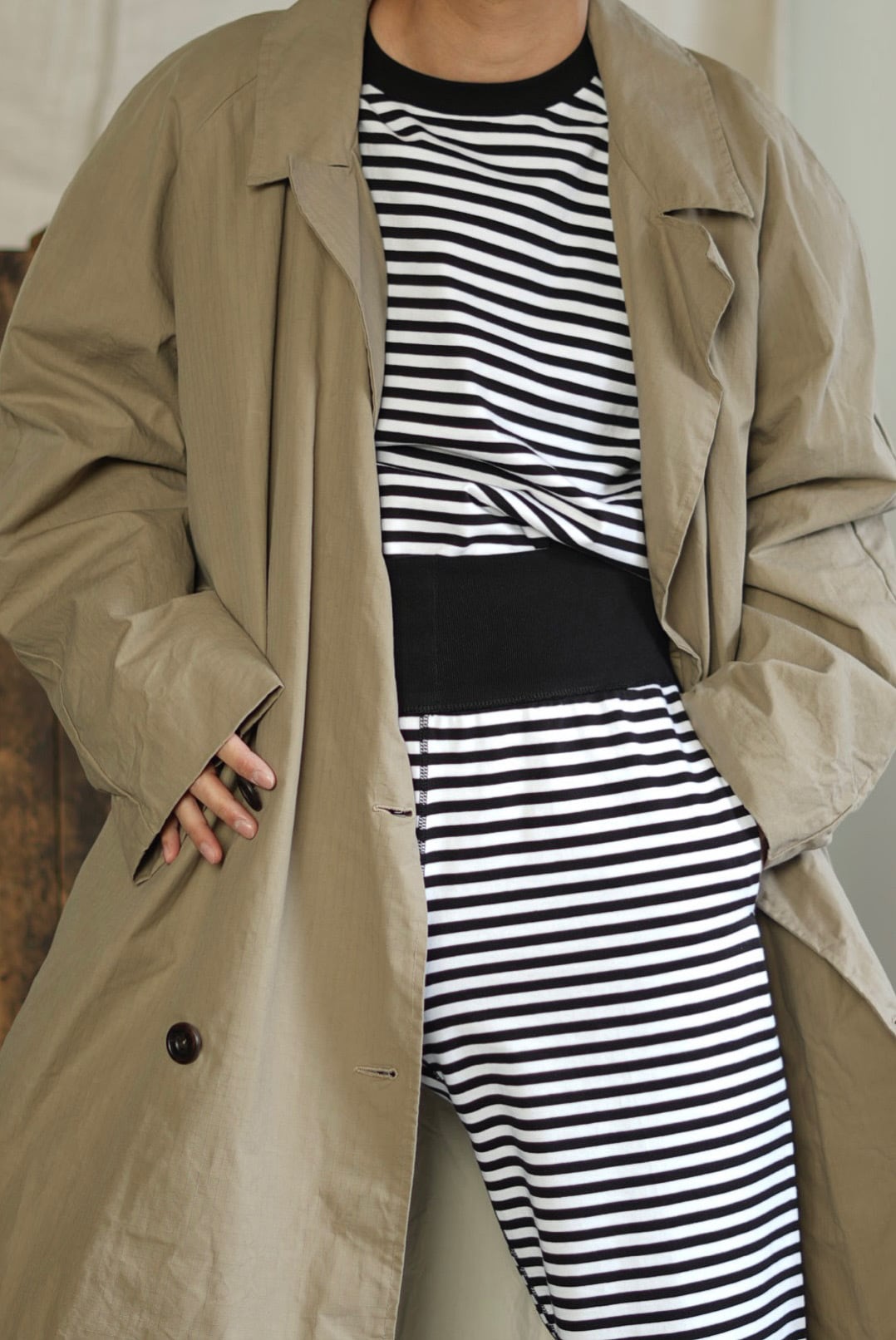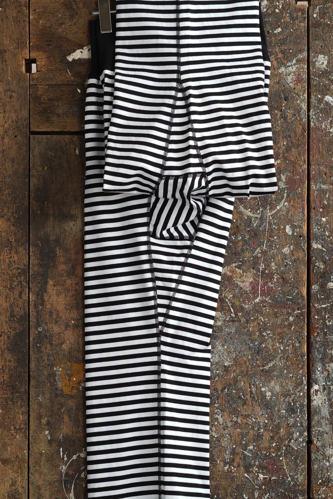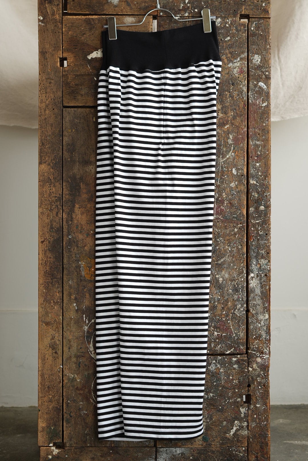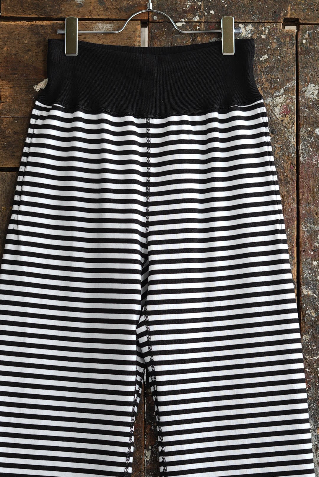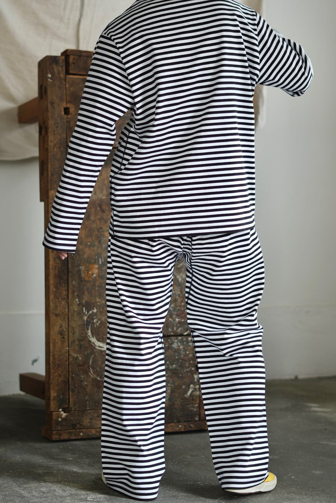 ボーダーのシンプルなロングパンツ。ヘヴィに編まれた質の良い単糸天竺。美しいフラットシーム。股下部分に設けられたガゼットクロッチ。ウエスト内にドローコード。サイドポケット。オーガニックコットン。