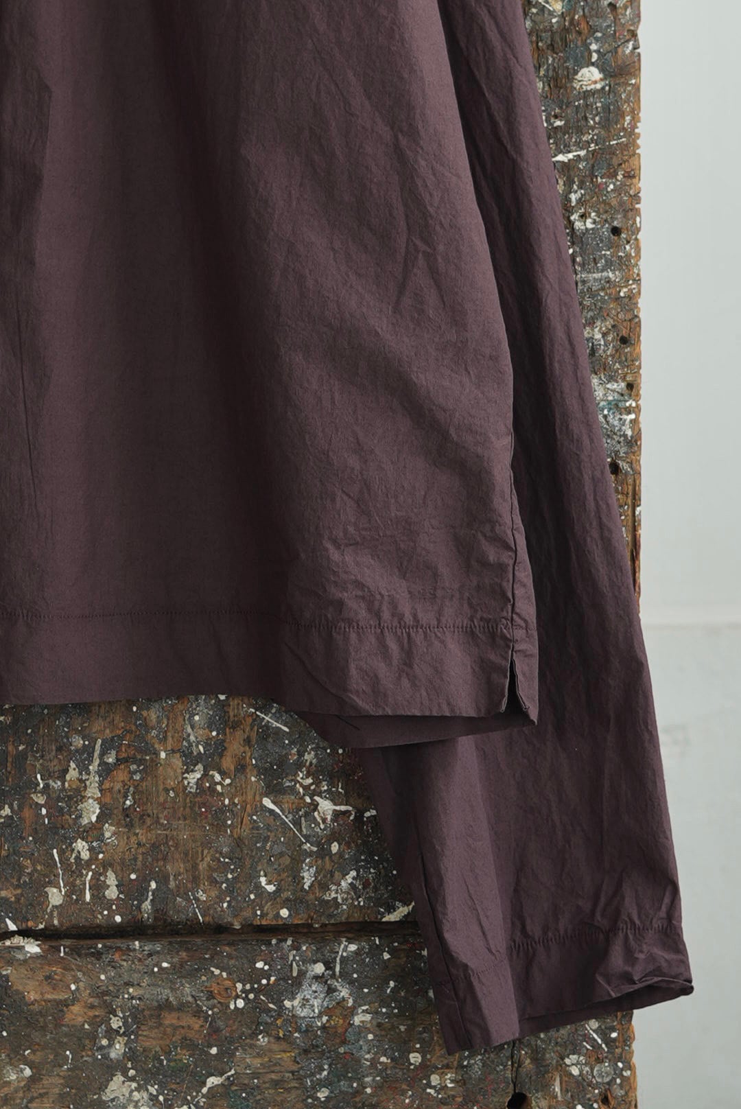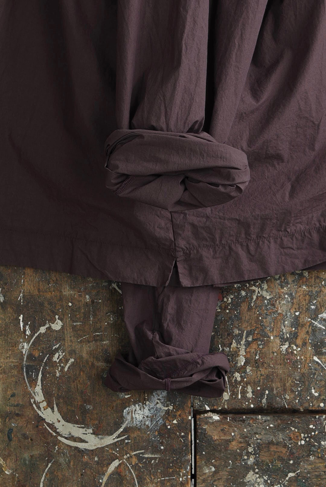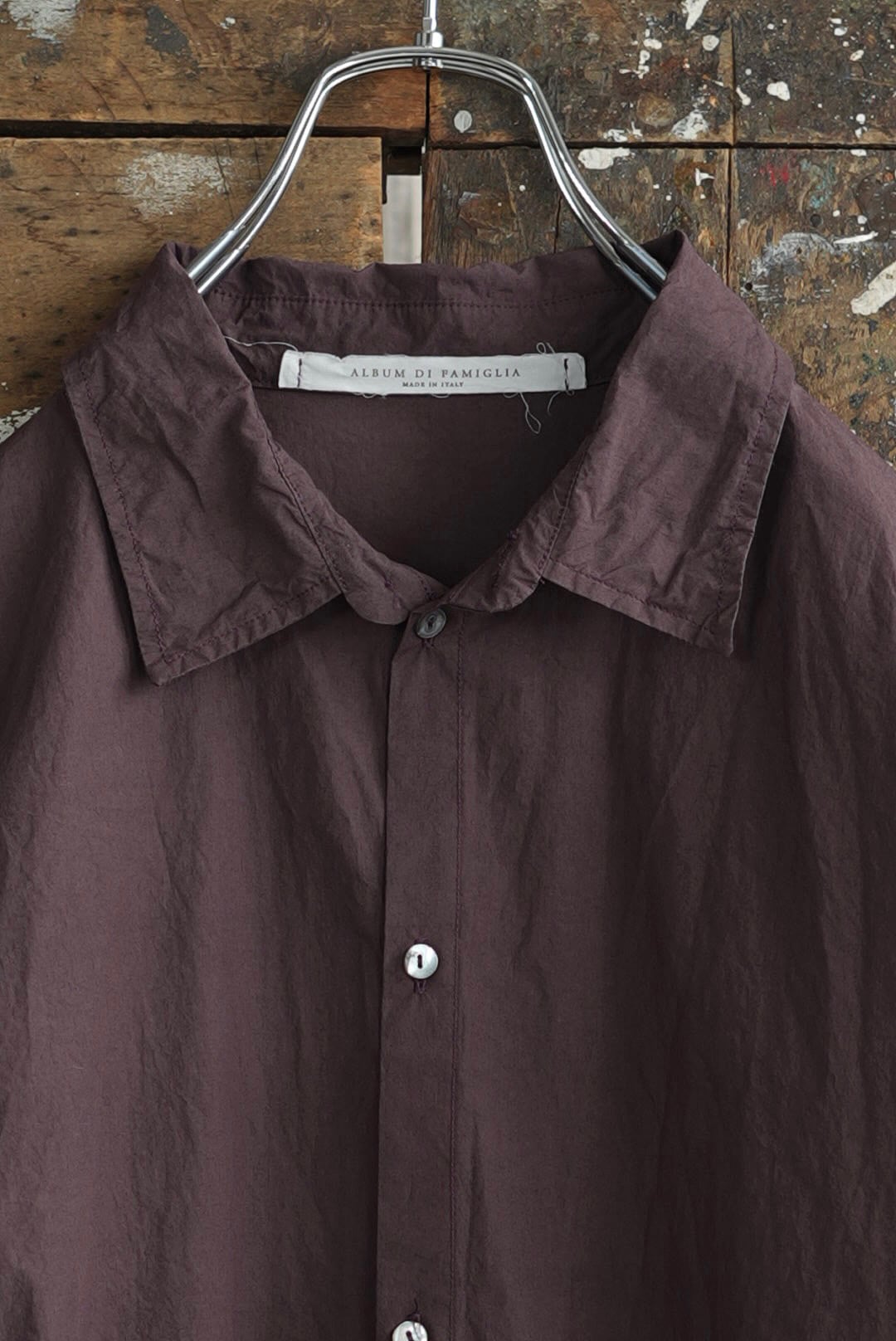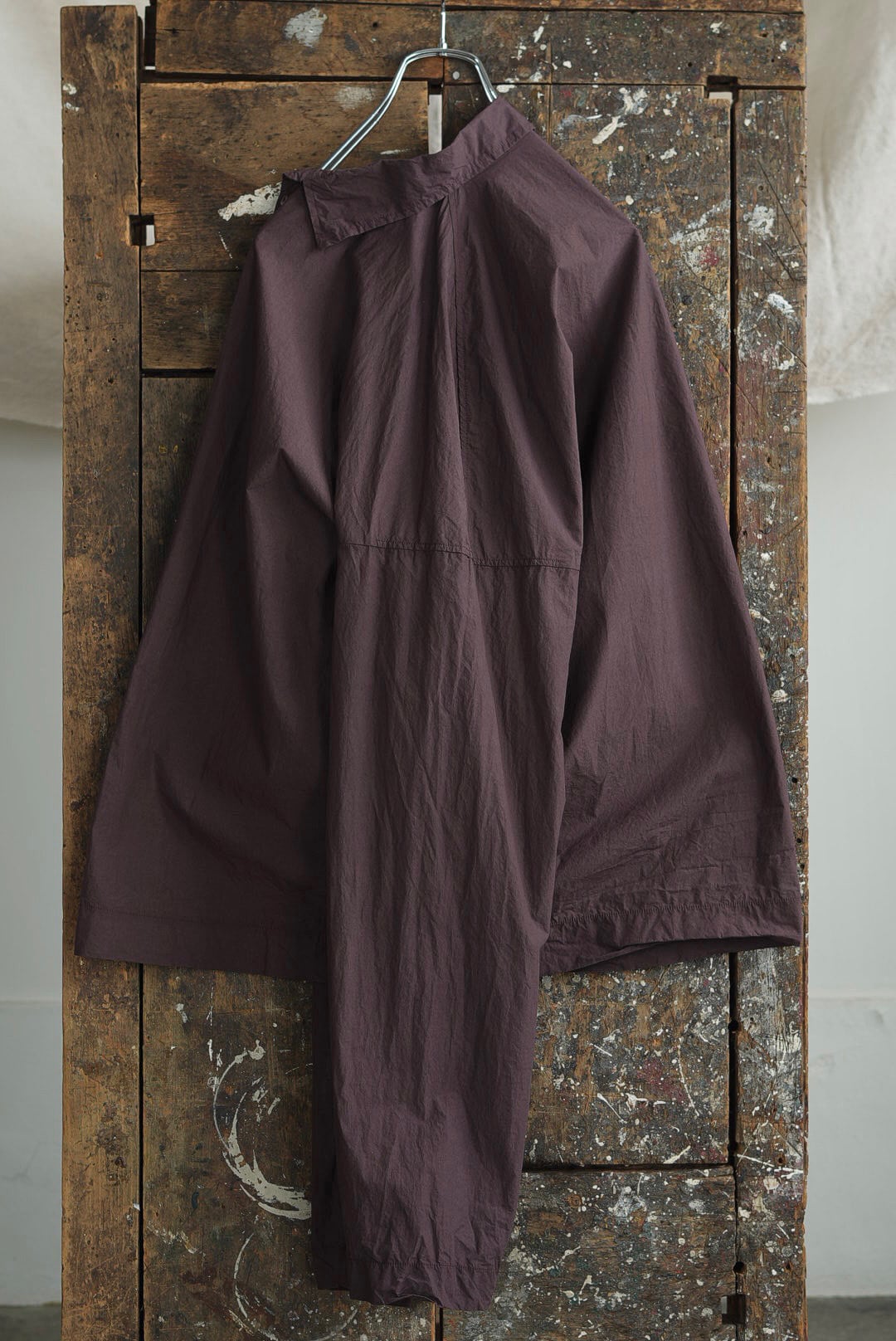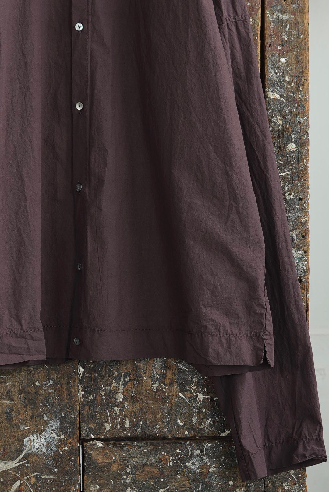 シンプルなドロップショルダーのデイリーウェア。清涼感を持つライトなコットンファブリックを使用。ナロー幅の前立て、細番手で高密度な光沢を帯びる生地の皺が生み出す、色気さえ感じる表情です。エレガントでシックなグレープカラー。スクエア型のシルエットにサイドスリットディティール。拘りを感じるシェルボタン。筒仕様のロンガースリーブを捲りバランスを作る楽しさを。ユニセックス。