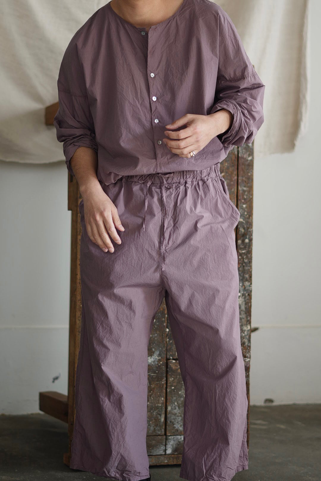 シンプルなドロップショルダーのプルオーバー。清涼感を持つライトなコットンファブリックを使用。細番手で高密度な光沢を帯びる生地の皺が生み出す、色気さえ感じる表情です。薄くアッシュがかったパープル、上品でアンニュイな印象のモーヴカラー。前後段違いのレングスにサイドスリットディティール。拘りを感じるシェルボタン。筒仕様のロンガースリーブを捲りバランスを作る楽しさを。共生地パンツのセットアップスタイリングもリコメンドします。ユニセックス。