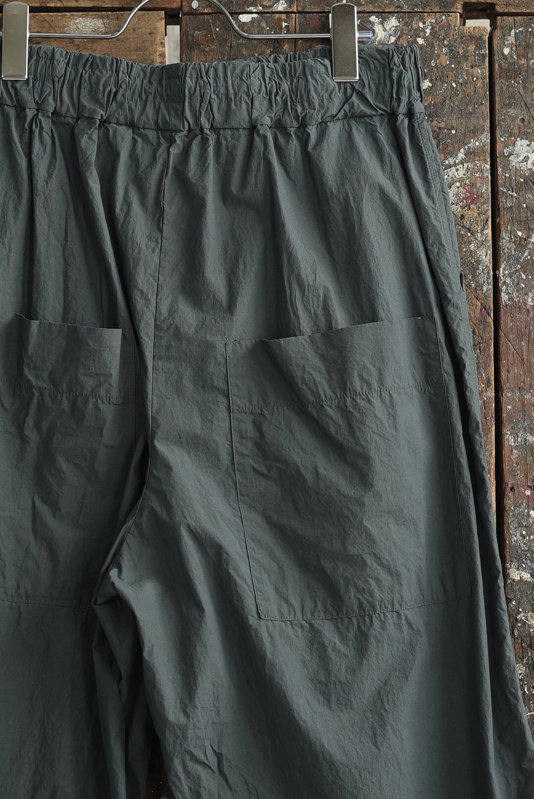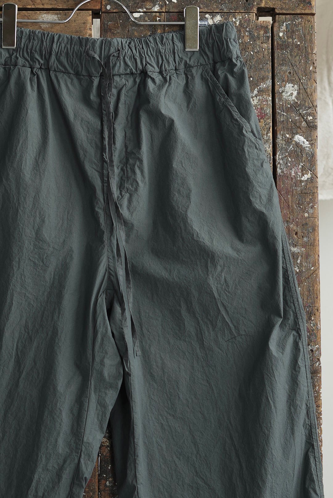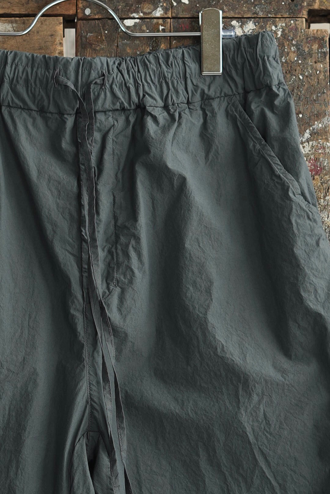ワイドフィット、抜け感のあるシンプルなトラウザーズ。気取らないリラックスシルエットにモードな雰囲気が共存するアイテム。清涼感を持つライトなコットンファブリック。細番手で高密度生地の皺が生み出す、色気さえ感じる表情です。グレーがかったくすみのあるニュアンス、ナチュラルで落ち着きをもったタイムカラー。大振りの外付けバックポケット。ウエストギャザー、調整可能なドローコード仕様(平置きの最小値実寸からも絞り調節が可能です)。ユニセックス。