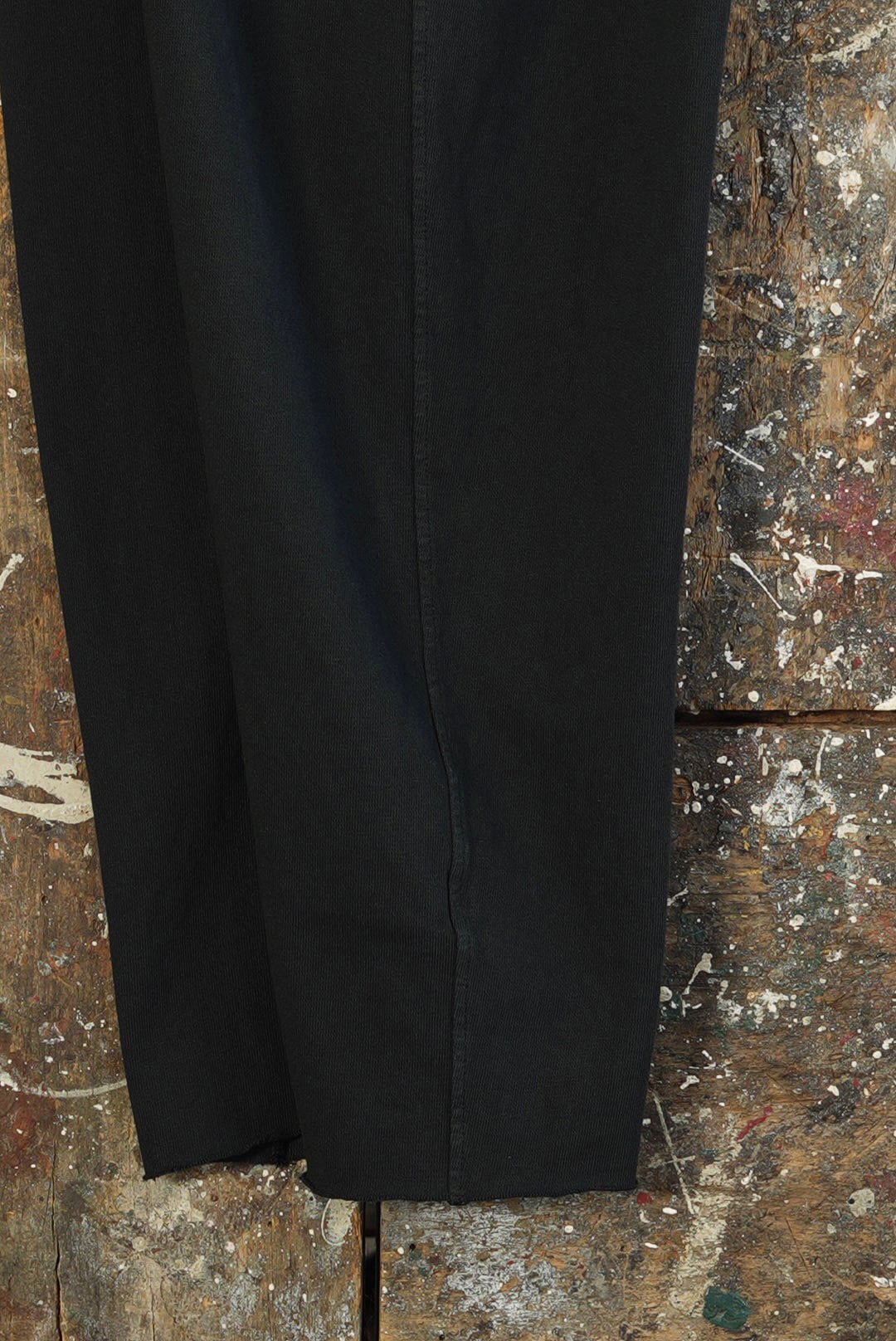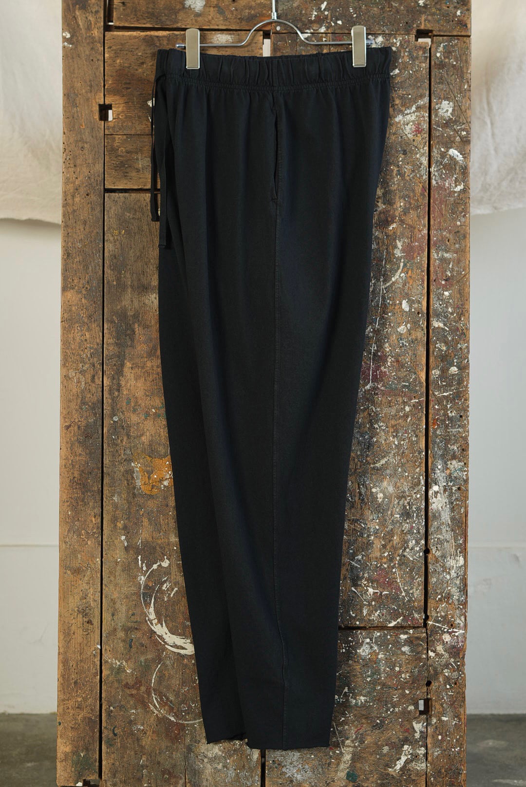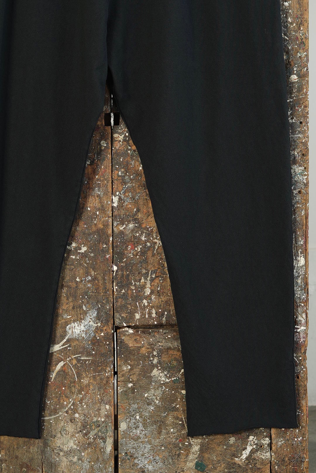ジャージーファブリックのイージーパンツ。リラックスしたモモ周りから、裾にかけてシャープに伸びるラインは品の良さも感じるシルエット。製品染め。柔らかなトーンのブラックカラー。切りっぱなし、ラフな未処理の裾が抜け感を生む、ナチュラルでどこかモードなアイテム。ユニセックス。