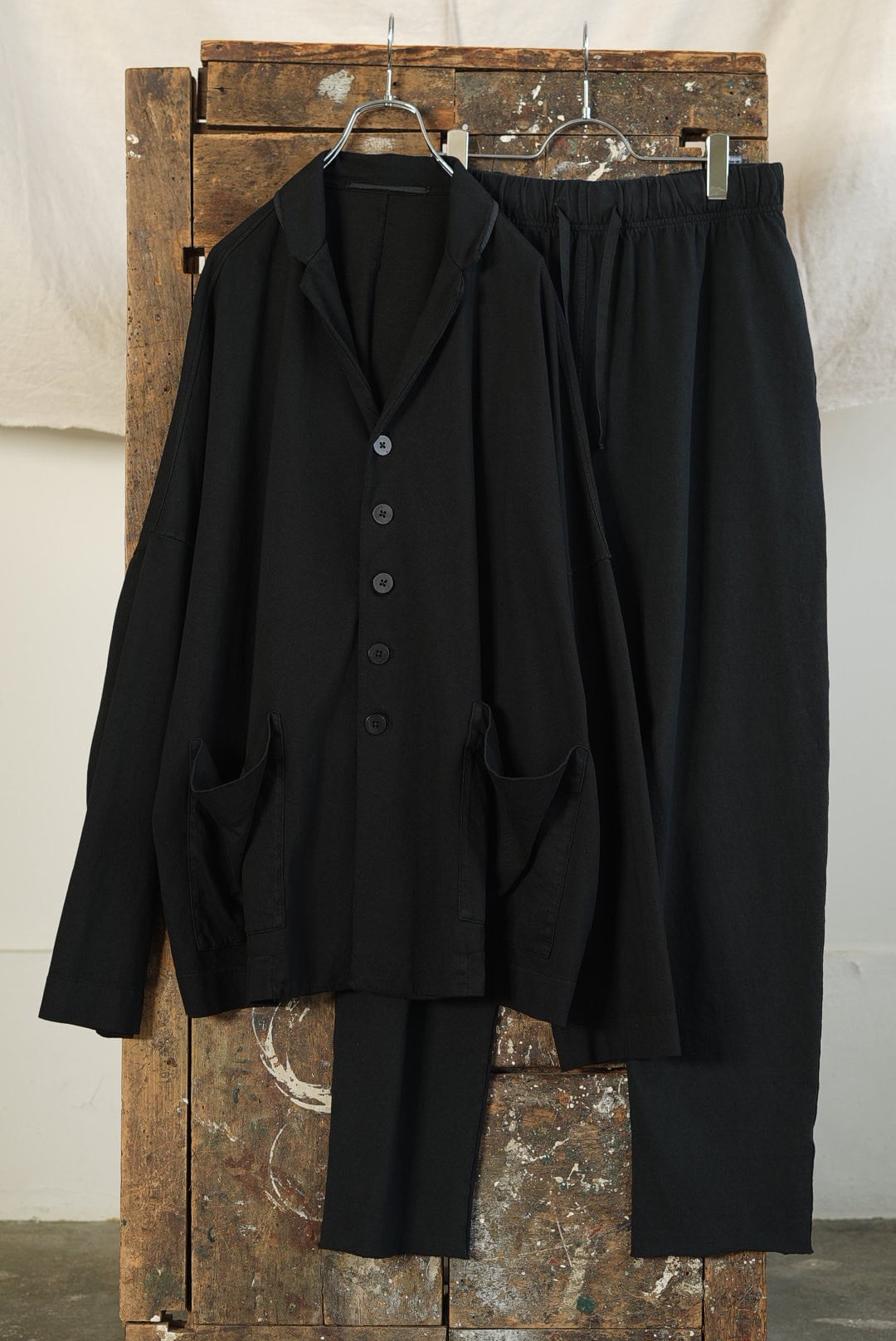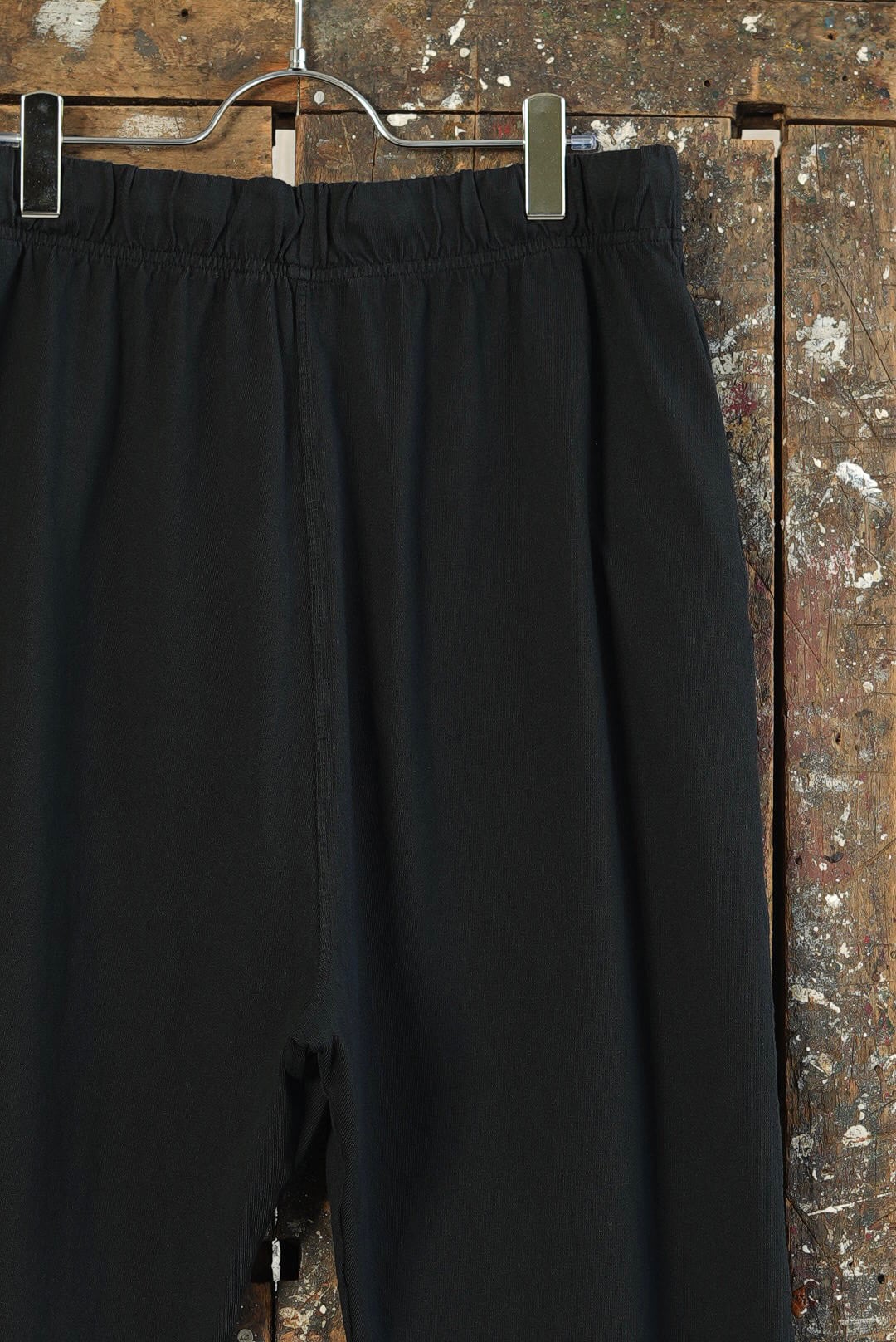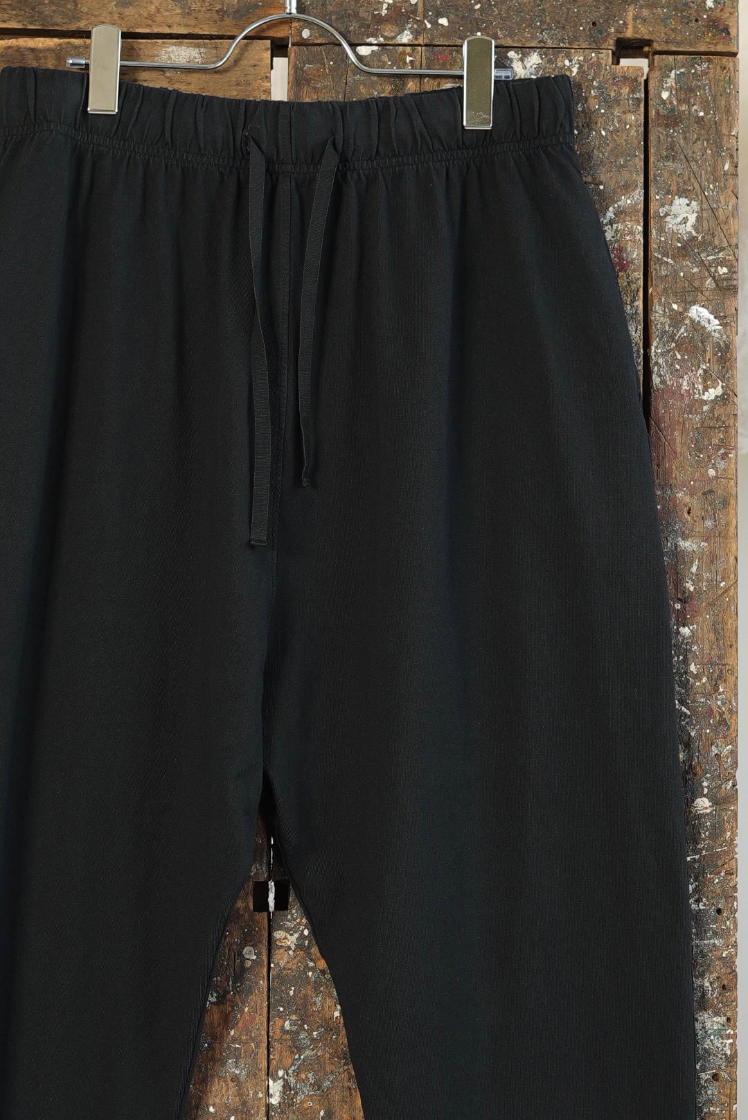 ジャージーファブリックのイージーパンツ。リラックスしたモモ周りから、裾にかけてシャープに伸びるラインは品の良さも感じるシルエット。製品染め。柔らかなトーンのブラックカラー。切りっぱなし、ラフな未処理の裾が抜け感を生む、ナチュラルでどこかモードなアイテム。ユニセックス。