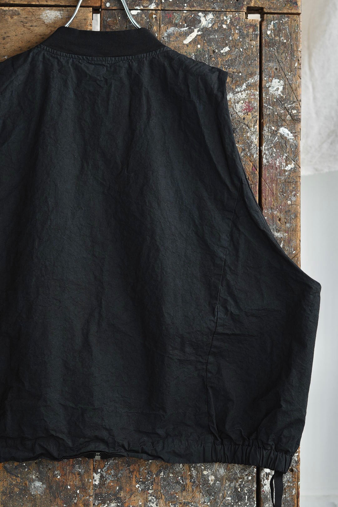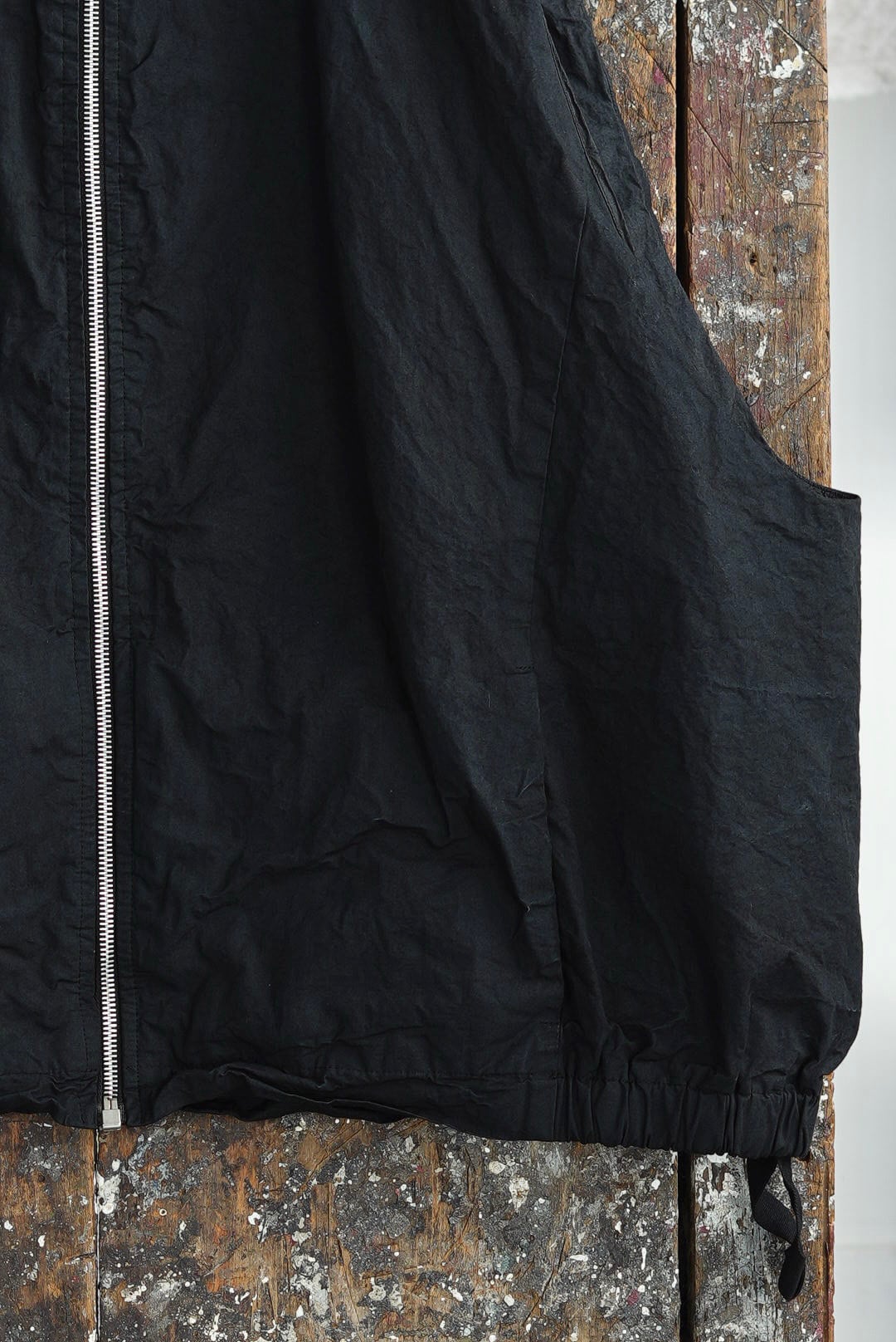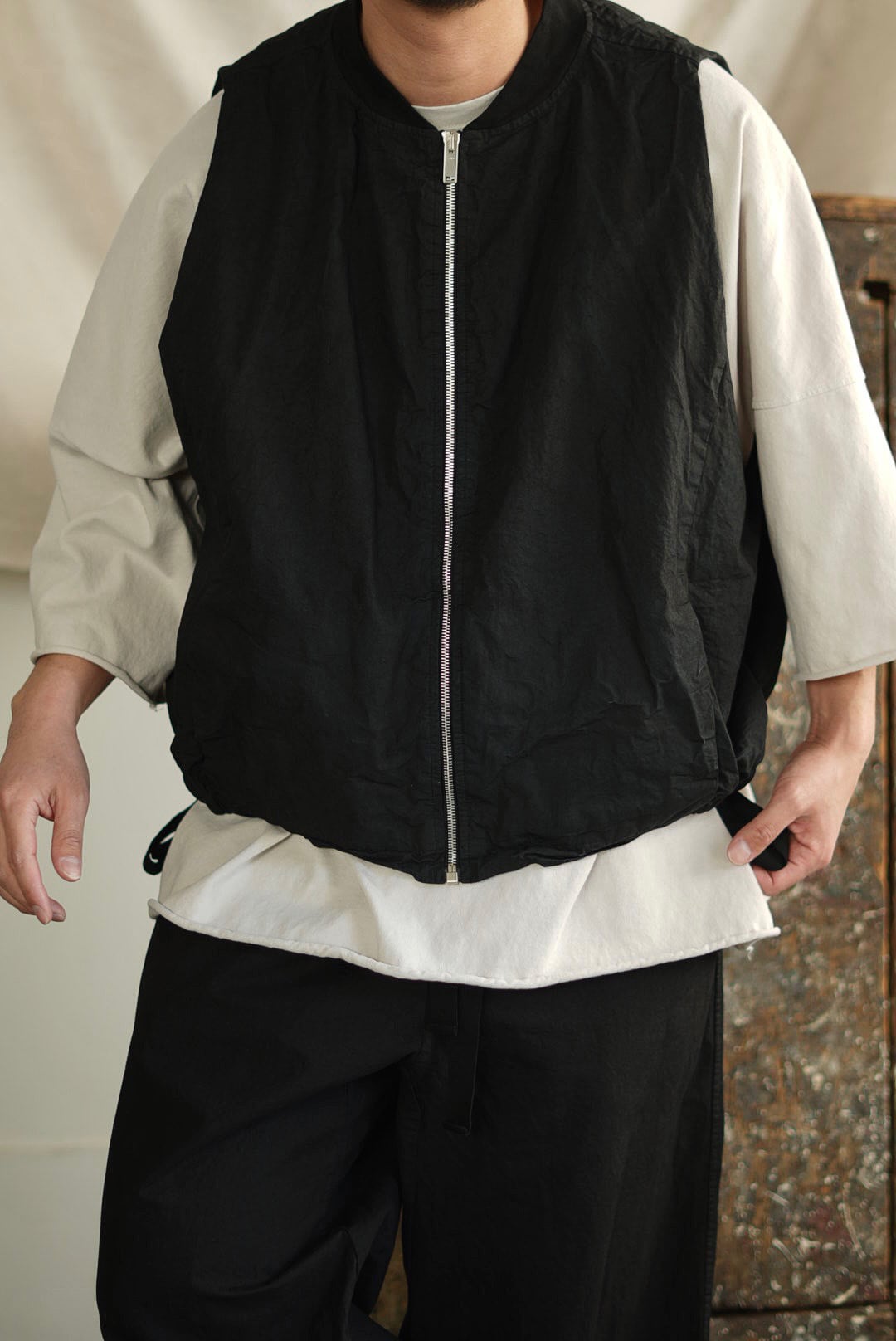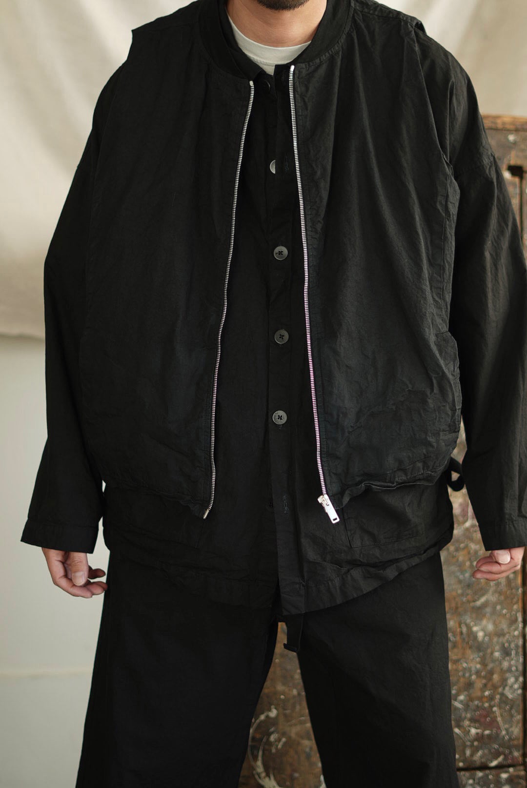 スリーブを取り除いたボンバーベスト。リラックスシルエット。潔いシンプルなシングルジッパー。無駄を削いだミニマルなシームサイドポケット。ヘム内側のドローストリングにより、シルエットの矯正が可能です。高密度でハリのあるコットンファブリックを採用。製品染め、ムラ感を持った表情の良いブラックカラー。フルライニング仕様。アウトサイド・インサイド、幅広いスタイリングのアクセントに。ユニセックス。