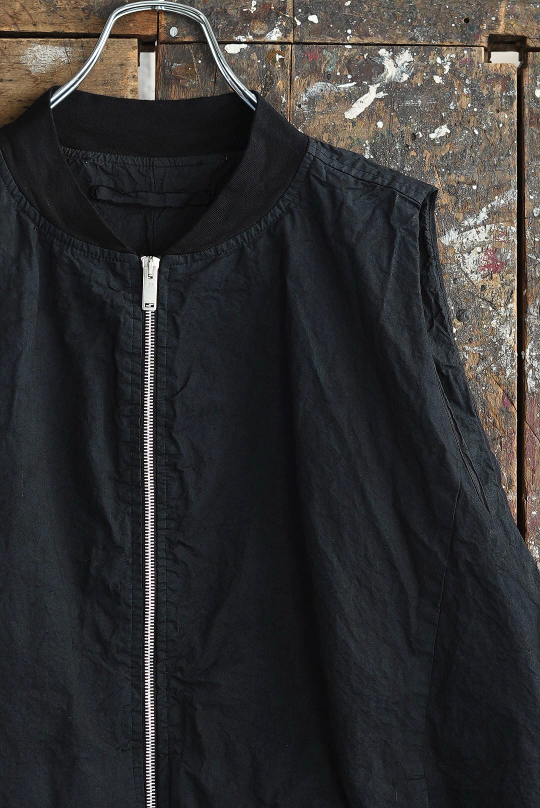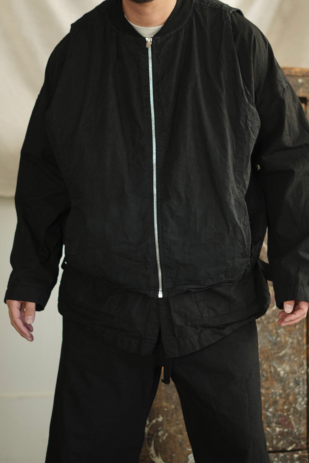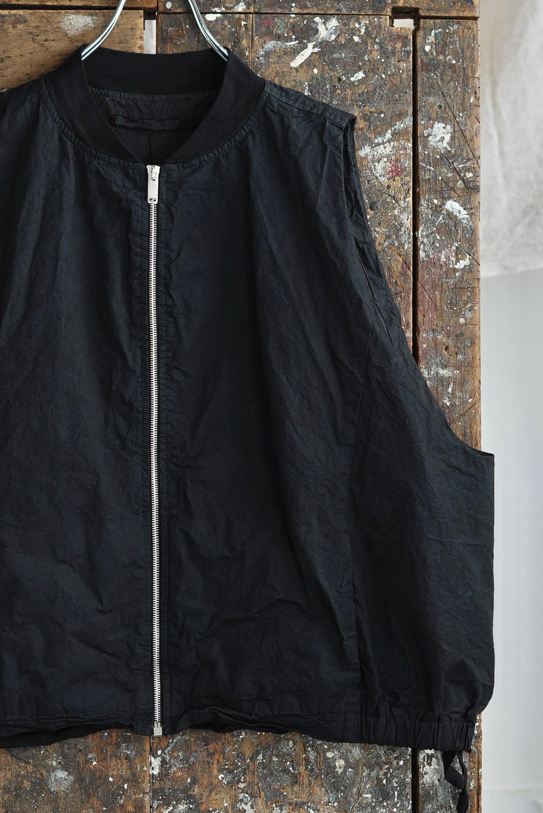 スリーブを取り除いたボンバーベスト。リラックスシルエット。潔いシンプルなシングルジッパー。無駄を削いだミニマルなシームサイドポケット。ヘム内側のドローストリングにより、シルエットの矯正が可能です。高密度でハリのあるコットンファブリックを採用。製品染め、ムラ感を持った表情の良いブラックカラー。フルライニング仕様。アウトサイド・インサイド、幅広いスタイリングのアクセントに。ユニセックス。