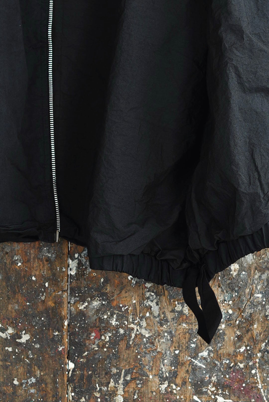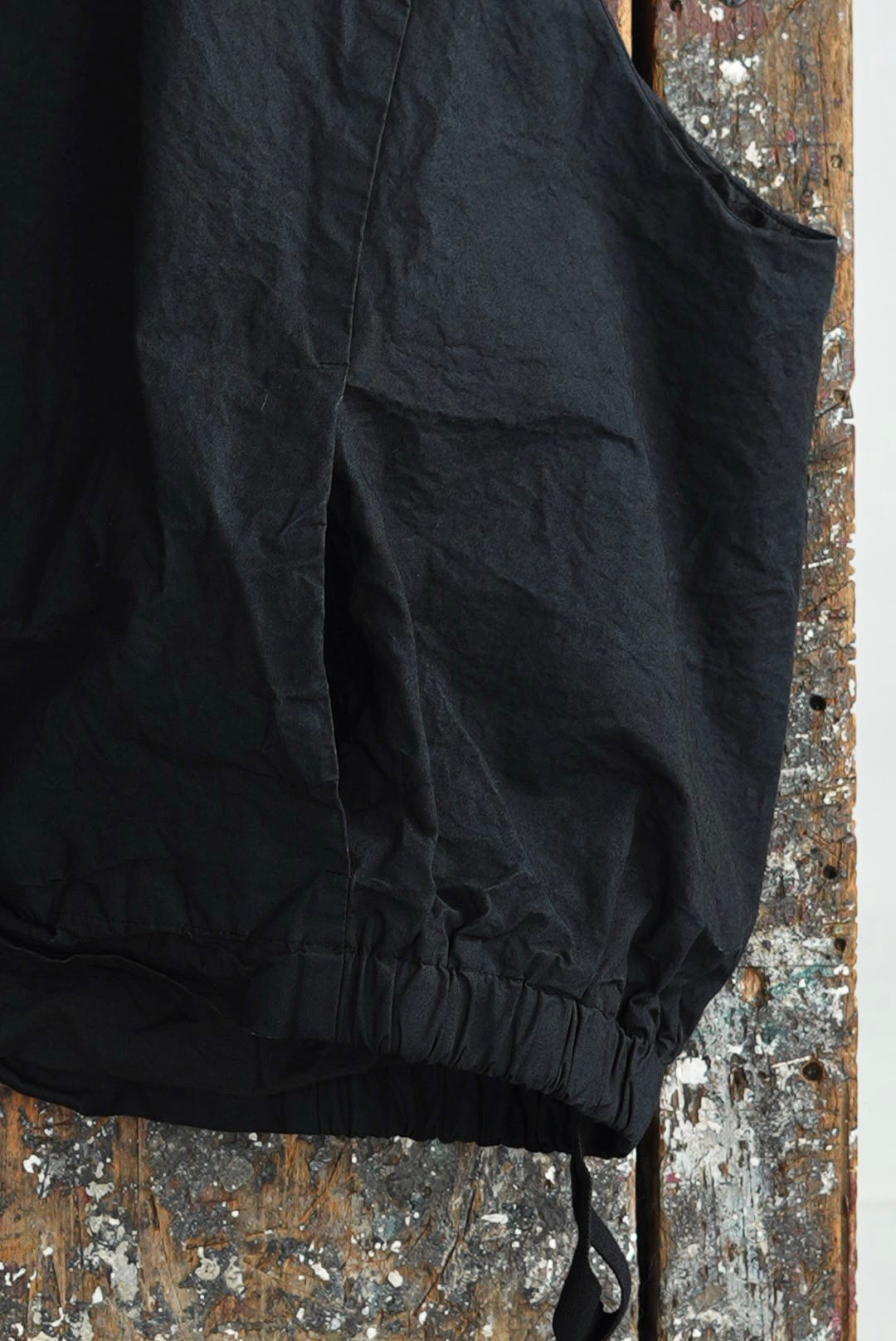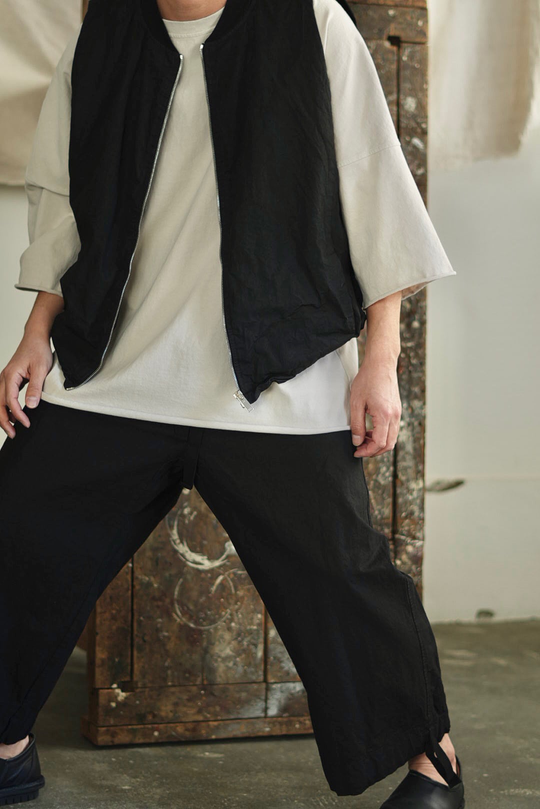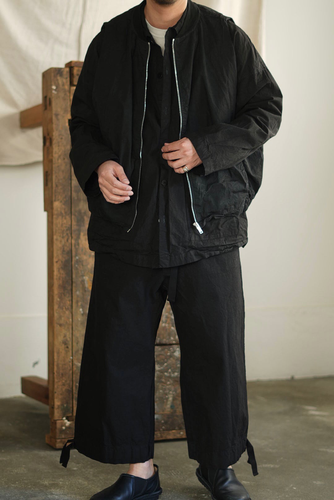 スリーブを取り除いたボンバーベスト。リラックスシルエット。潔いシンプルなシングルジッパー。無駄を削いだミニマルなシームサイドポケット。ヘム内側のドローストリングにより、シルエットの矯正が可能です。高密度でハリのあるコットンファブリックを採用。製品染め、ムラ感を持った表情の良いブラックカラー。フルライニング仕様。アウトサイド・インサイド、幅広いスタイリングのアクセントに。ユニセックス。