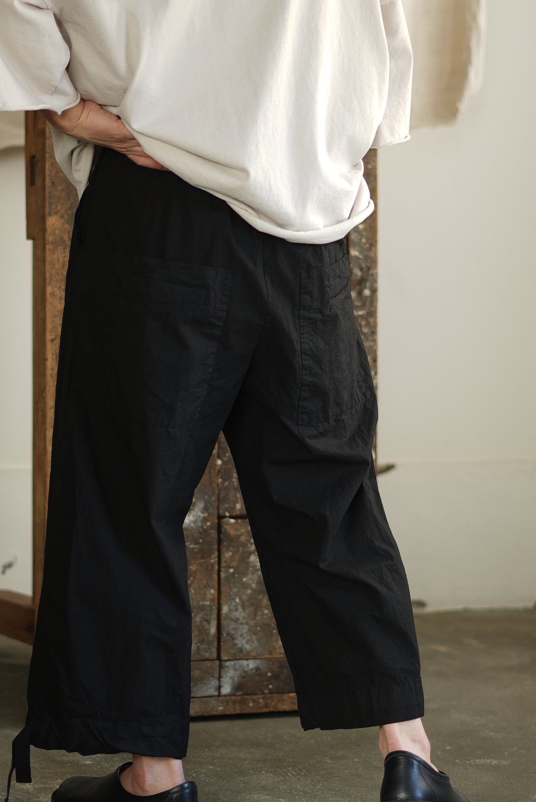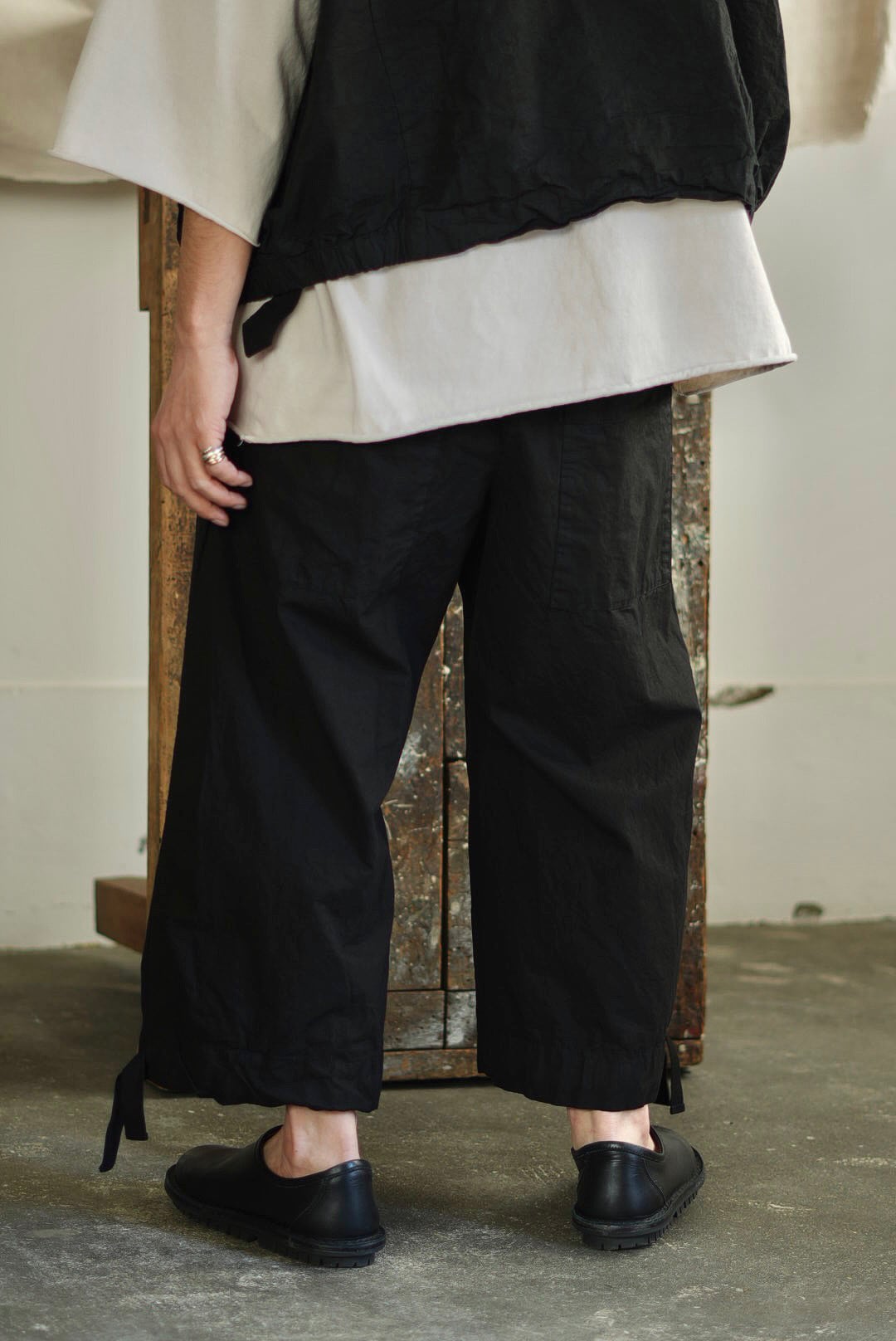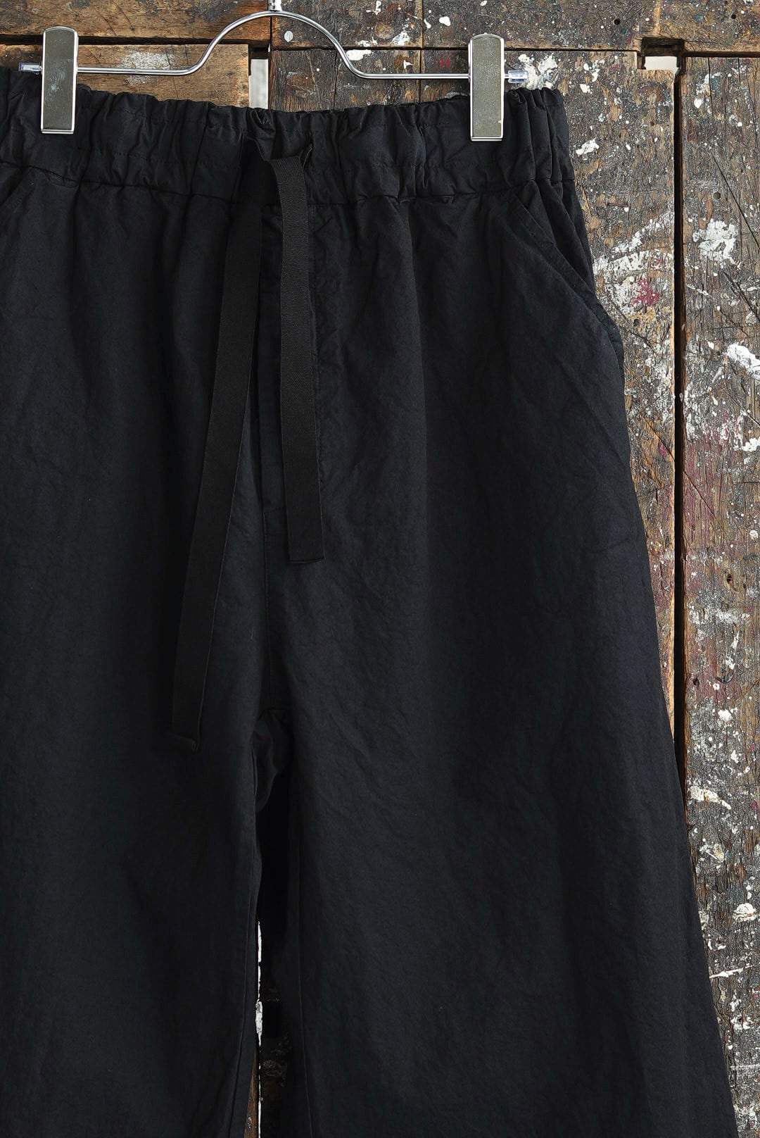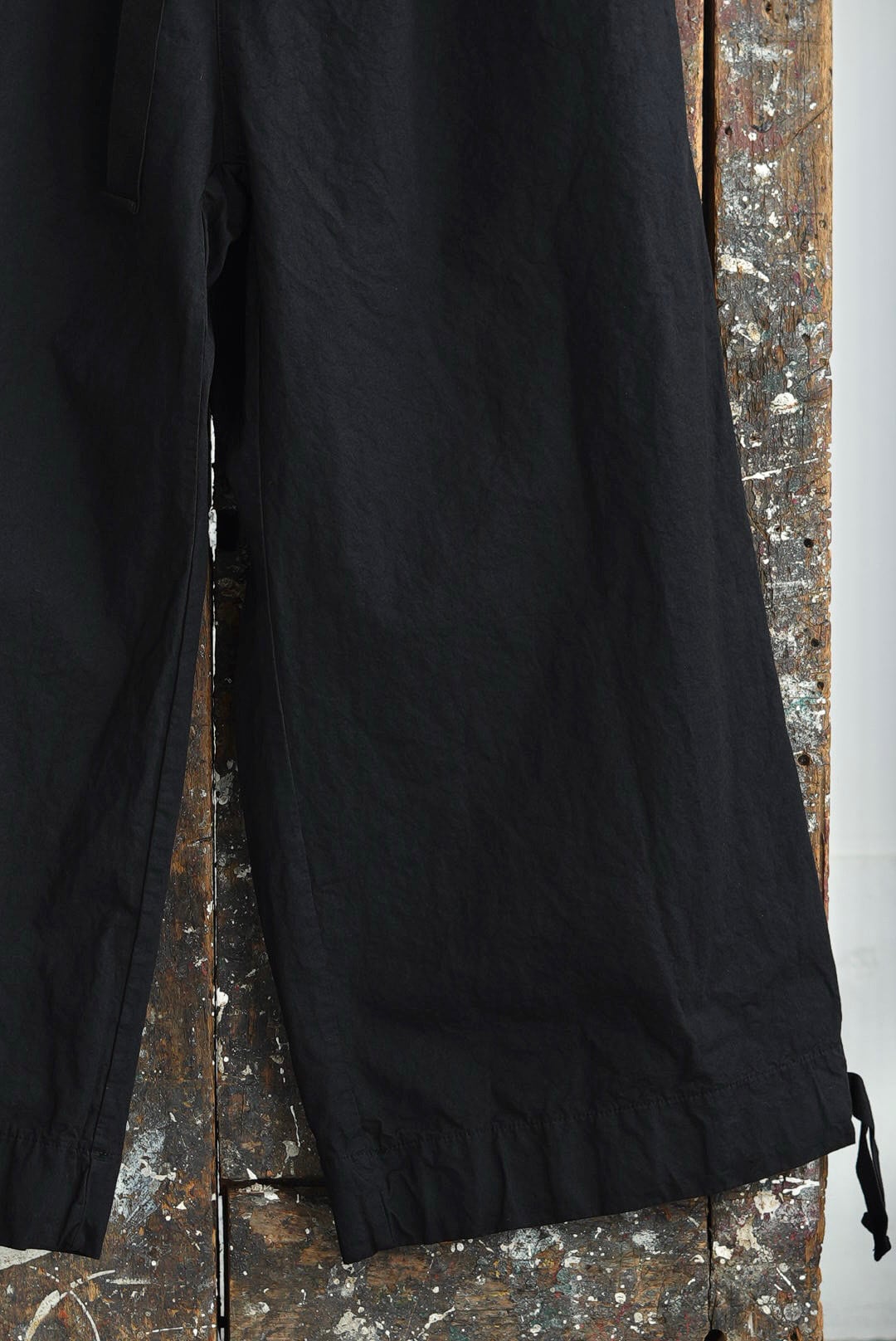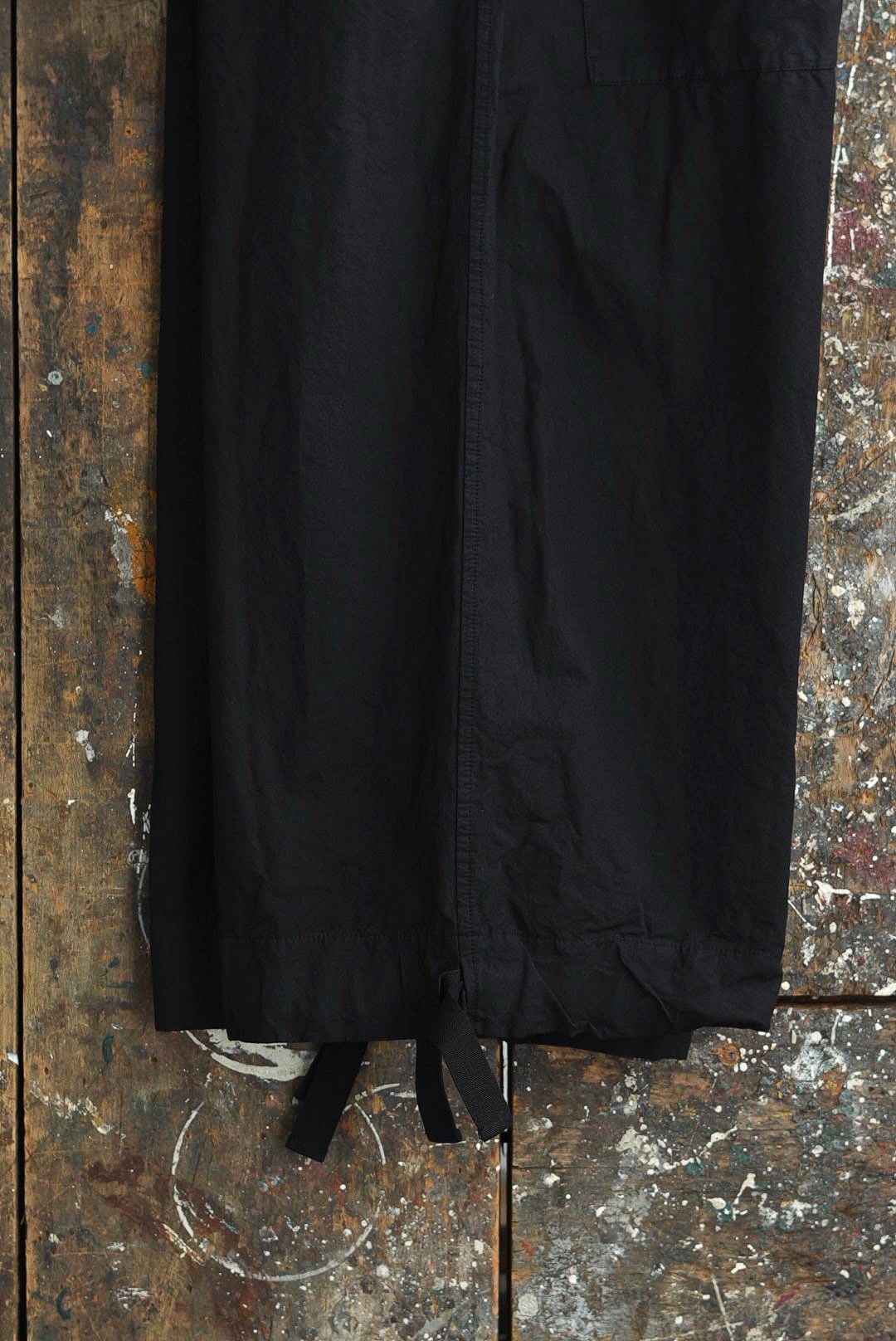 ワイドフィットトラウザーズ。リラックスシルエットにモードな雰囲気が共存するアイテム。高密度でハリのあるコットンファブリック。製品染め、ムラ感を持った表情の良いブラックカラー。大振りの外付けバックポケット。サイドシームのヘムにスタイルの変化を楽しむ為のコード付き。エラスティックウエストにドローコード仕様。ユニセックス。