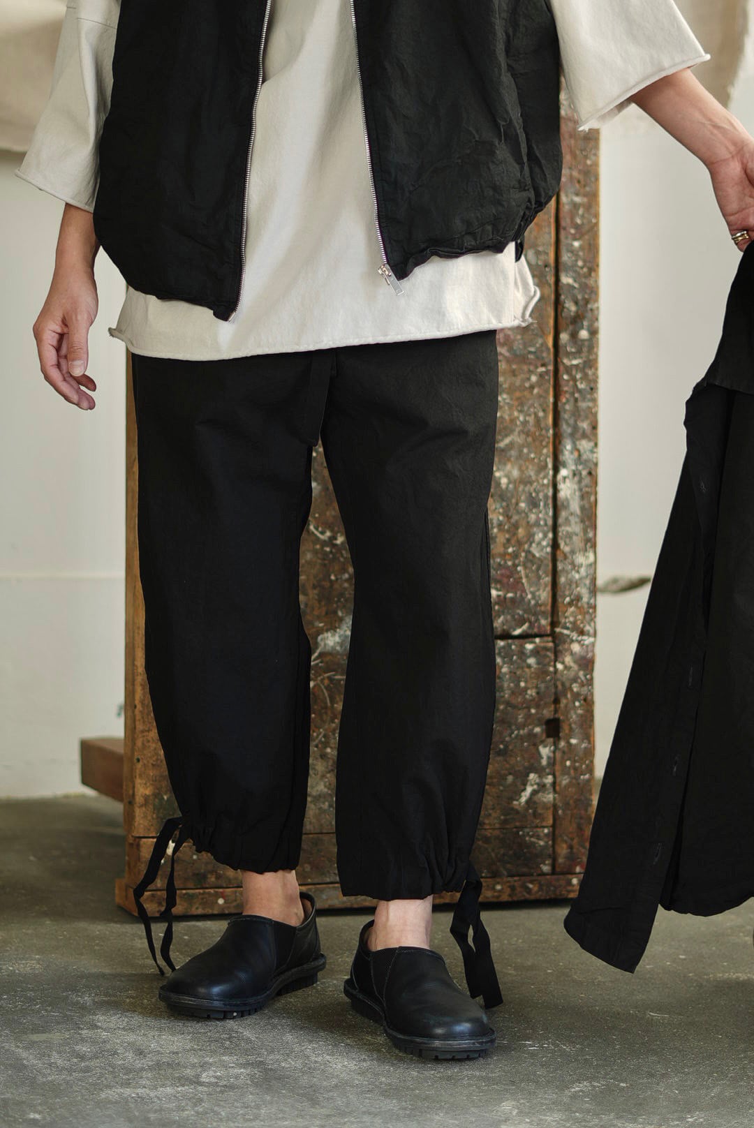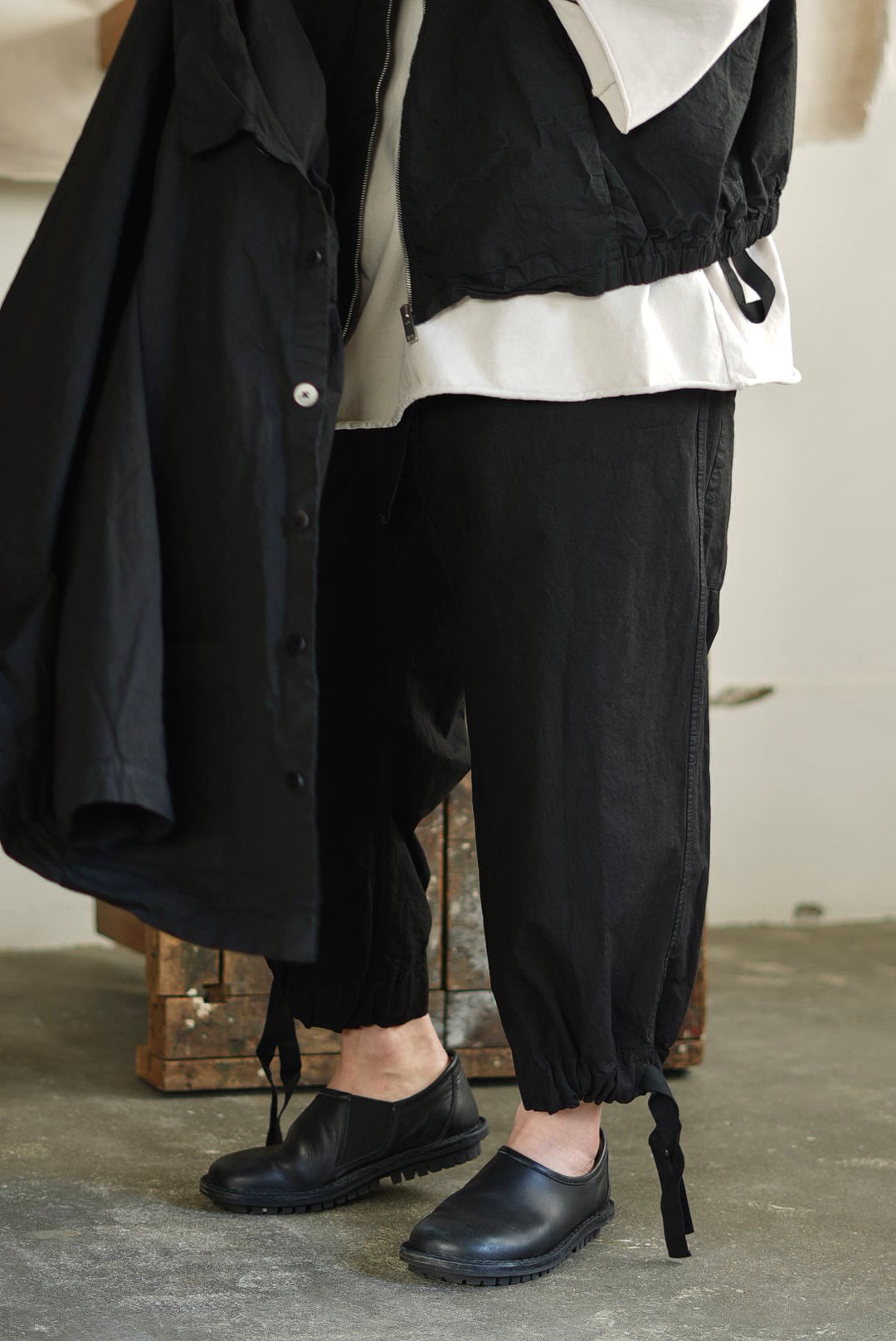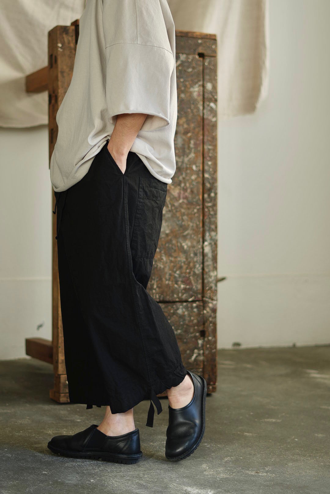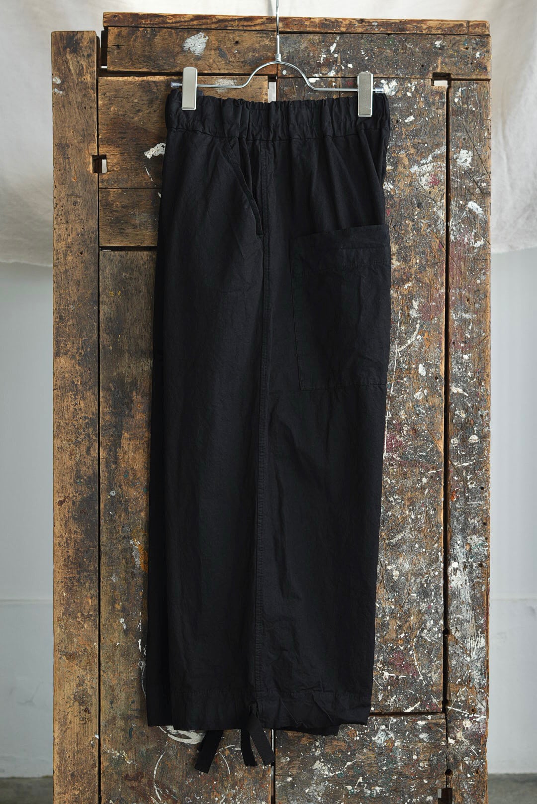 ワイドフィットトラウザーズ。リラックスシルエットにモードな雰囲気が共存するアイテム。高密度でハリのあるコットンファブリック。製品染め、ムラ感を持った表情の良いブラックカラー。大振りの外付けバックポケット。サイドシームのヘムにスタイルの変化を楽しむ為のコード付き。エラスティックウエストにドローコード仕様。ユニセックス。