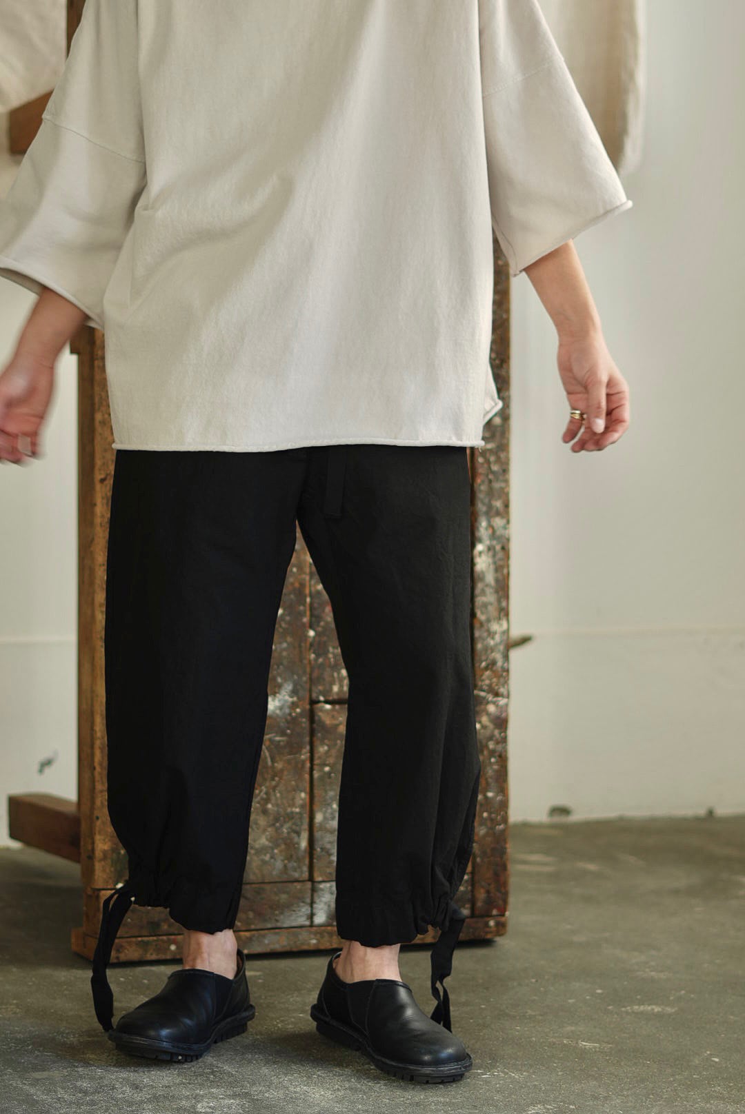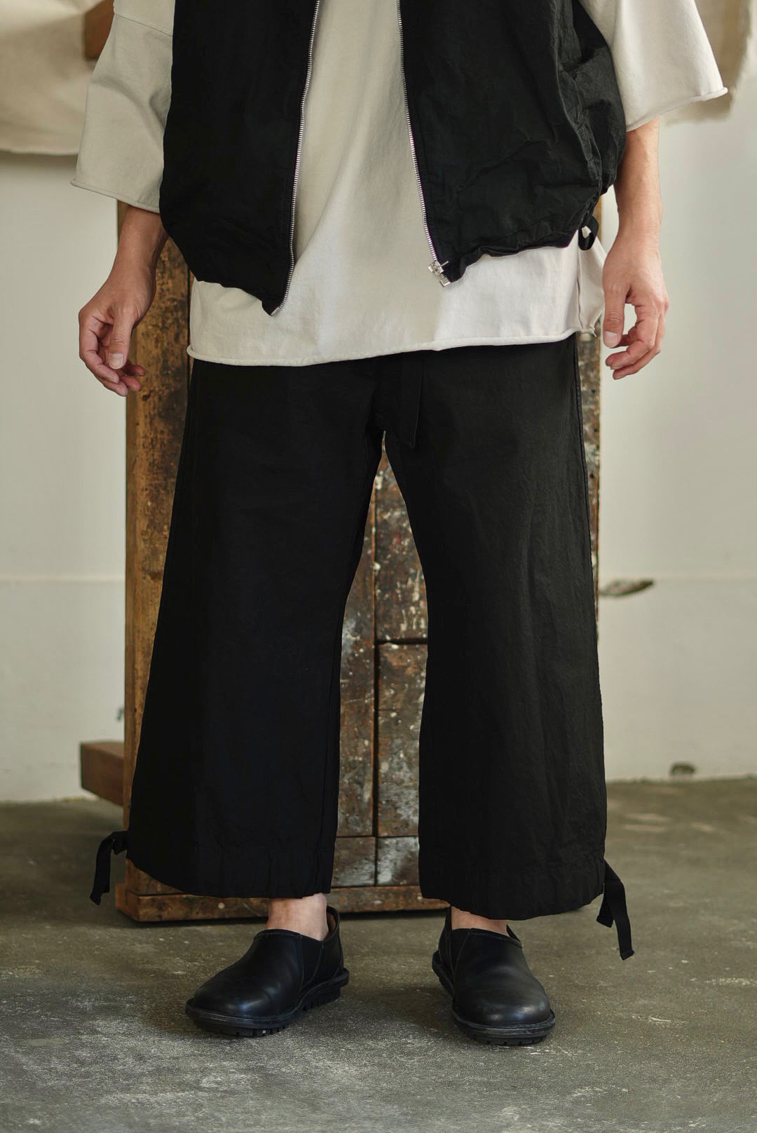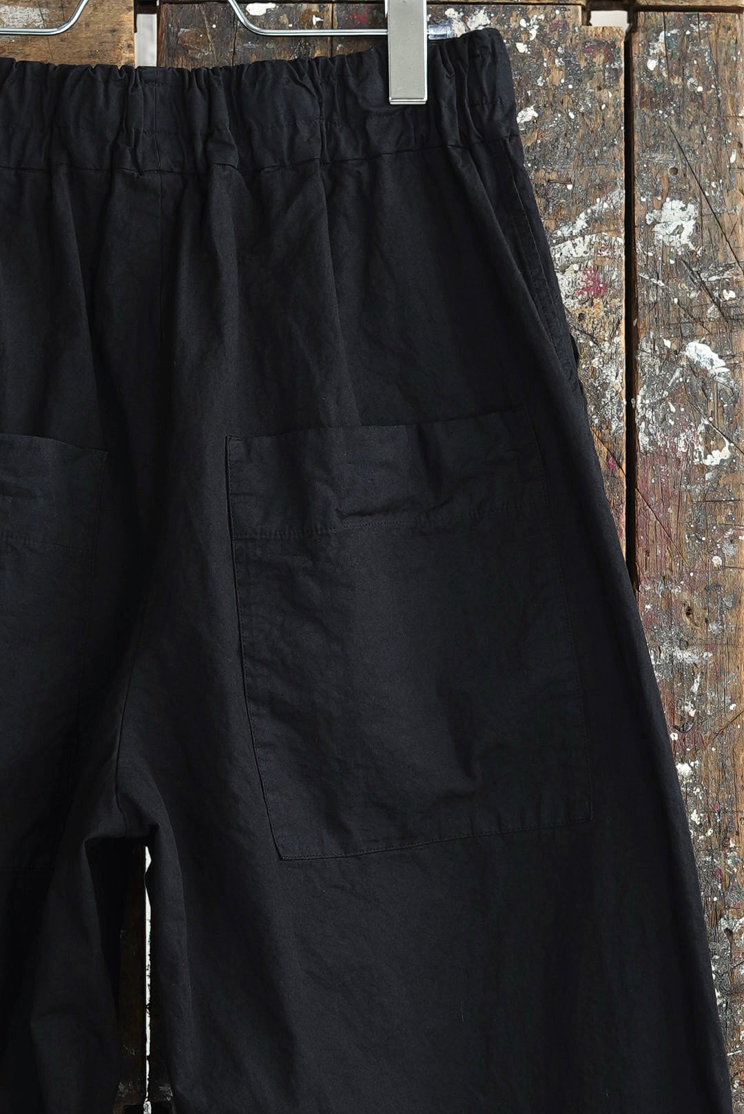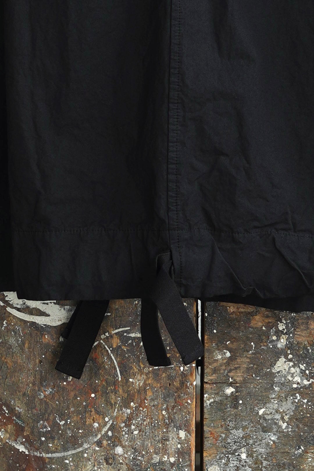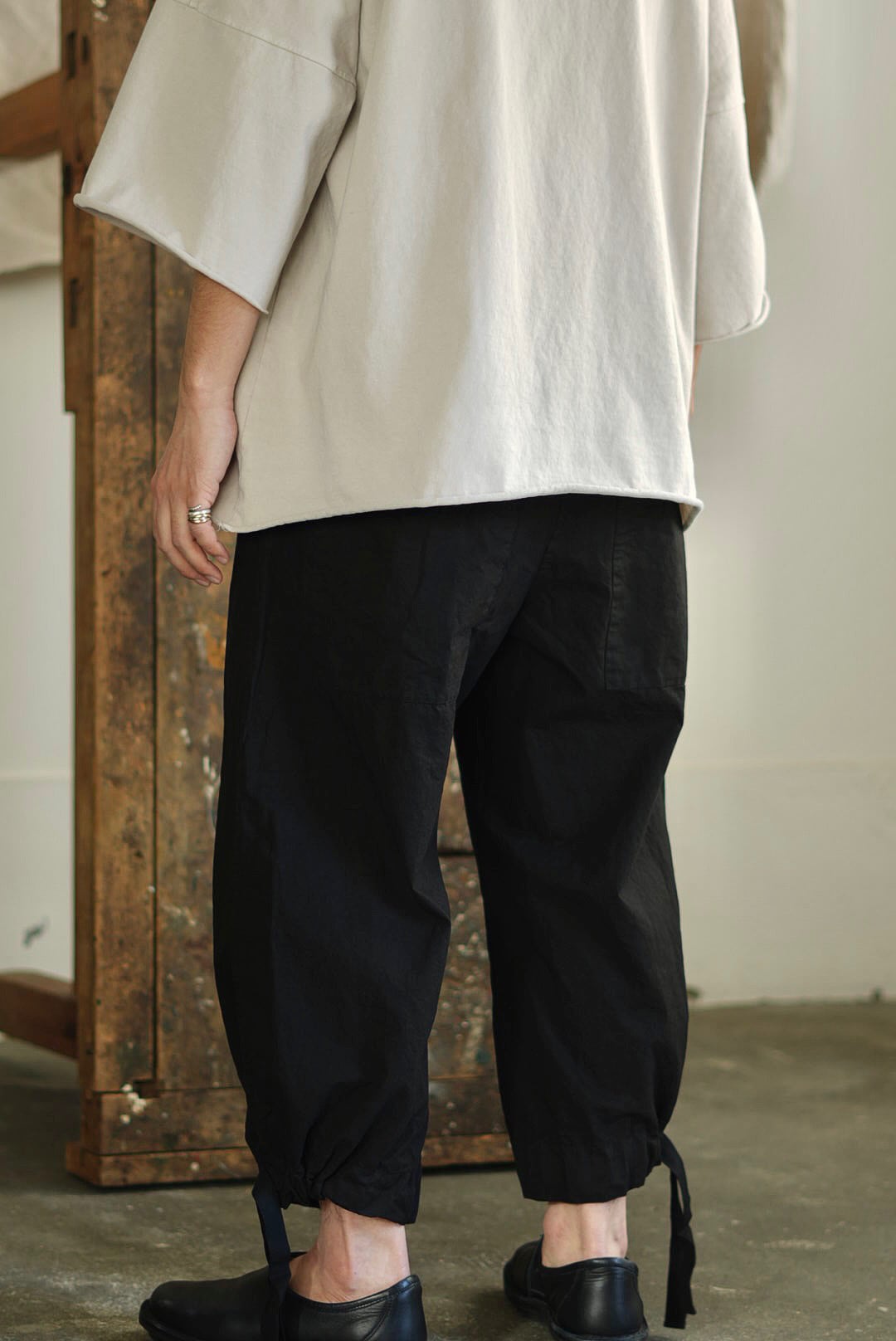 ワイドフィットトラウザーズ。リラックスシルエットにモードな雰囲気が共存するアイテム。高密度でハリのあるコットンファブリック。製品染め、ムラ感を持った表情の良いブラックカラー。大振りの外付けバックポケット。サイドシームのヘムにスタイルの変化を楽しむ為のコード付き。エラスティックウエストにドローコード仕様。ユニセックス。