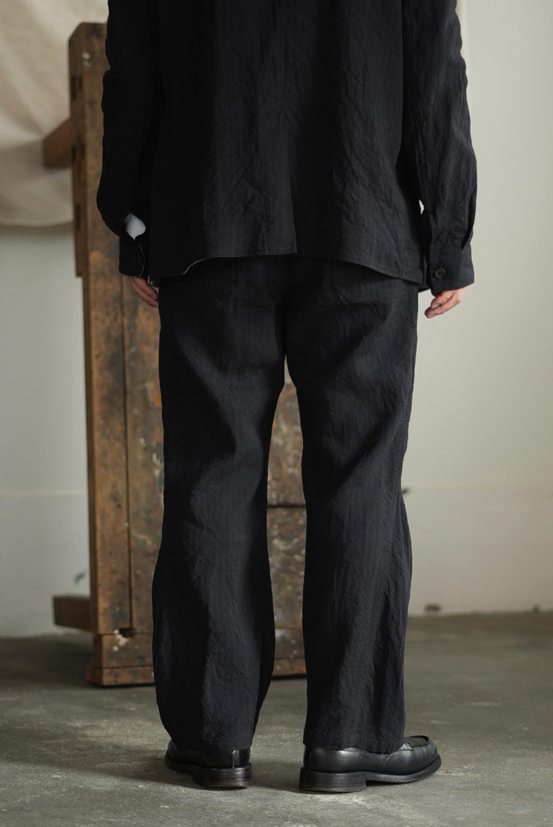 ファブリックを探求し続ける「FORME D'EXPRESSION」。シーズン毎に異なる素材・生地を用いて製作される、ブランドの美学が宿るシグネチャーアイテムの一つ。サイドシームから膝中心にかけてダーツを入れることで、空間の「歪み(SKEWED)」を創出。5ポケットパンツという普遍的な様式に立体的な独創性を加えたデザイン。リネン特有の凛としたハリ感に、ビスコースがもたらすシルクのような艶と滑らかな肌触り。それらが融合した美しいドレープ性を備えるファブリックを使用。ツイルとヘリンボーンが織りなすミックスパターンは、光の加減で刹那の影のように繊細なストライプを浮かび上がらせます。モダンなソフトモノトーンの"OFF BLACK"カラー。共生地ジャケットとの品格が漂うセットアップスタイリングもリコメンドします。