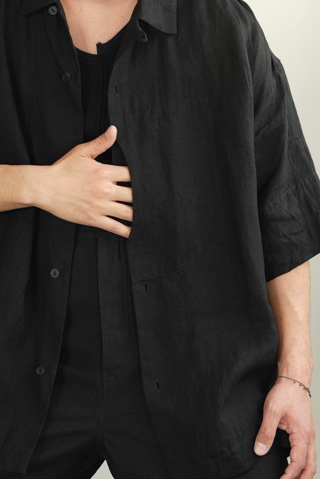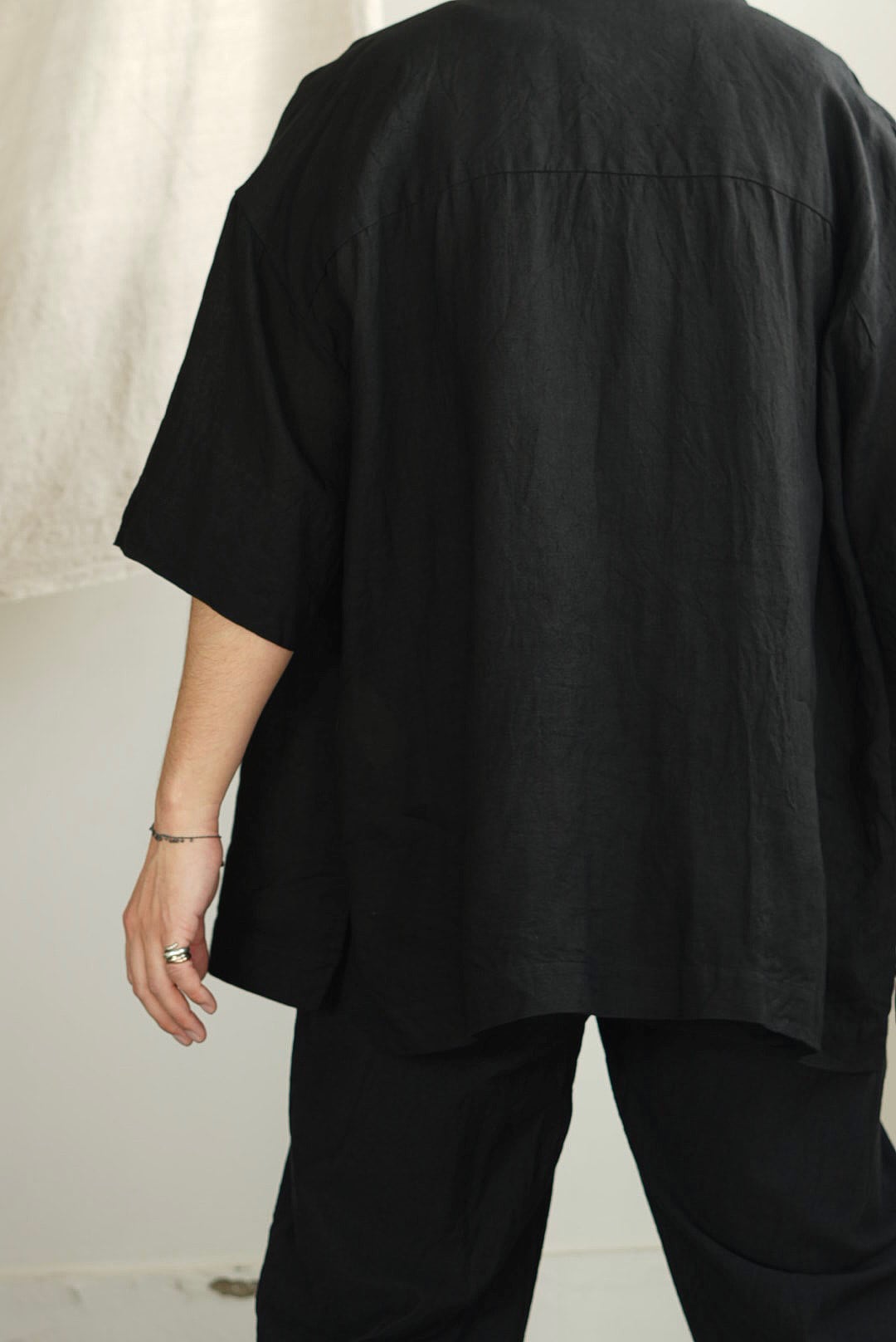 中央にクレセントポケットがデザインされた、リラックス感のあるボックスシルエットのキャンプシャツ。「肘にかかるハーフスリーブ」/「スリーブヘムから約100mmの位置に設定されたタタキ幅」/「広めに設定されたバックヨーク」/「前後段違いのレングスにサイドのミディアムスリット」。これらのディティールにより、ドレープが際⽴つことで品の良さを感じます。細糸で軽さがありながらも、アイテムのドレープ感に合わせた滑り気と重みを感じる色気をもったマットなファブリックを使用。