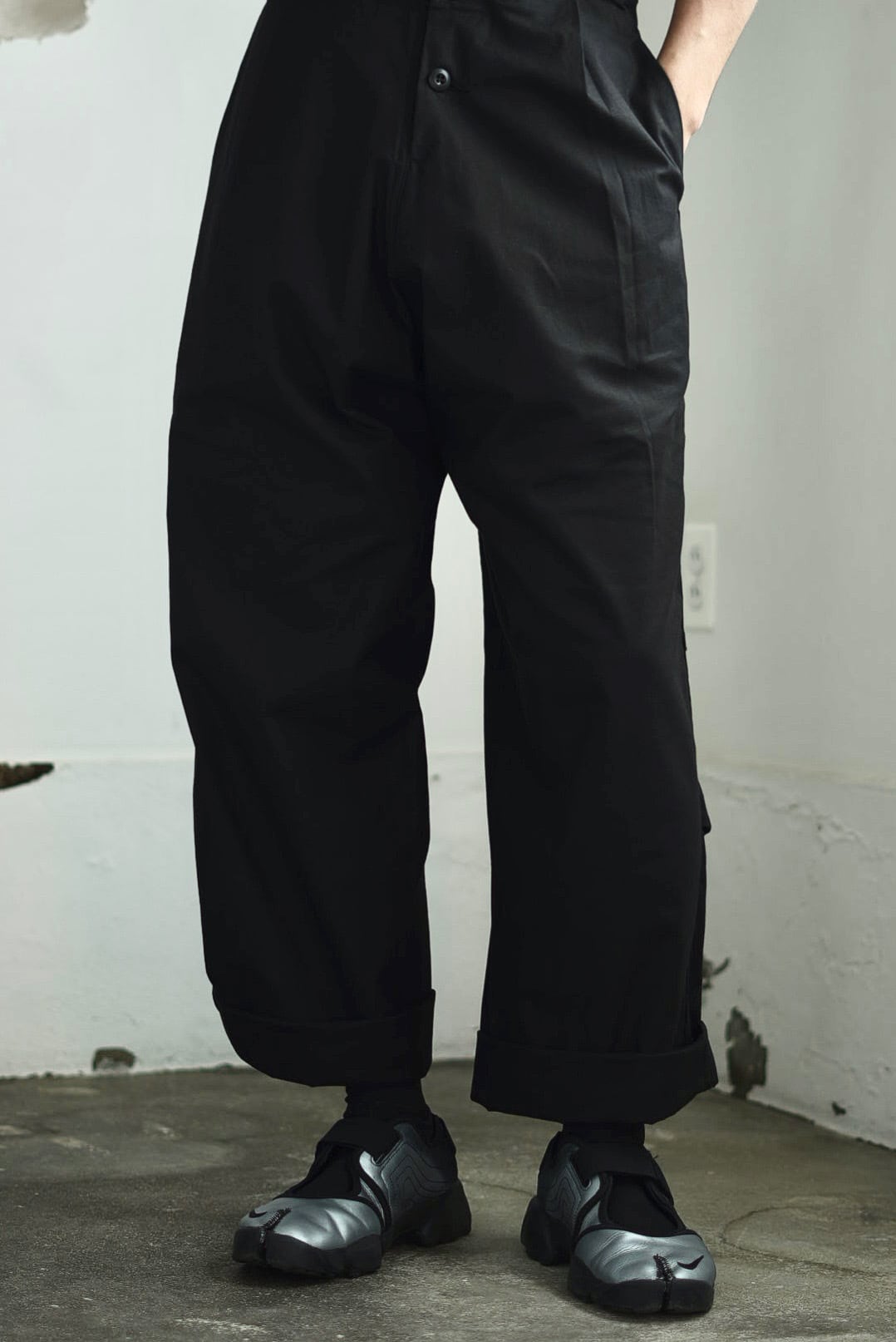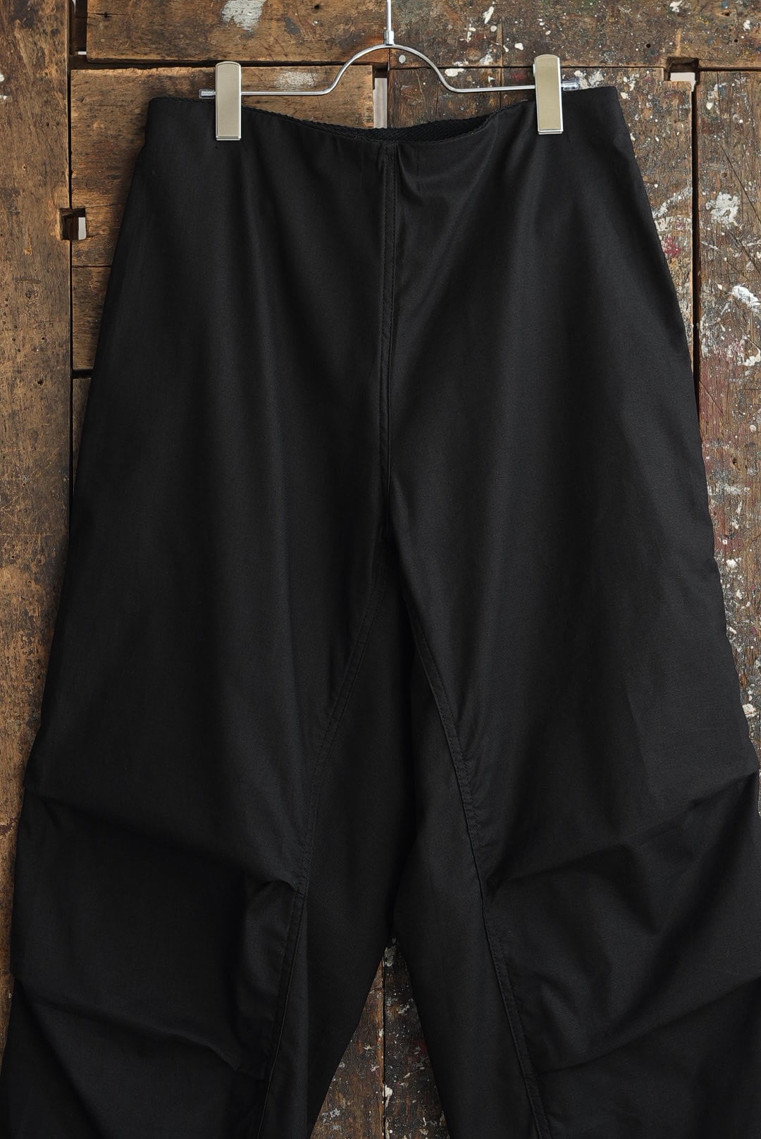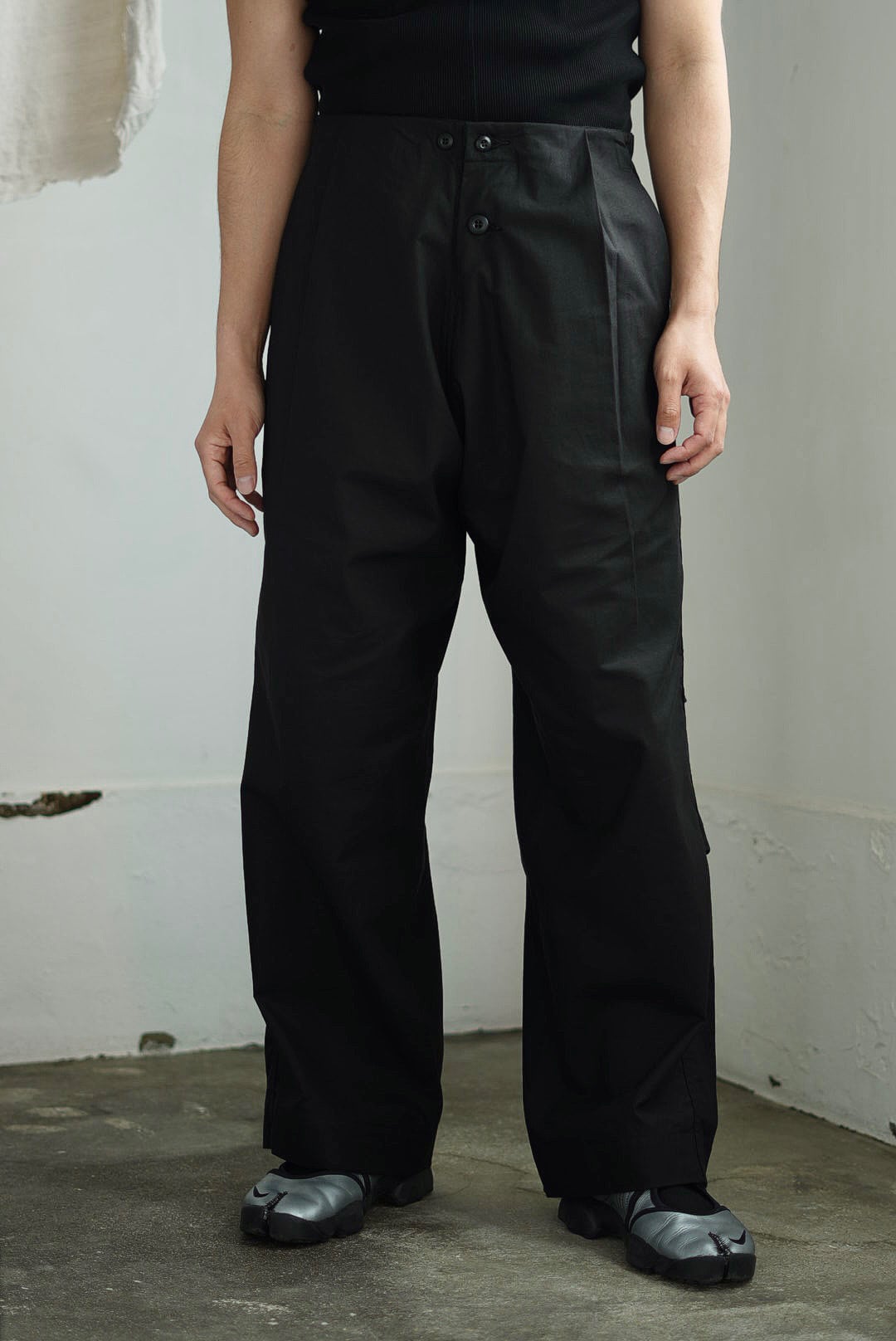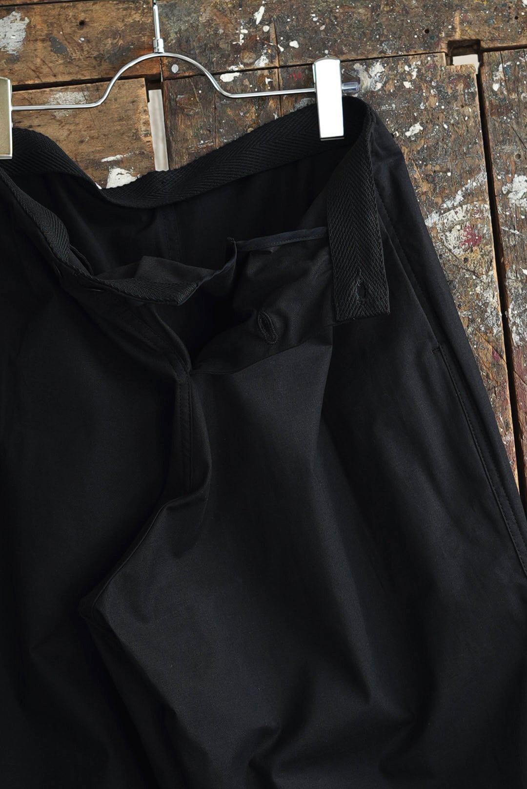 腰に引っ掛けて履く、バック・トゥ・フロントパターンのパジャマパンツ。前中心にアジャストボタン(約-4cm調整が可能)。糊をきかせた法被用の綿シーティング。裾の折り返しにてレングスバランスをとる、無限のスタイルを持ったデザイン。