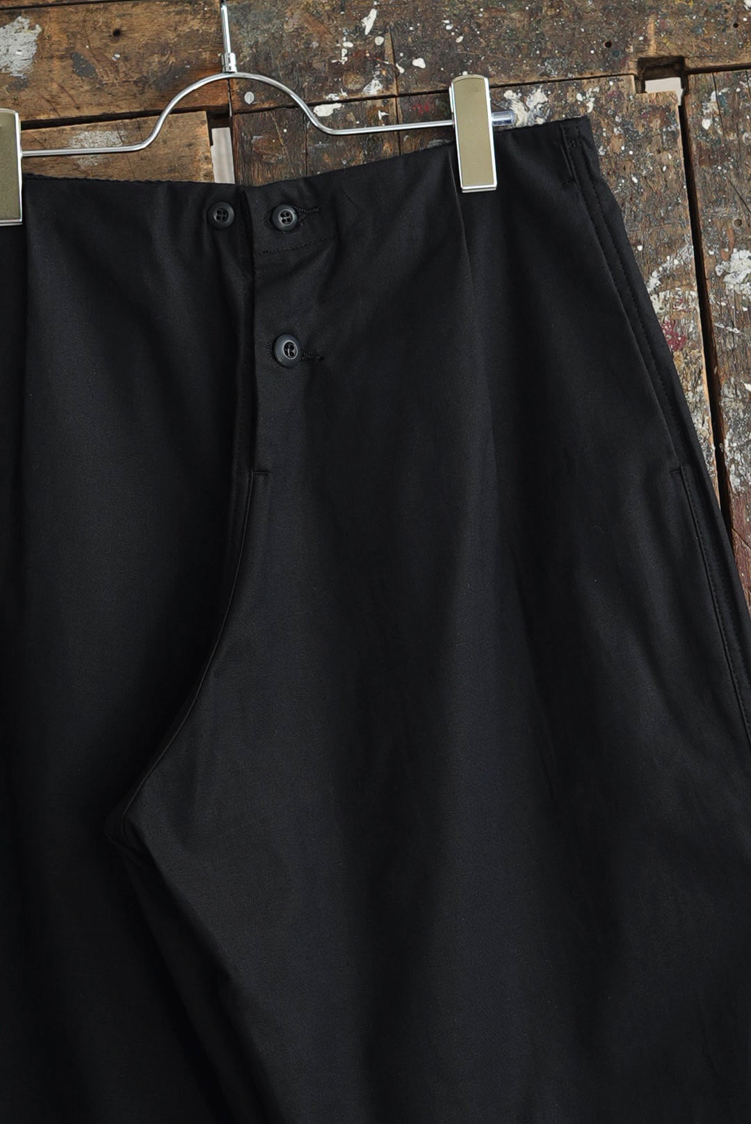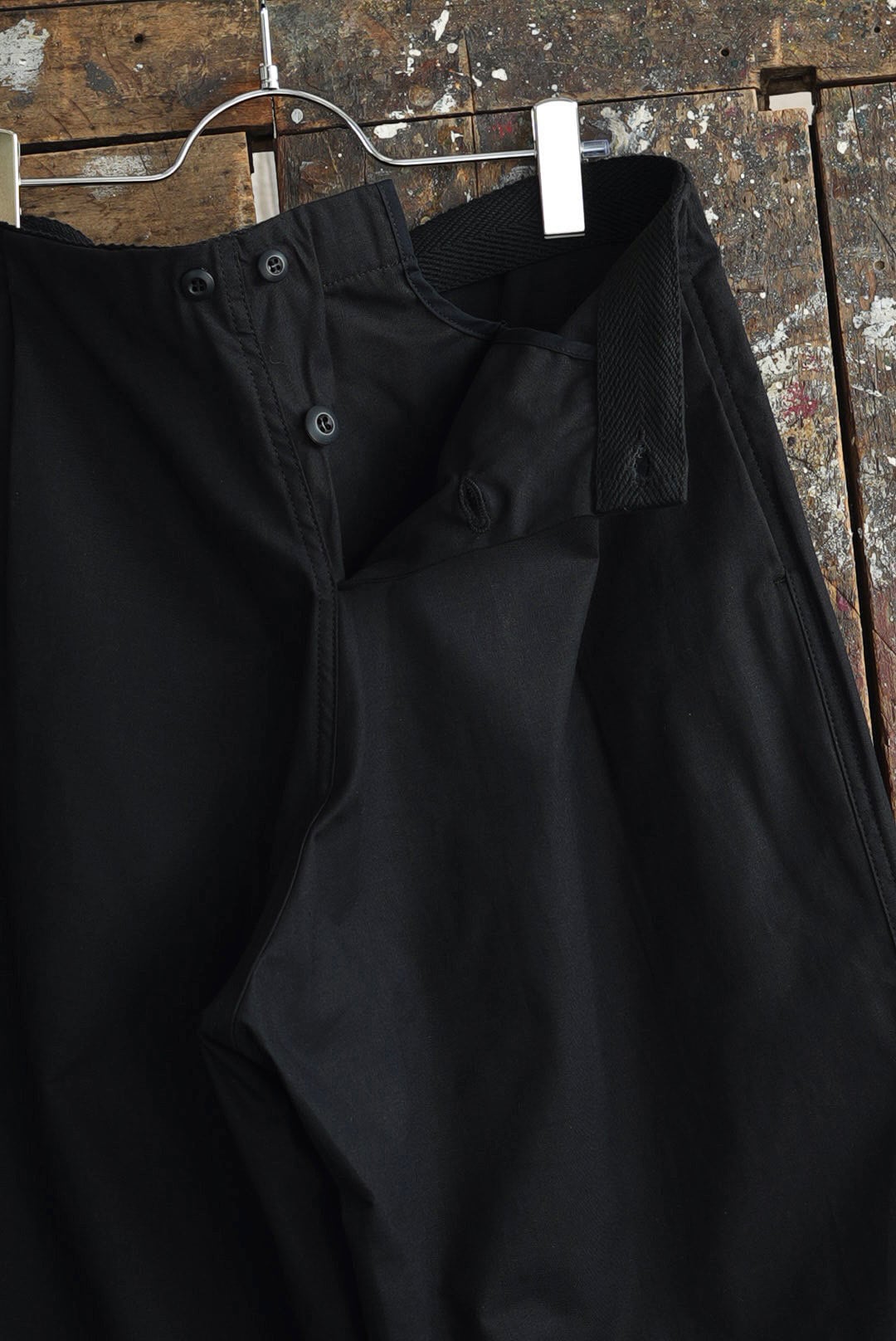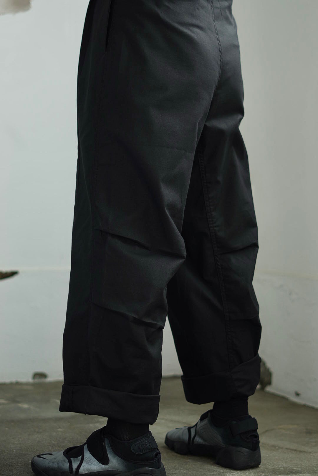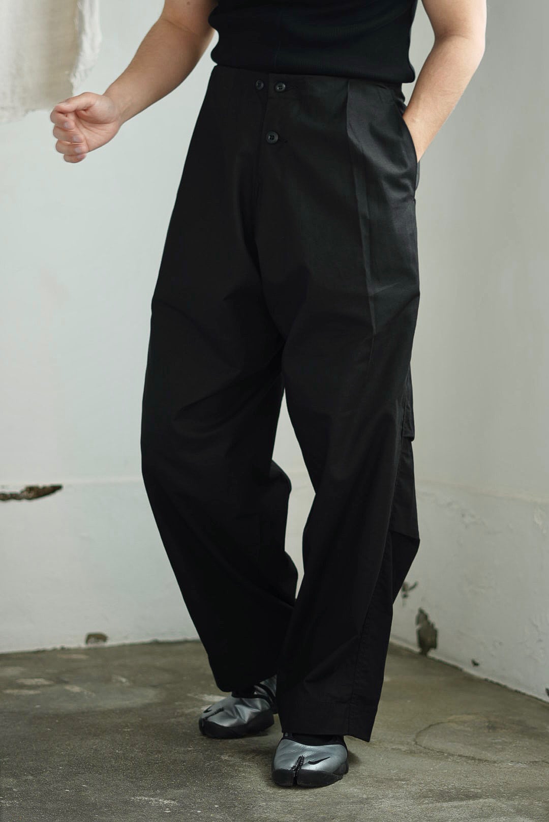 腰に引っ掛けて履く、バック・トゥ・フロントパターンのパジャマパンツ。前中心にアジャストボタン(約-4cm調整が可能)。糊をきかせた法被用の綿シーティング。裾の折り返しにてレングスバランスをとる、無限のスタイルを持ったデザイン。