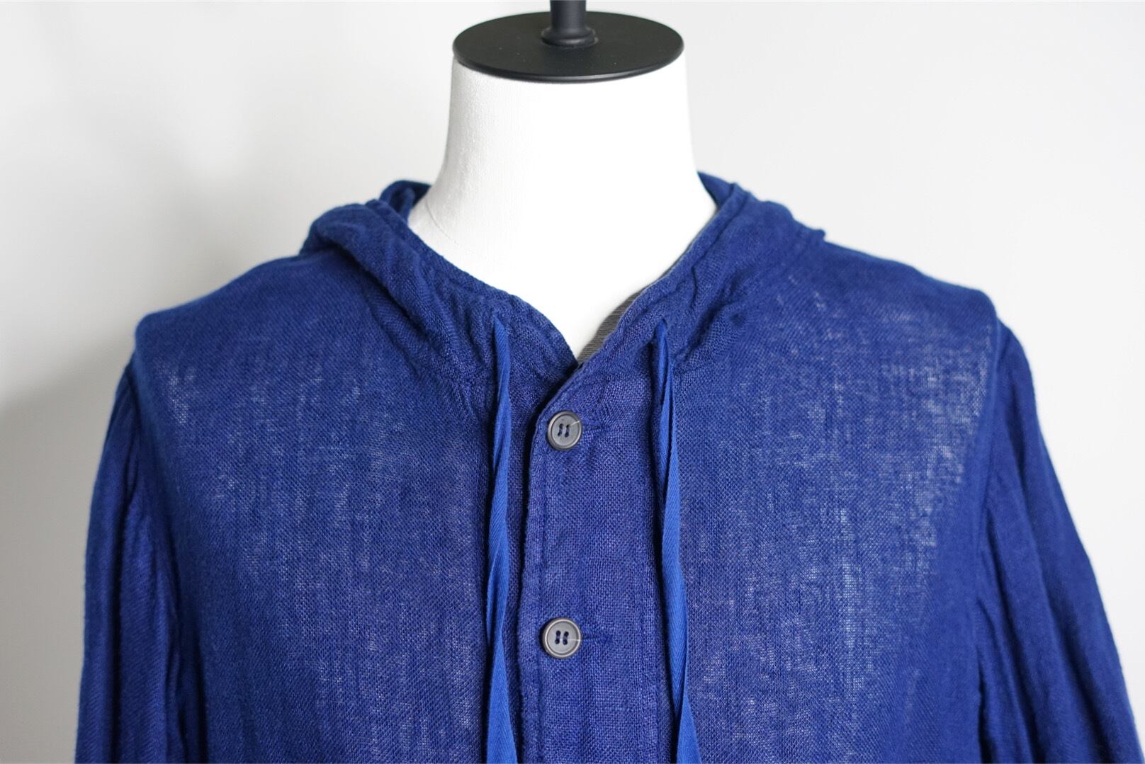 フレンチリネンにのせた真っ青なブルー、カバーオールまでは寄せないボタンのサイズ、やや大きめのパッチポケットは下位置に配置、軽さに加え下へと目線をそらし重厚感がうまれます。部分で効かせたヘリンボーンのドローコードがワークさを助長。フード周りや裾口は広く生地をとり、折り返しダブルステッチ。モードとワークと日常。上手くバランスの取れた洋服です。