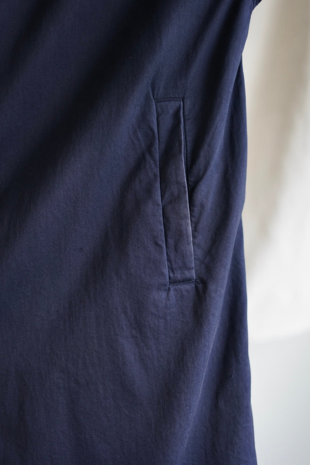 たっぷりとした身幅と肩幅、ステンカラーがベースですが肩肘の張らないコートです。落ちる肩のゆとりに加え広い身幅にすることで生地が溜まり動きが出ます。全体感をシンプルにデザインしながら、袖や裾口のダブルステッチ、少し大ぶりの天然ホーンボタンなどひと匙のアクセントを落とし込んだ巧妙なアイテム。