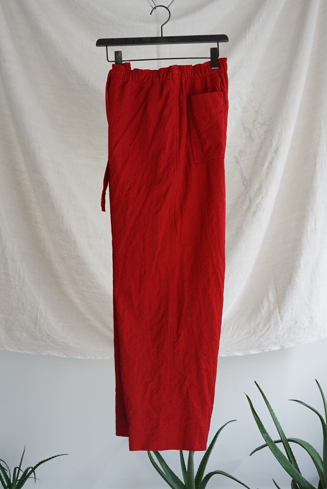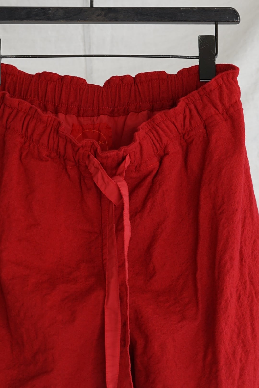 ソフトタッチなイタリア製、ボイルしたウール生地を使ったイージーパンツ。シルエットはストレート。比較的余裕のある股上は、腰位置に応じてパンツの印象を調整できます。ボイルし洗いざらした(製品染の工程を経て)凹凸のあるウール地はレッドカラーのケバケバしい要素を抑えた品を感じる染め上がりに。今回はキメの細かいイギリス製コットン生地を別注でフルライニングしました。ソフトなウールに裏地がつくことで、柔らかくもしっかりとした重厚感あるパンツです。ウエストはギャザー仕様。ドローコード付き。バックポケットのスクエア型はワークなテイストをディティールに盛り込みます。