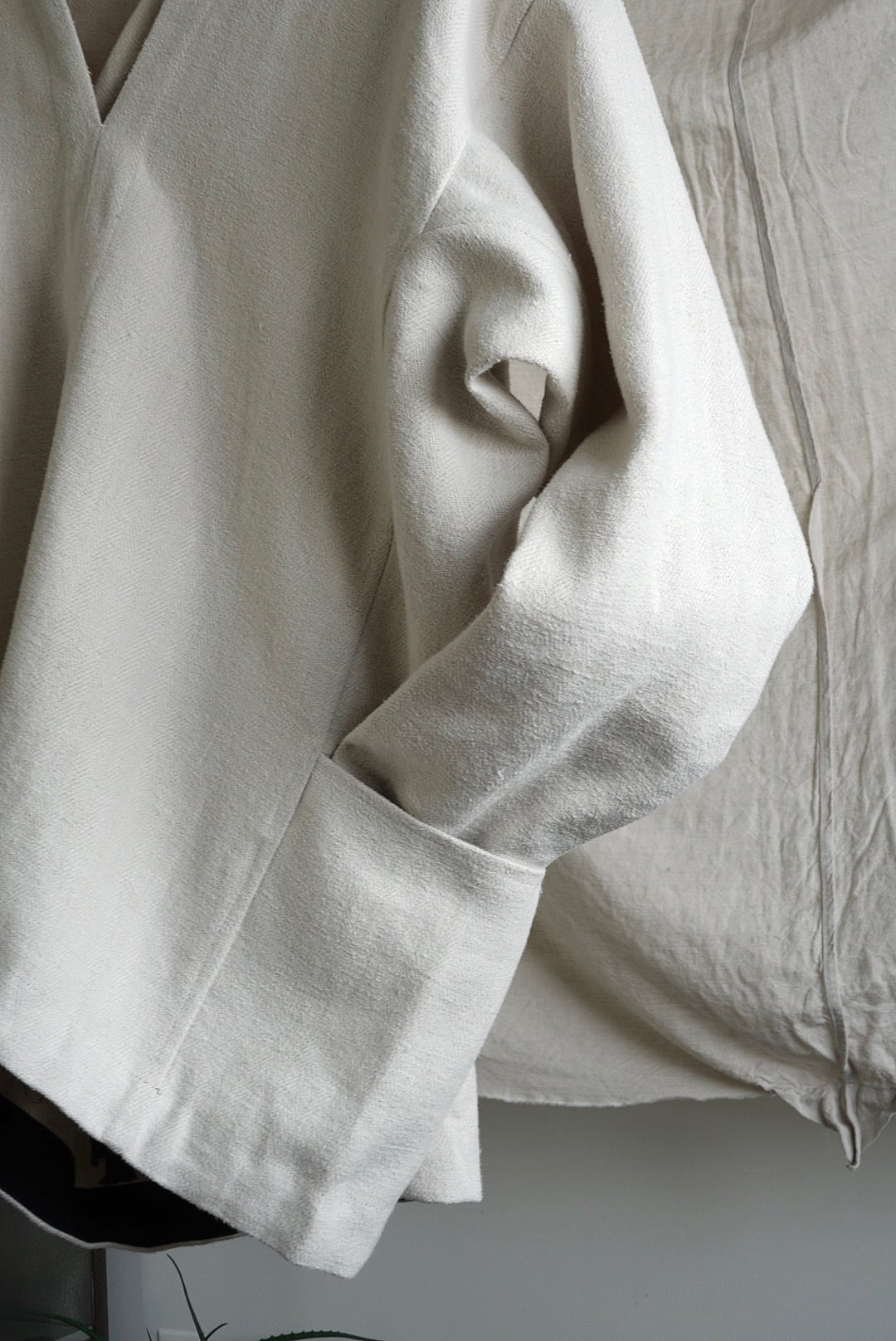 ブラッシュ(生地を掻くことで起毛を加える工程)した、日本製ヘリンボーンヘンプ生地を用いたSWEAT#56。上品なアイボリーカラー。アイヌ装束にルーツを持つ浅めのVネックデザイン。カジュアル、プリミティブ、モードなど多面的なエッセンスを織り交ぜたカジュアルウェアーです。ショート丈にやや広めの身幅、脇下にはガゼットクロッチのディティール。ユーティリティーなサイドポケットが付きます。裾ドローコードの調整で丸みをおびるシルエット変化まで楽しんでほしいアイテム。