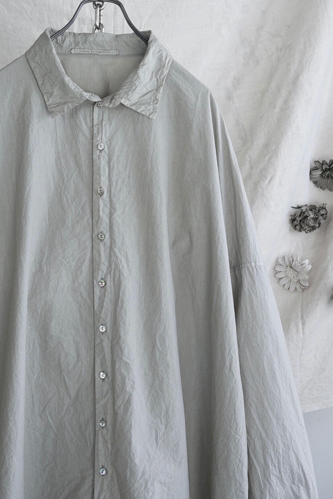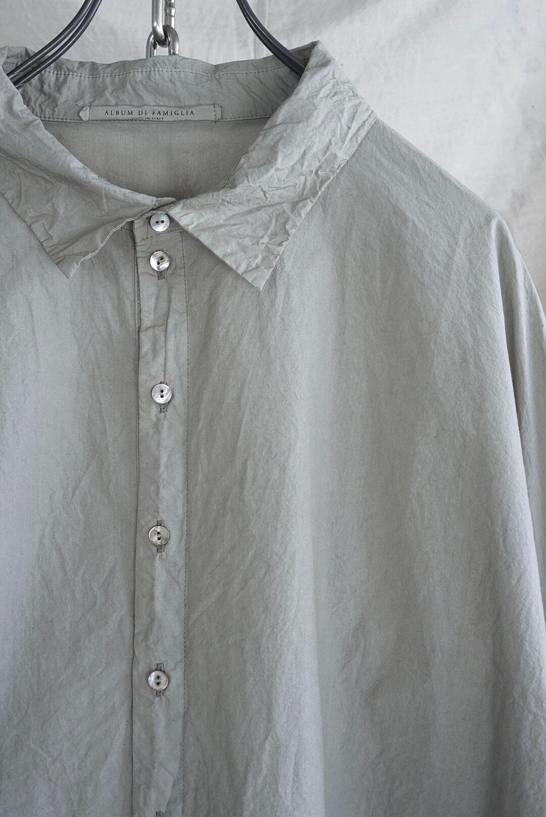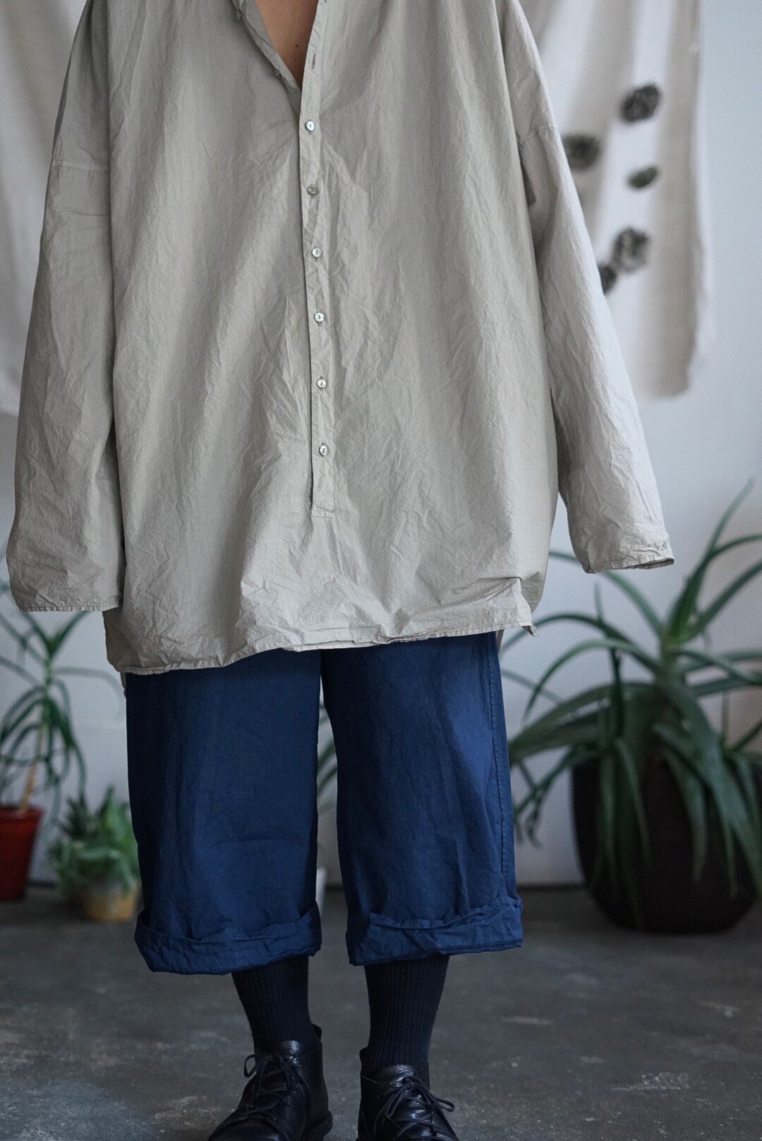 ドロップショルダーのルーズシルエットプルオーバー。シャリっけの強いドライタッチコットン。製品染めのストーングレイ。ディープにえぐれる10ボタンのフロントデザイン。細番手で打ち込み良い生地の皺が生み出す、色気さえ感じる表情。前後段違いのレングスにサイドスリットディティール。拘りを感じるシェルボタン。筒仕様のロンガースリーブを捲りバランスを作る楽しさを。