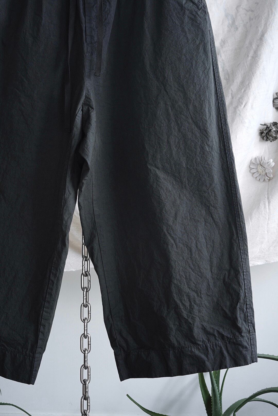 ワイドフィット&ややショートレングスのシンプルなトラウザーズ。リラックスなシルエットにモードな雰囲気が共存するアイテム。密度の高いハリのあるコットンファブリック。製品染めのチャコールカラー。大振りの外付けバックポケット。ウエストギャザー、ドローコード仕様。ユニセックス。