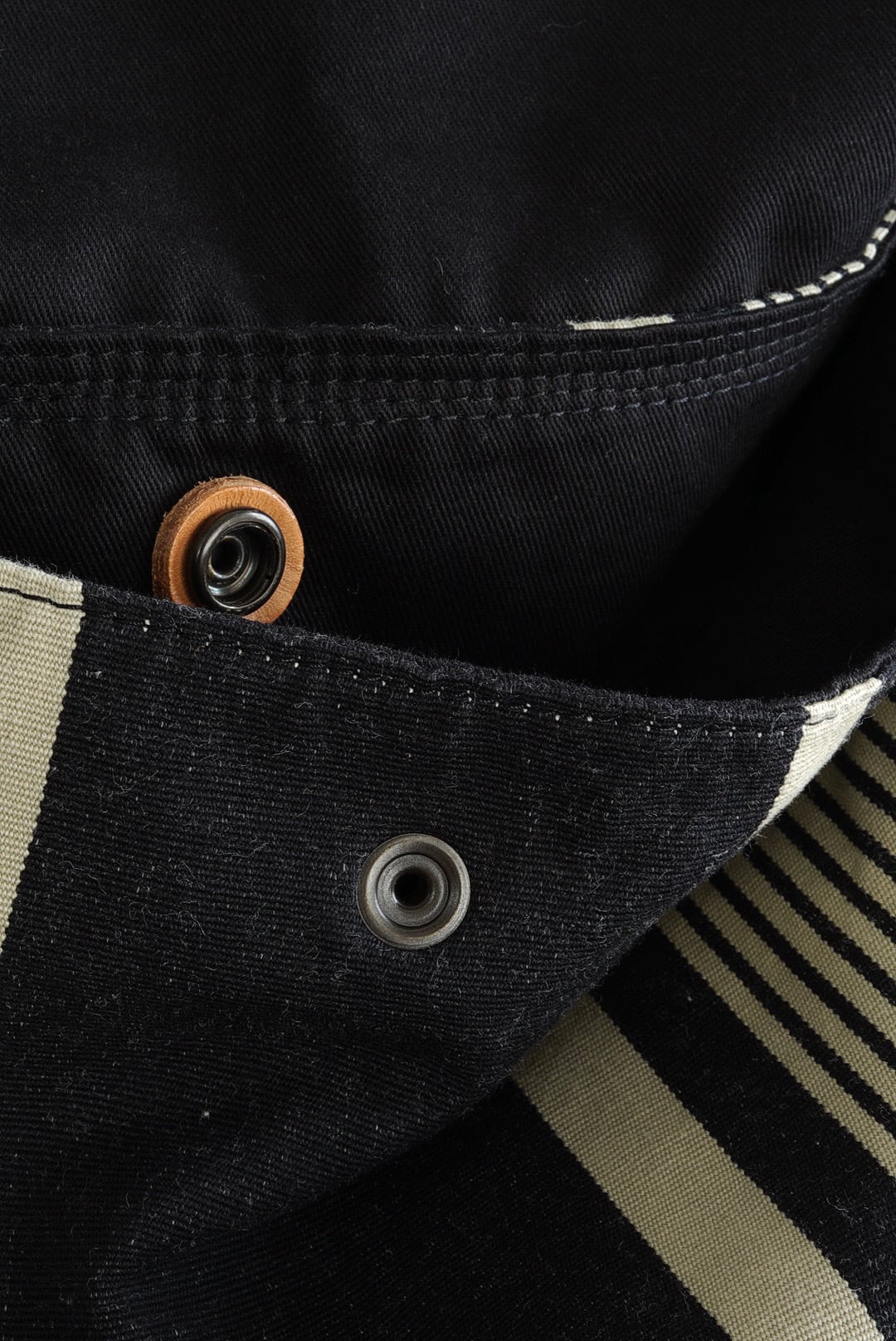 フレンチファブリックのメールバッグ。柔らかく爽やかなアクセントをもたらすマルチストライプ。フラップ仕様。上部にスナップ留め。内側にセパレートポケットとマルカンストラップ。
