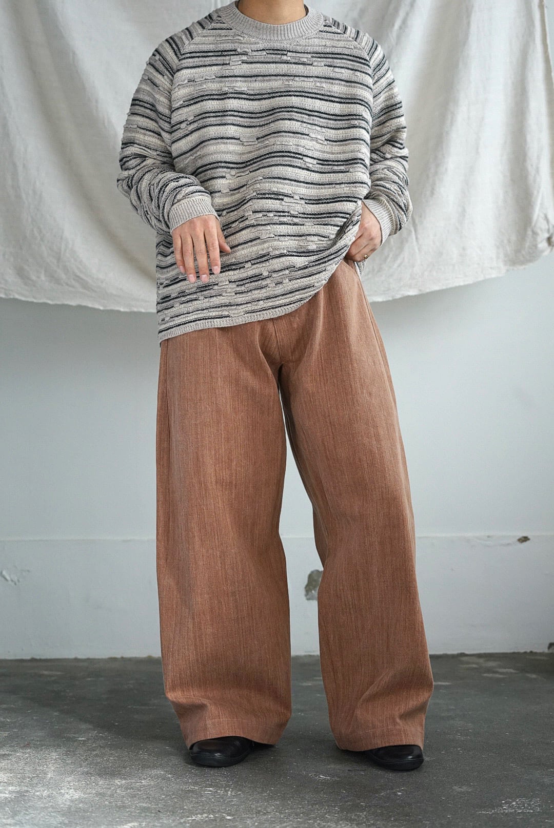 "PRĀNAコレクション"のアイコニックなファブリックを用いたTROUSERS#78。古くは平安時代から続く伝統的な天然柿渋染め。糸の段階から丁寧に時間をかけ染色をした先染め糸は、染料が芯まで浸透し深みのある染め上がりに。その後、柿渋染めの豊かな色合いの糸を縦糸に使用し岡山にてセルヴィッチの生地に。着用の年月を重ね、表情が移り変わる様子が楽しみなアイテムです。デザインはベーシックデニムスタイルを踏襲した6ポケットのオーセンティック。JJVEのシグネチャー、特徴的なアシンメトリーのフロントパターンに加え、シームレスのサイドと股部のガゼットクロッチディティールはリラックス感のあるナチュラルなシルエットを形成します。ボタンフライ/ベルトループ/インサイドドローコード付き。model : 174cm (wearing size M)