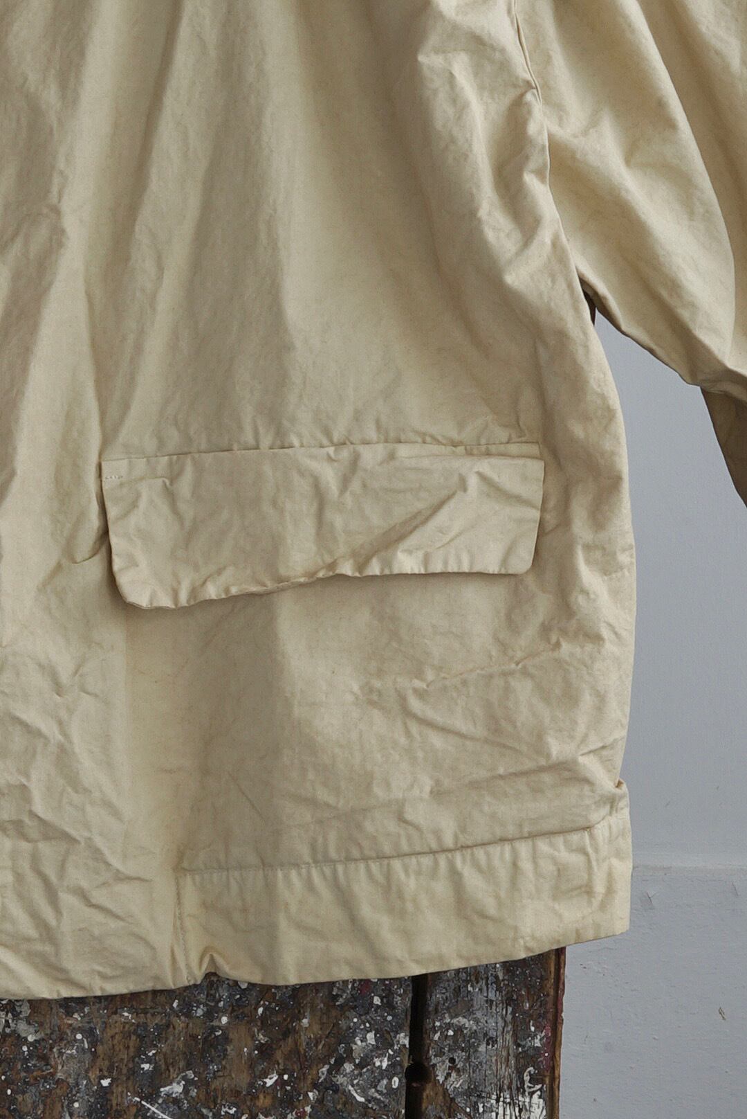 ドロップショルダーのスクエア型、5ボタンブレザージャケット。気取りのないリラックスした雰囲気の漂うライトウェアー。高密度でハリのあるコットンファブリック。製品染め、カジュアルとは違う品の良いクリームカラー。ミニマルなラペルデザイン。サイドはフラップポケット。センターベントディティール。ユニセックス。
