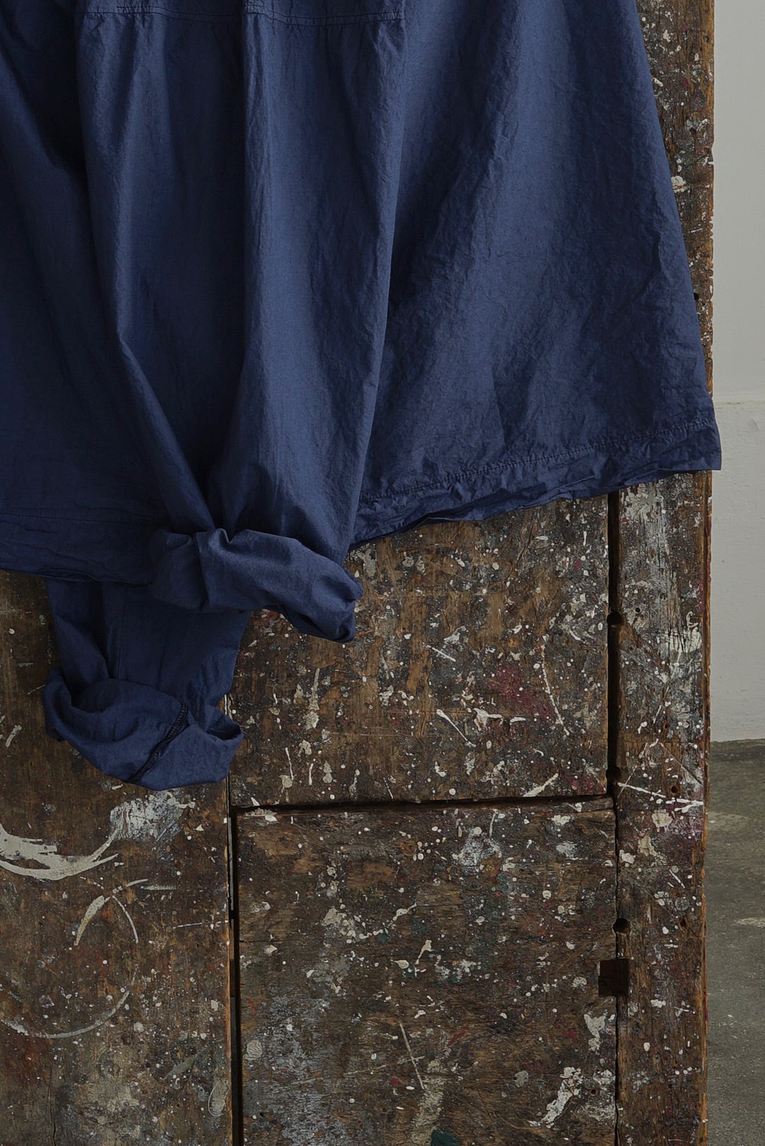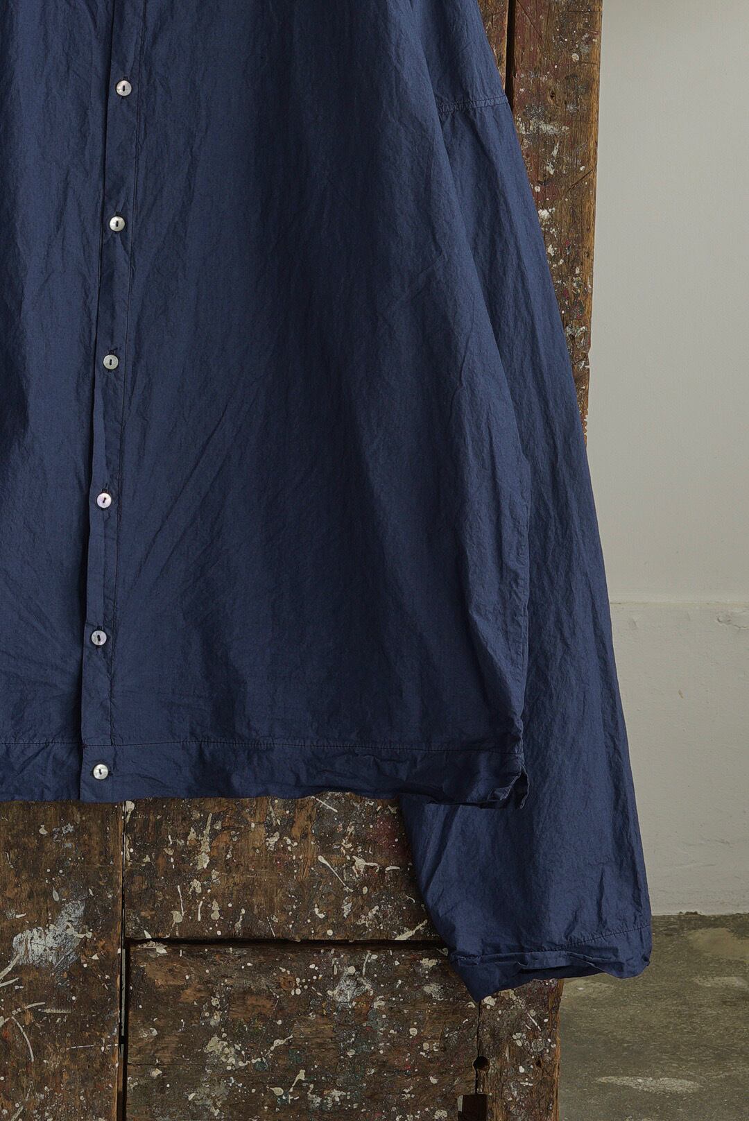 シンプルなドロップショルダーのデイリーウェア。清涼感を持つライトタッチなコットンファブリックを使用したシャツです。製品染めの柔らかなネイビーカラー。ナローな前立て、細番手で高密度生地の皺が生み出す、色気さえ感じる表情です。スクエア型のシルエットにサイドスリットディティール。拘りを感じるシェルボタン。筒仕様のロンガースリーブを捲りバランスを作る楽しさを。