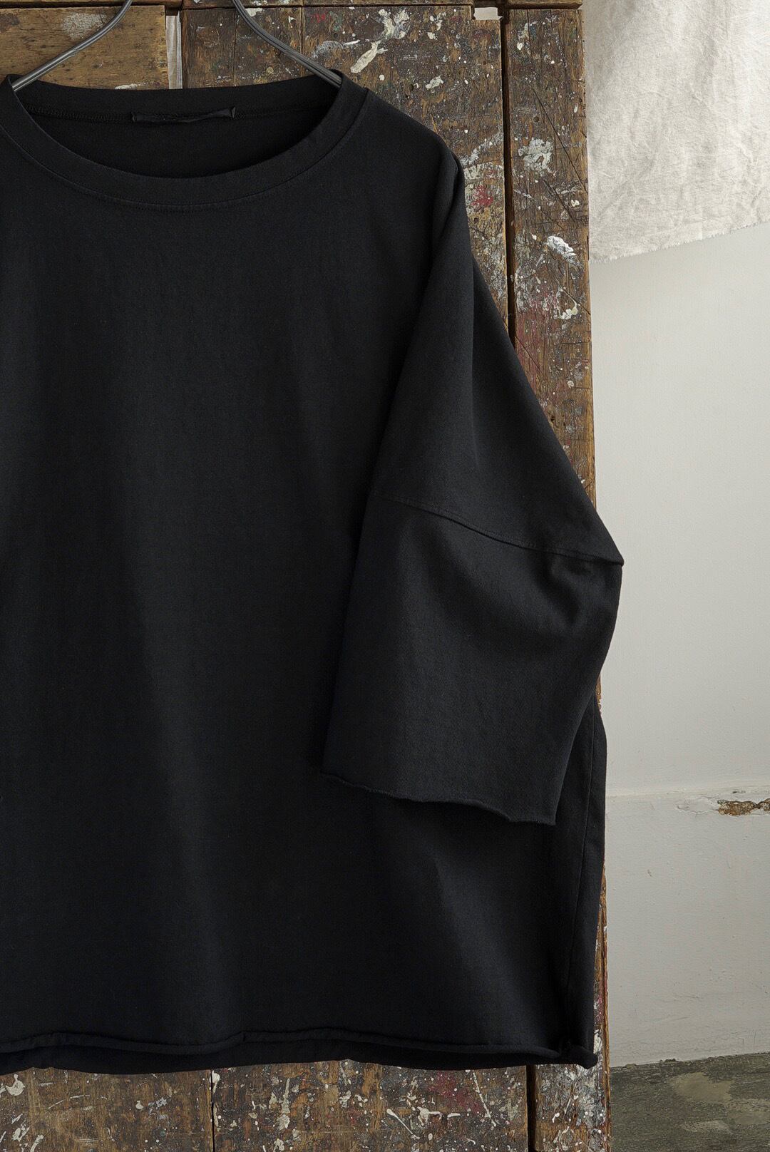 コシのあるコットンファブリックを使用したフットボールライクなティーシャツ。ボクシーシルエットとドロップショルダーディティール。製品染めの表情を持ったブラックカラー。切りっぱなし、ラフな未処理の裾が抜け感を生む、ナチュラルでどこかモードなカットソー。ユニセックス。