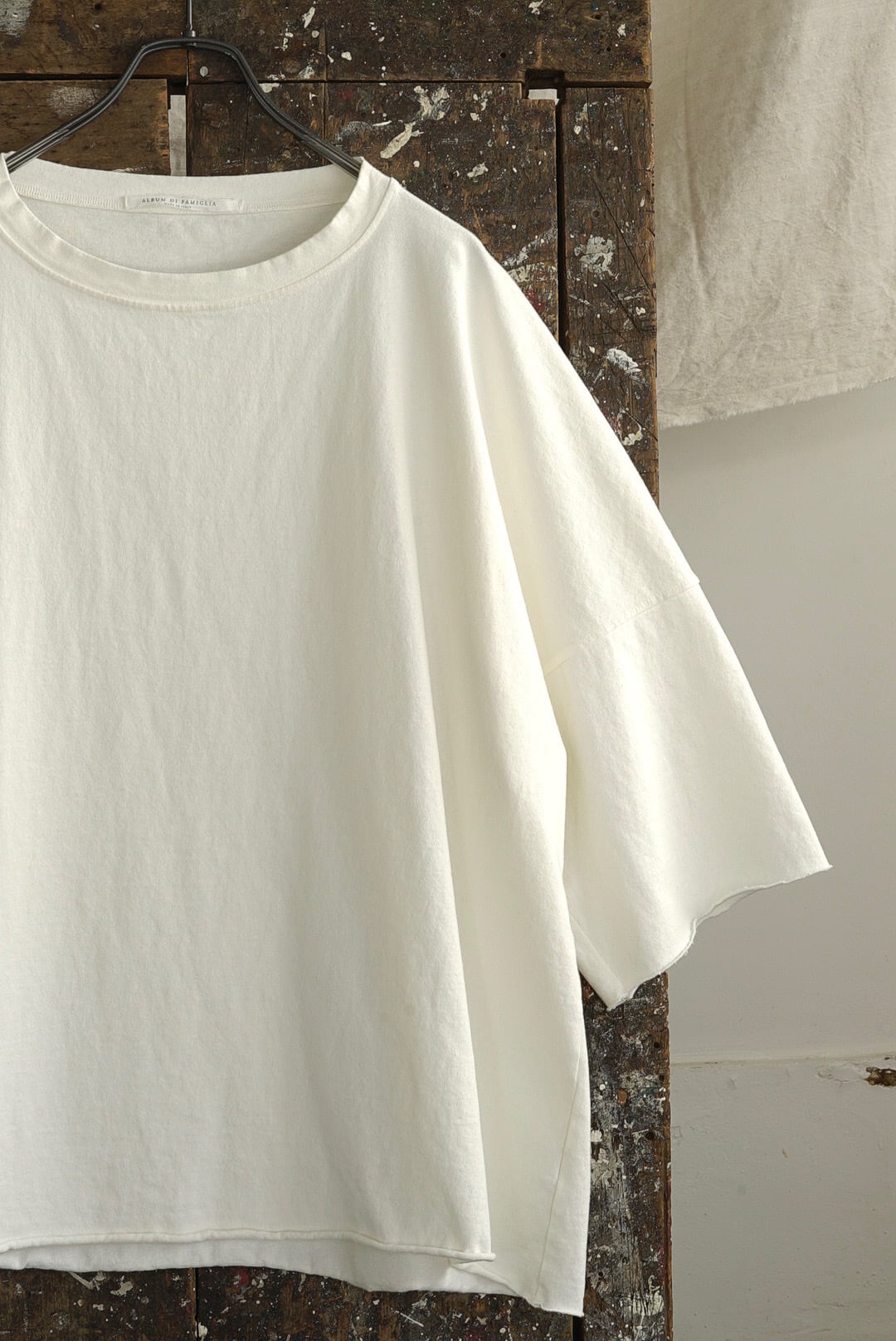 コシのあるコットンファブリックを使用したフットボールライクなティーシャツ。ボクシーシルエットとドロップショルダーディティール。ベーシックな使い勝手のよいミルクカラー。切りっぱなし、ラフな未処理の裾が抜け感を生む、ナチュラルでどこかモードなカットソー。ユニセックス。