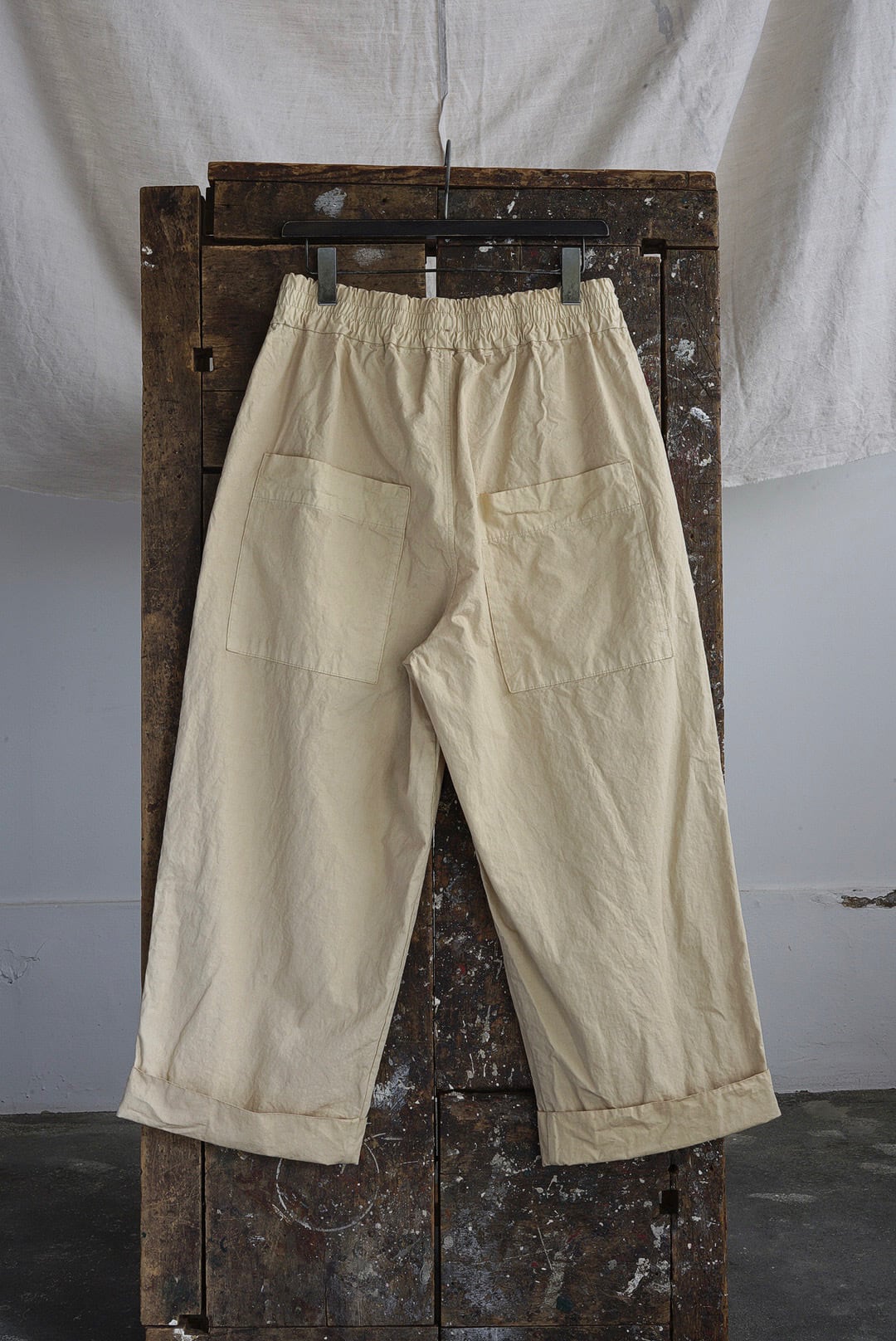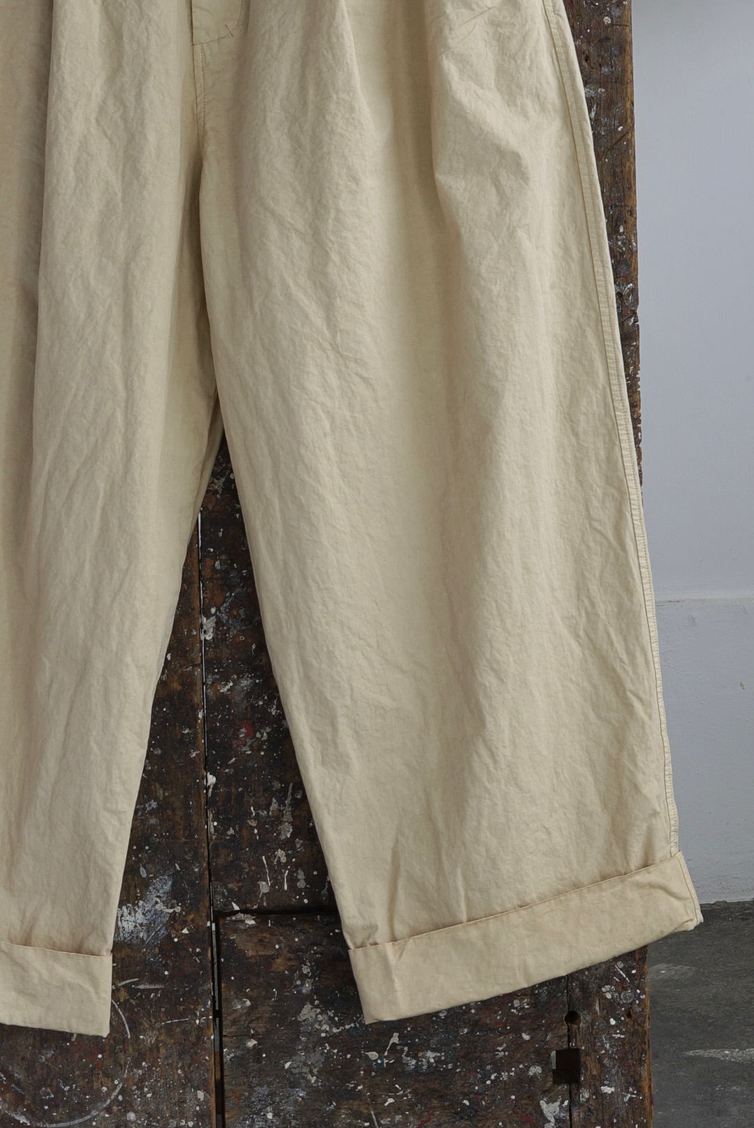 コレクションの中でレギュラーデザインの「BRAGONI」。ワイドフィット&僅かにショートレングスのシンプルなトラウザーズ。リラックスなシルエットにモードな雰囲気が共存するアイテムです。高密度でハリのあるコットンファブリック。製品染め、カジュアルとは違う品の良いクリームカラー。クラシカルなダブルの裾仕上げ。大振りの外付けバックポケット。ウエストギャザー&ドローコード仕様。ユニセックス。