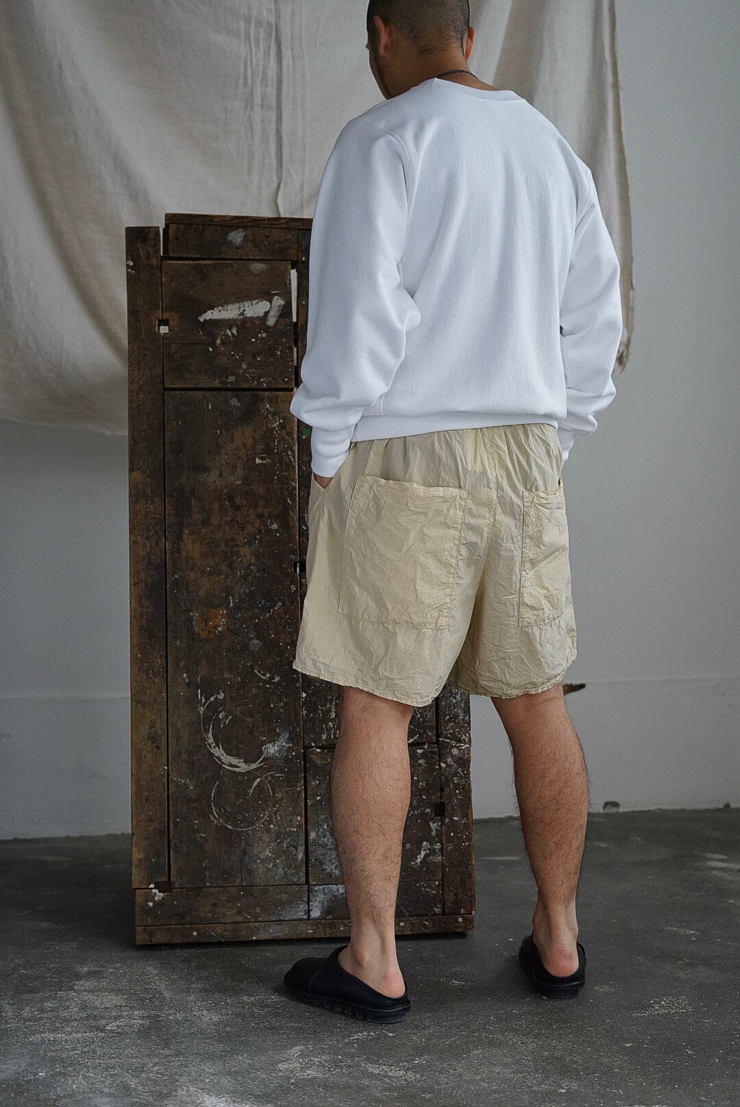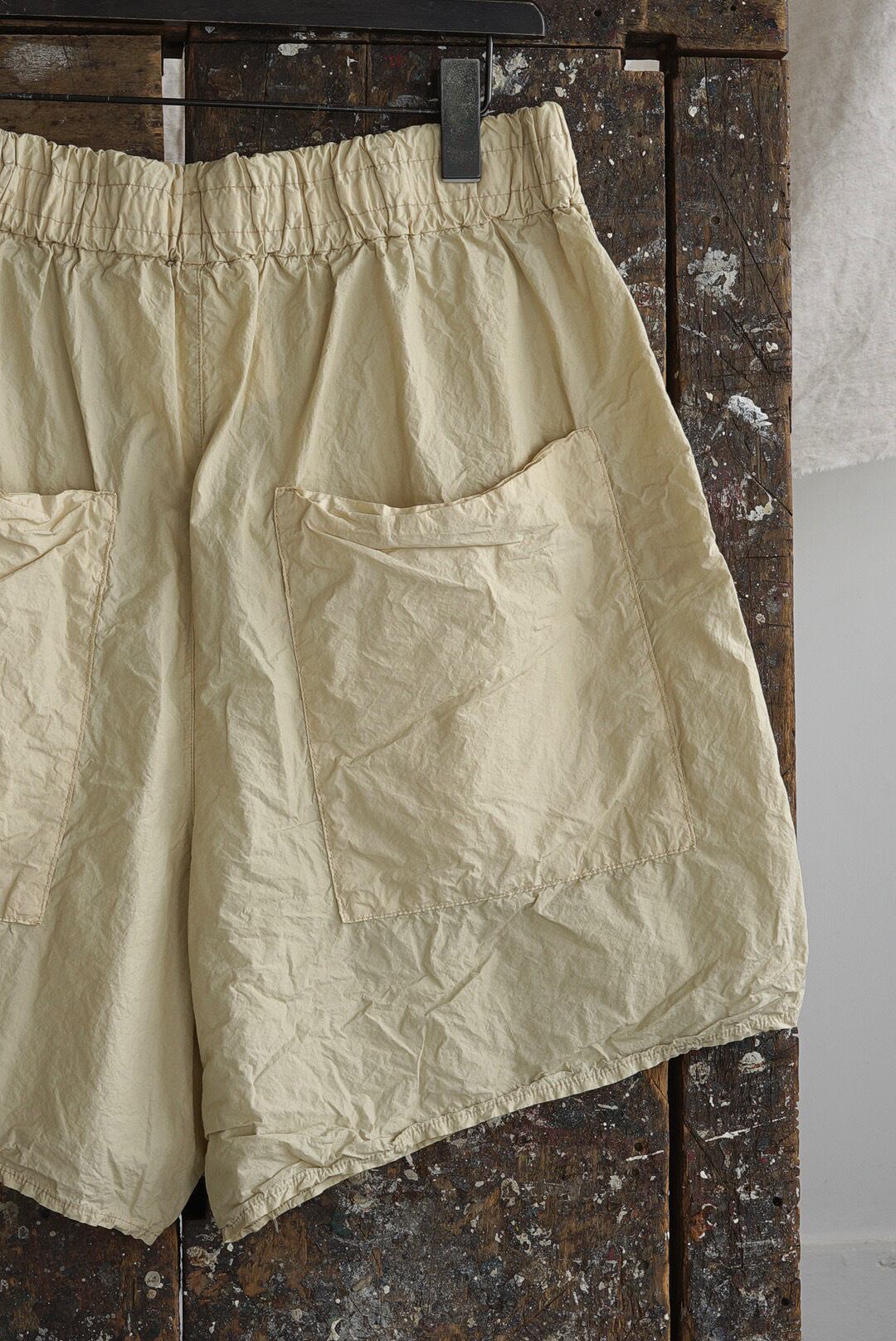 総丈の短いワイドショーツ。清涼感を持つライトタッチなコットンファブリック。製品染め、カジュアルとは違う品の良いクリームカラー。細番手で高密度生地の皺が生み出す、色気さえ感じる表情です。アンバランスなビックバックポケットのアクセント。モードさを演出するタタキ仕上げのミニマルな幅(5-7mm)。ウエストギャザー&ドローコード仕様。