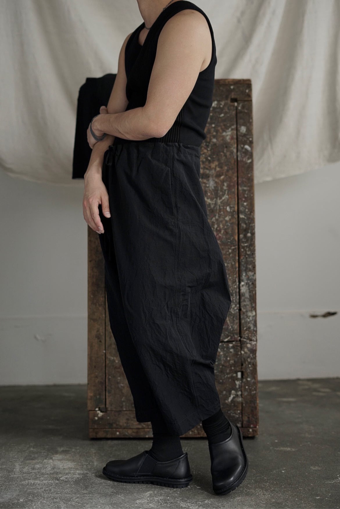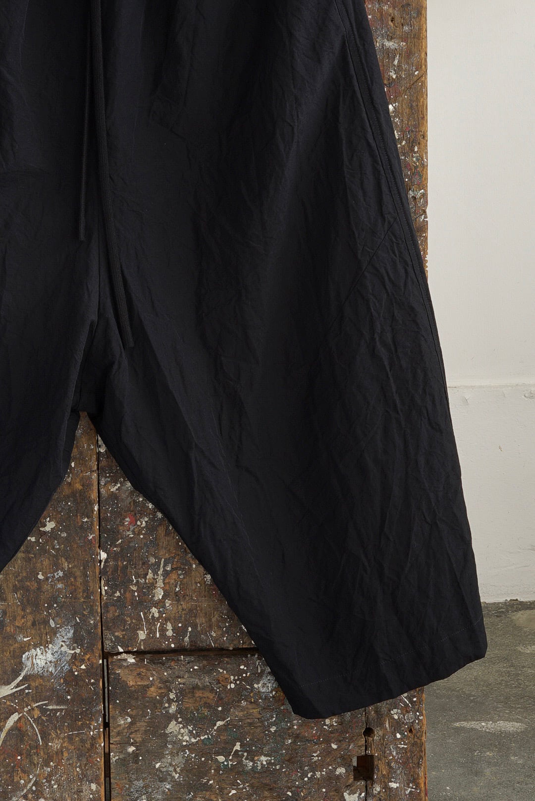 伝統的な民族衣装でもあるフィッシャーマンパンツをモディファイドしたクロップド丈。軽いタッチに張りのある素材感。シワを蓄えた凹凸のある表情のコットンリネンファブリック。極端に深い股とサイドから膝にかけてのダーツ。ミニマルに削いだデザインながら立体的な曲線美を見せます。ドローコードのみの無駄を排除したクリーンなウエスト周り。サイドポケット・バックポケット付き。