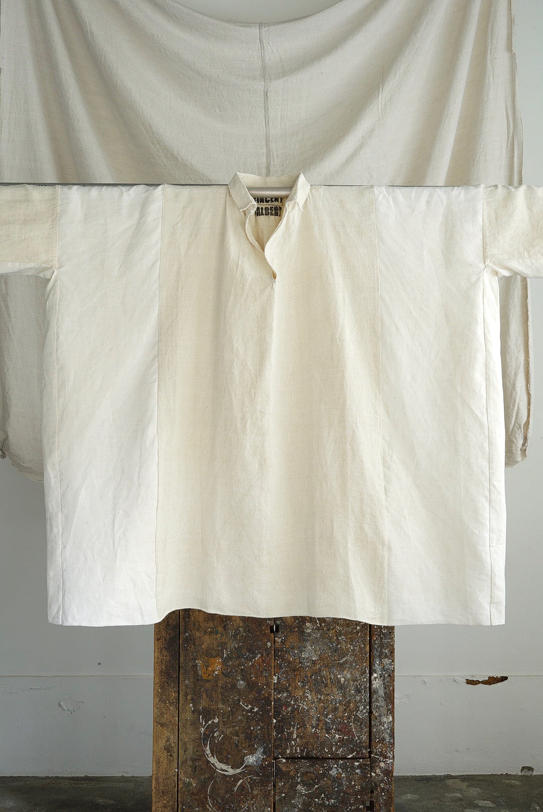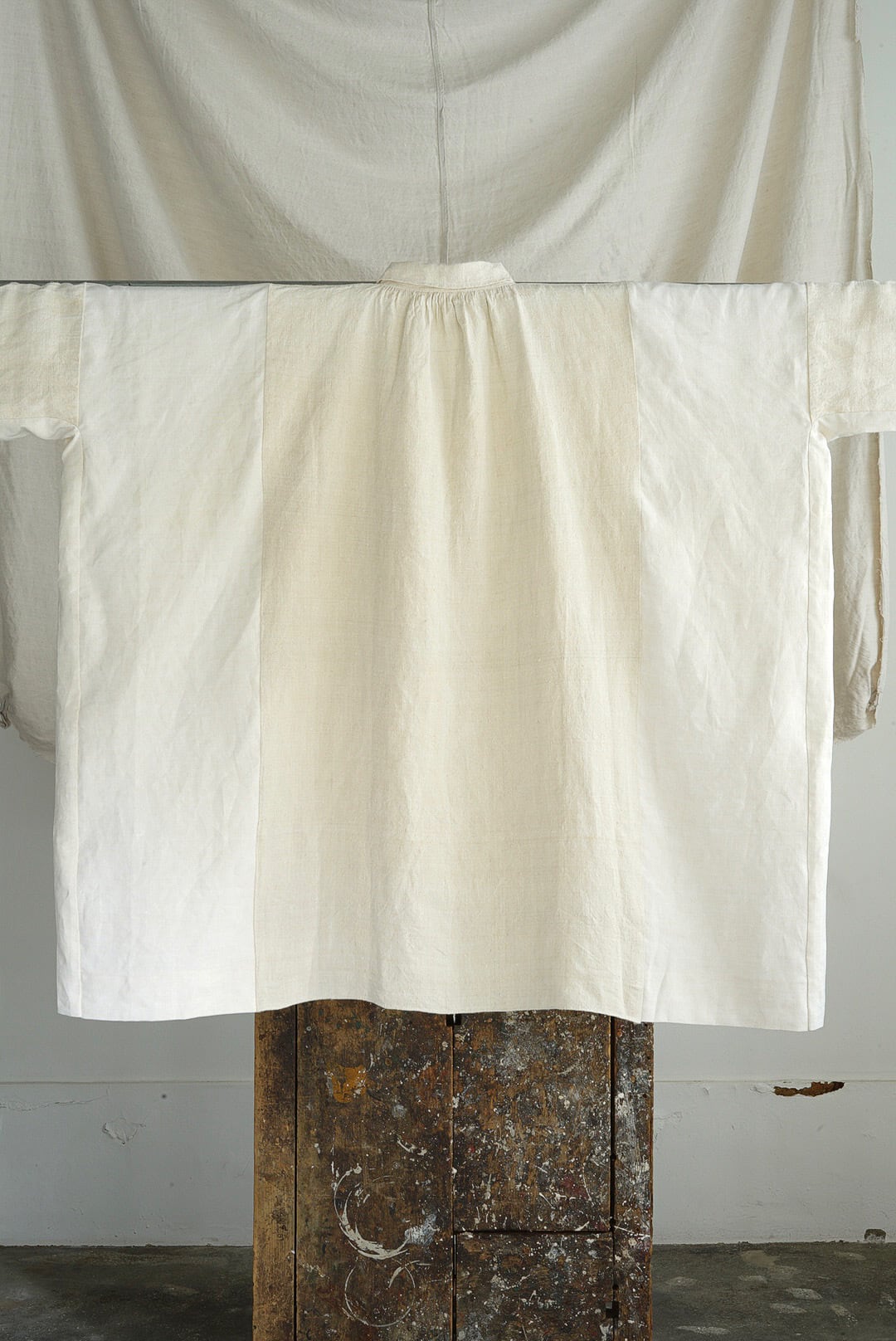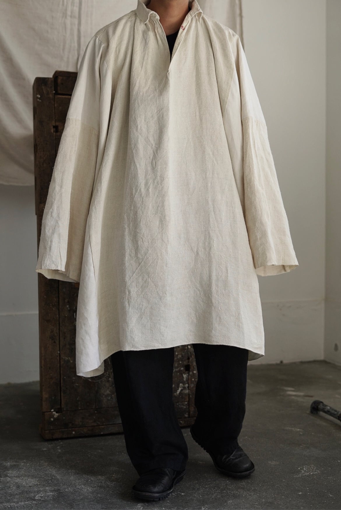 1900年代初頭のフレンチワーク、ファーマースモック(デッドストック)を再構築したエンラージシャツ。ボディからスリーブを切り離し、胴/袖にヴィンテージフレンチリネンファブリックをドッキング。弾力のあるファブリックが活かされドレープを生むモダンなオーバーシルエットに。大きく開いたスリーブヘムはざっくりロールアップし動きを作るのもオススメです。スモールカラーに特徴的な2ボタン。ボタンを開けるとスキッパーライクなデザインです。絶妙なポジションに"JP"のイニシャルが残ります。ネック周り無数の細かなギャザーがヴィンテージ故のディティール。未染色、ヴィンテージの表情をダイレクトに楽しめるナチュラルカラー。