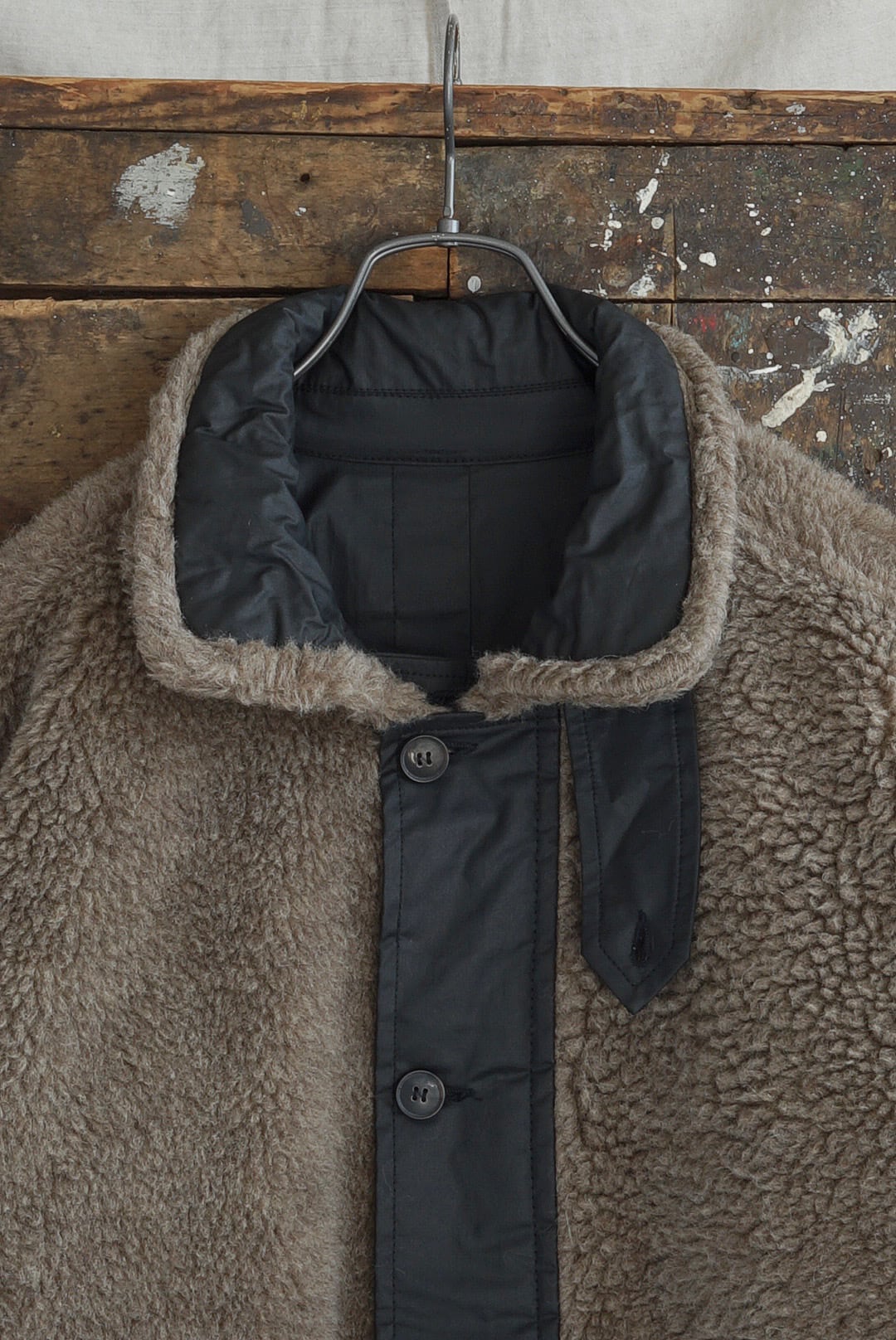 ミリタリーがデザインソースの「JACKET#57」。ナチュラルウール100%を使用した厚みのあるプリミティブなボアサイド / 撥水加工を施し光沢を帯びる軽量な着用感のオーガニックコットンファブリックサイド、高い保温力を備えるリバーシブルモデルです。スタンドカラースタイリングを強調する首元チンストラップは着脱式で両面に移行可能。ウォーターレジスタント面にはサイドアジャスターが付きます。セットインスリーブ、ゆとりを持ったベーシックシルエット。
