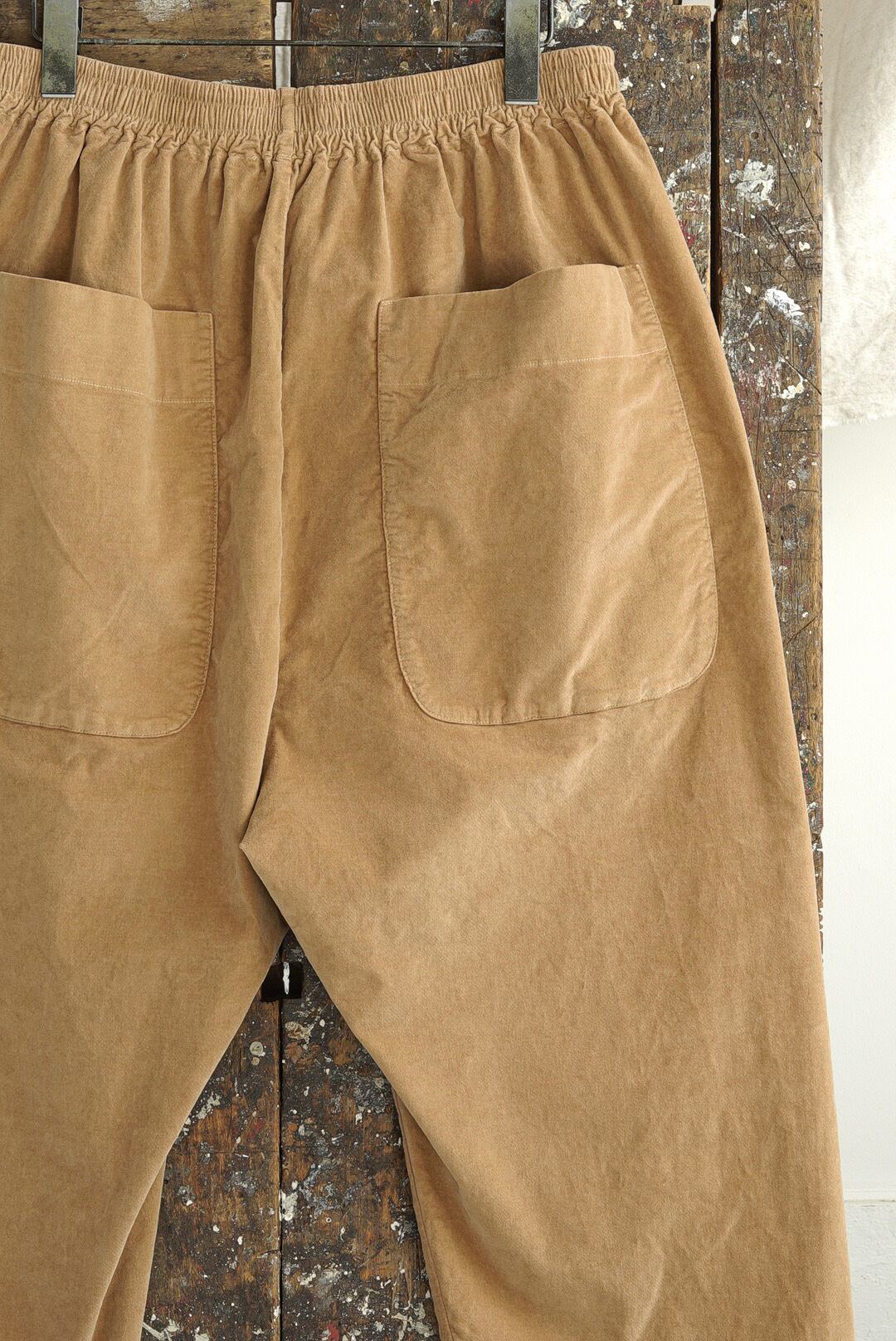テーパード × ミディアムリラックスシルエットにモードな雰囲気が共存するアイテム。コットンをベースに伸縮性を加えたベルベット素材。鈍い光沢と豊かな表情を纏う製品染め、"ザラメ"のようなシュガーカラー。腰周り内側の肌に接する部分にコットンの裏地、裾ワンロールにもコットン生地がアクセントとしてライニング。大振りの外付けバックポケット。ウエストは締め付けの少ないギャザーとドローコード仕様。ユニセックス。