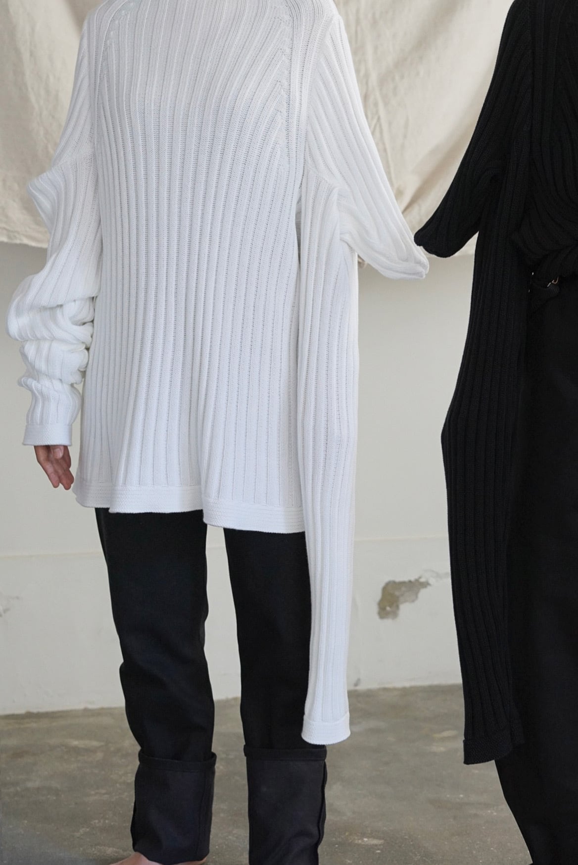 肉厚な編み地のコットンジャンパー。内側に窪ませて肩周りのディテールをかたどるユニークなニッティングデザイン。リブなしのスマートなネック周り。裾・袖口は編み地を変えた締め付けのないリブ。たっぷりと生地溜まりをつくるスーパーロングスリーブ。ユニセックス。
